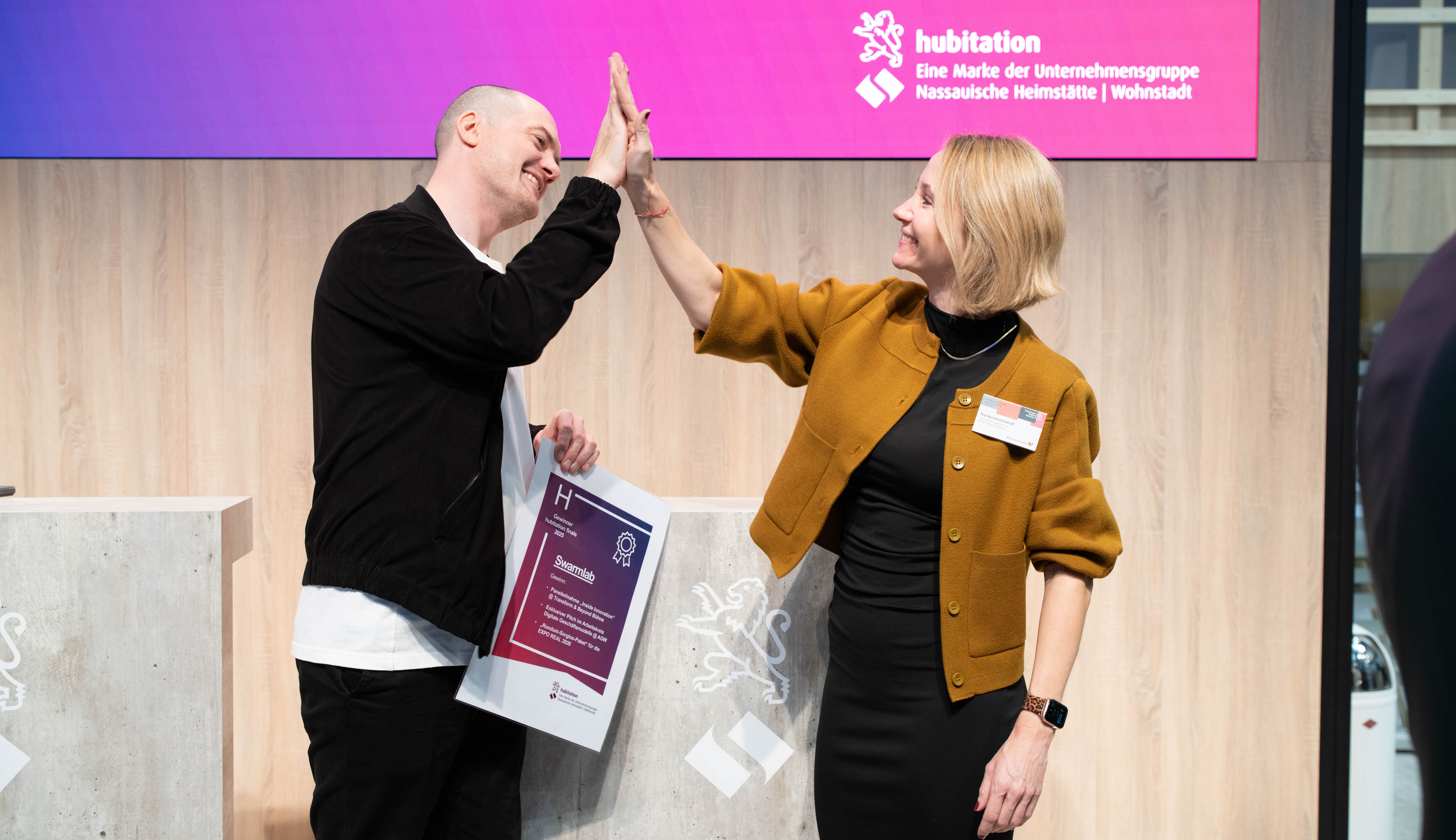 Frieda: Ein klares Ja in Capital Letters. Auf jeden Fall wäre es an der Zeit, mehr Startups zuzulassen, die nicht nur das klassische Immobilienportfolio oder den klassischen Immobilienzyklus bedienen. Das ist auch der Grund, warum viele Startups nicht zugelassen wurden, weil sie, zumindest ist das die Begründung der Messe, nicht in die Nomenklatur passen. Ich halte das für ein schwieriges Signal, weil ich glaube, dass ganz viele innovative Lösungen da draußen sind. Und der Kontakt muss ja irgendwie hergestellt werden zwischen der Branche und diesen Startups. Da die Expo auch für Vernetzung steht, denke ich, dass das eine verpasste Chance gerade zu diesem Zeitpunkt ist. Ich bin gespannt, ob im nächsten Jahr eine Veränderung kommt. Umso wichtiger ist es, dass wir mit hubitation unsere finals dort austragen, Startups mit uns auf die Bühne kommen und ihr Pilotprojekt vorstellen. Es ist also nicht das klassische Pitchdeck, sondern es geht darum, dass das Startup, das mit der NHW zusammenarbeitet, ein Pilotprojekt vorstellt. Ich denke, es müsste mehr Startups auf der Messe geben, und zwar nicht in der letzten Halle mit kleinen Ständen. Außerdem bin ich überzeugt davon, dass die alle eine Bühne brauchen, auf der es noch mehr um das Produkt und das Zusammenfinden zwischen Branche und Startups geht.