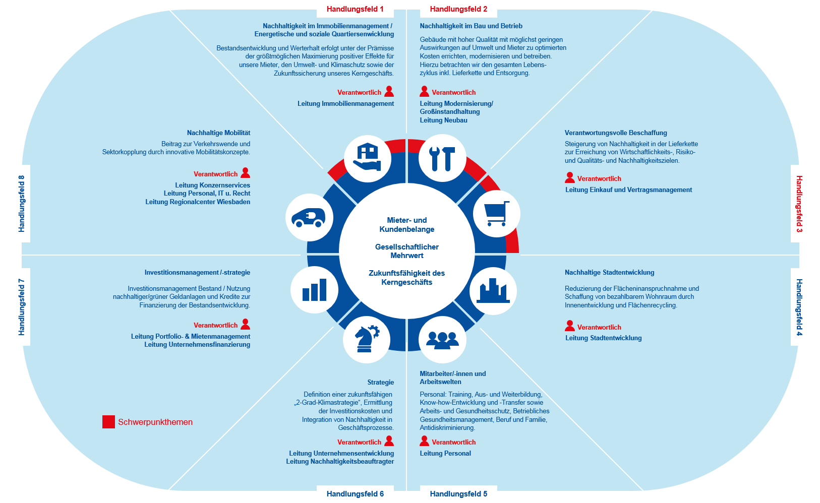 Im Rahmen ihrer planmäßigen Fortschreibung der Nachhaltigkeitsstrategie hat die Unternehmensgruppe Ziele, Handlungsstränge und Maßnahmen definiert und in acht Handlungsfelder inkl. drei Schwerpunktthemen verortet. Somit werden alle Themen in relevante Geschäfts- und Unternehmensbereiche integriert. Die Verantwortung für die Handlungsfelder trägt die Lenkungsgruppe Nachhaltigkeit. Sie bleibt weiterhin das zentrale Beratungsgremium und überprüft in einem vierteljährlichen Turnus die Fortentwicklung und Umsetzung der Strategie. Klar definierte Handlungsfeldverantwortliche fungieren zudem als fachliche Ansprechpartner und stellen die Umsetzung der beschlossenen Ziele und Maßnahmen der Handlungsfelder bereichsübergreifend sicher.