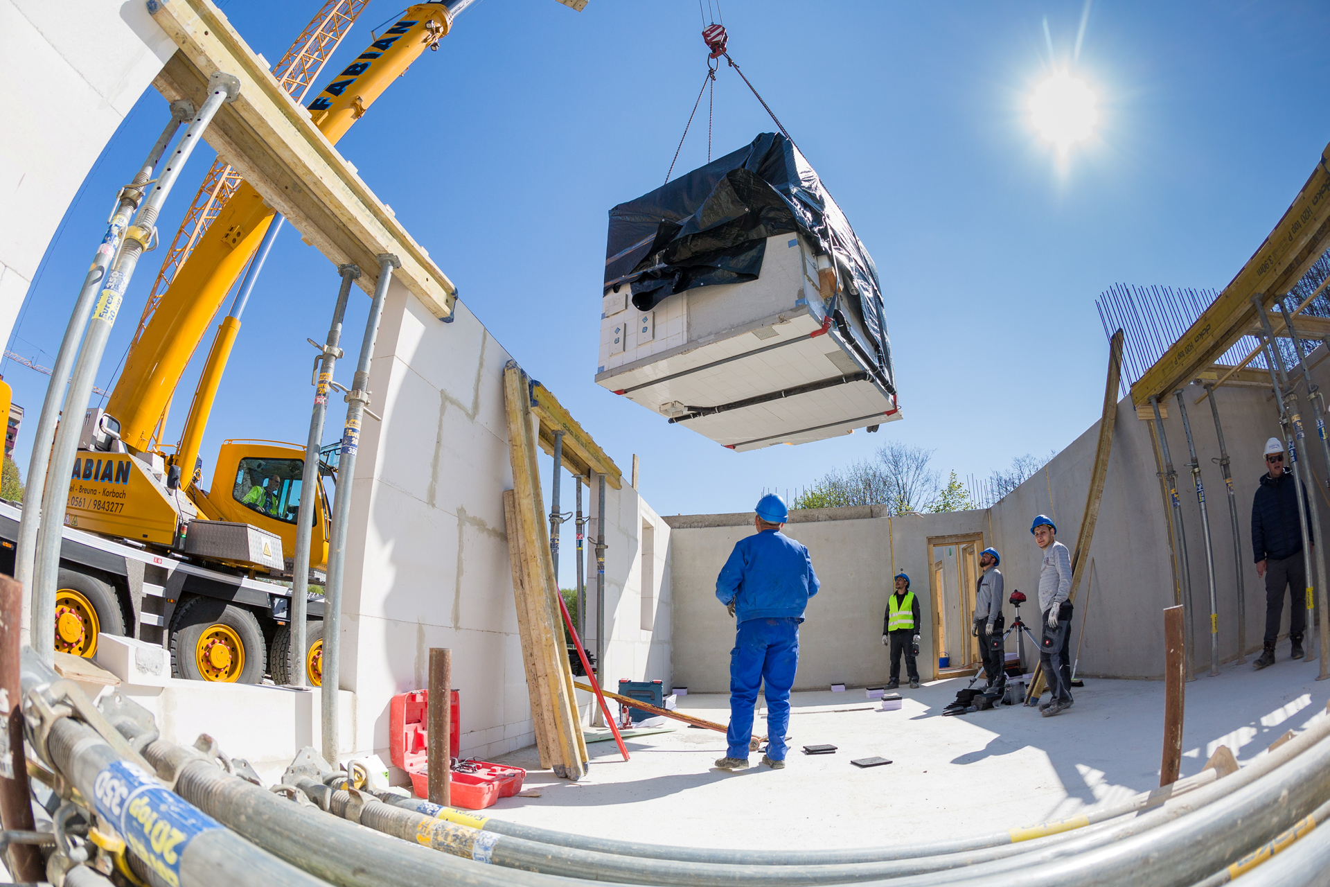 Modulares Bauen, wie wir es praktizieren, bedeutet, möglichst viele Elemente einheitlich und wiederkehrend zu verwenden. Denn je öfter das gleiche Bauteil im Werk gefertigt wird, desto einfacher sind Herstellung und Montage. Das beginnt bei den Fenstern, die möglichst oft und einheitlich geplant werden, und reicht bis hin zu kompletten Fertignasszellen, wie sie im Projekt Fasanenhof in Kassel zum Einsatz kamen. Jede einzelne Zelle kam mit eingebauter Tür und vorgefertigten Anschlüssen auf die Baustelle und wurde an ihrem Bestimmungsort eingebaut. Diese Idee wurde auch in der Fritz-Kissel-Siedlung in Frankfurt umgesetzt. Hier schuf die NHW durch Aufstockung in Modulbauweise 82 neue Wohnungen.