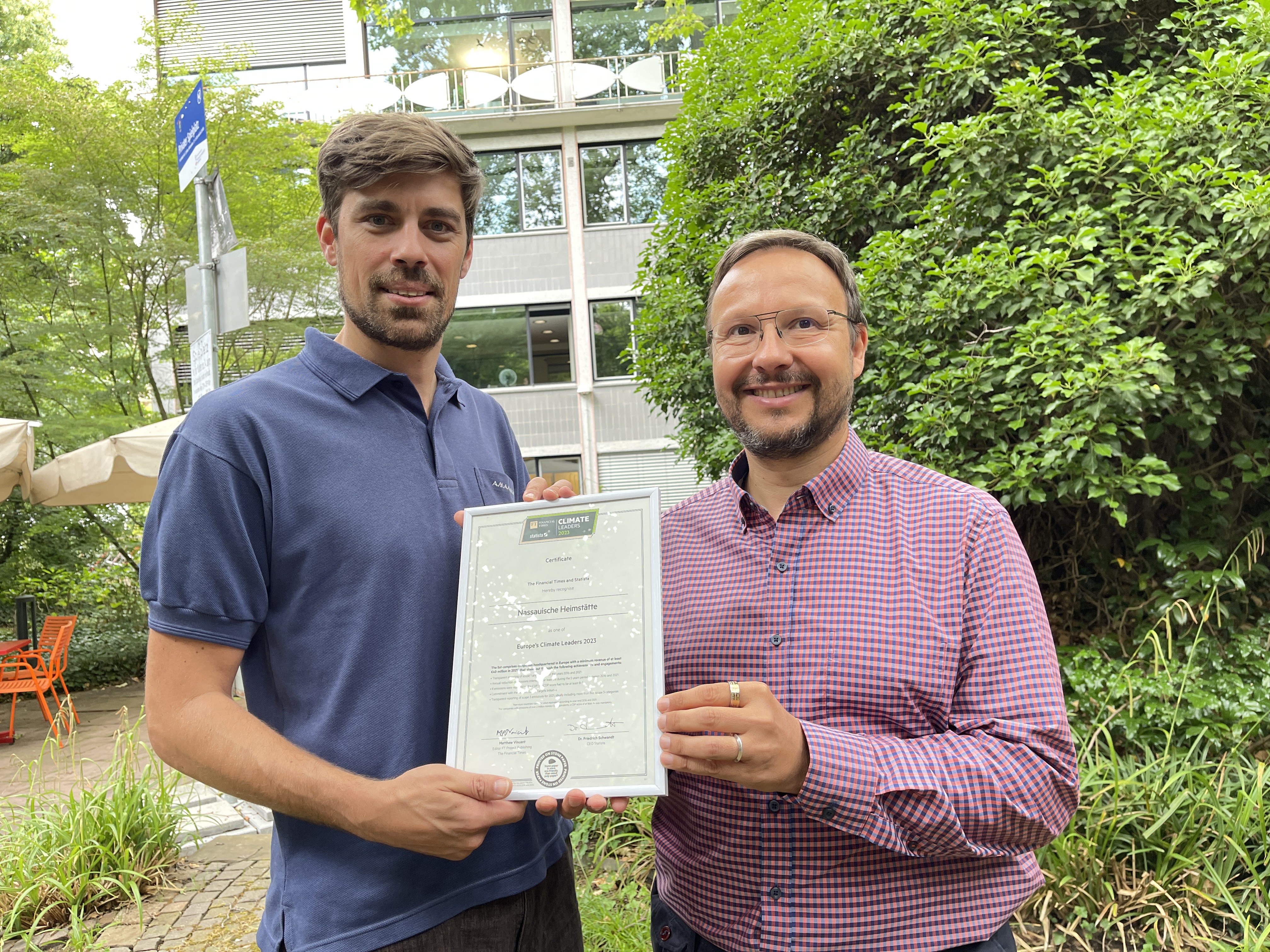 Wir sind European Climate Leader: Die Nachhaltigkeitsbeauftragten Felix Lüter (re.) und Gregor Steiger präsentieren die Urkunde. Foto: NHW