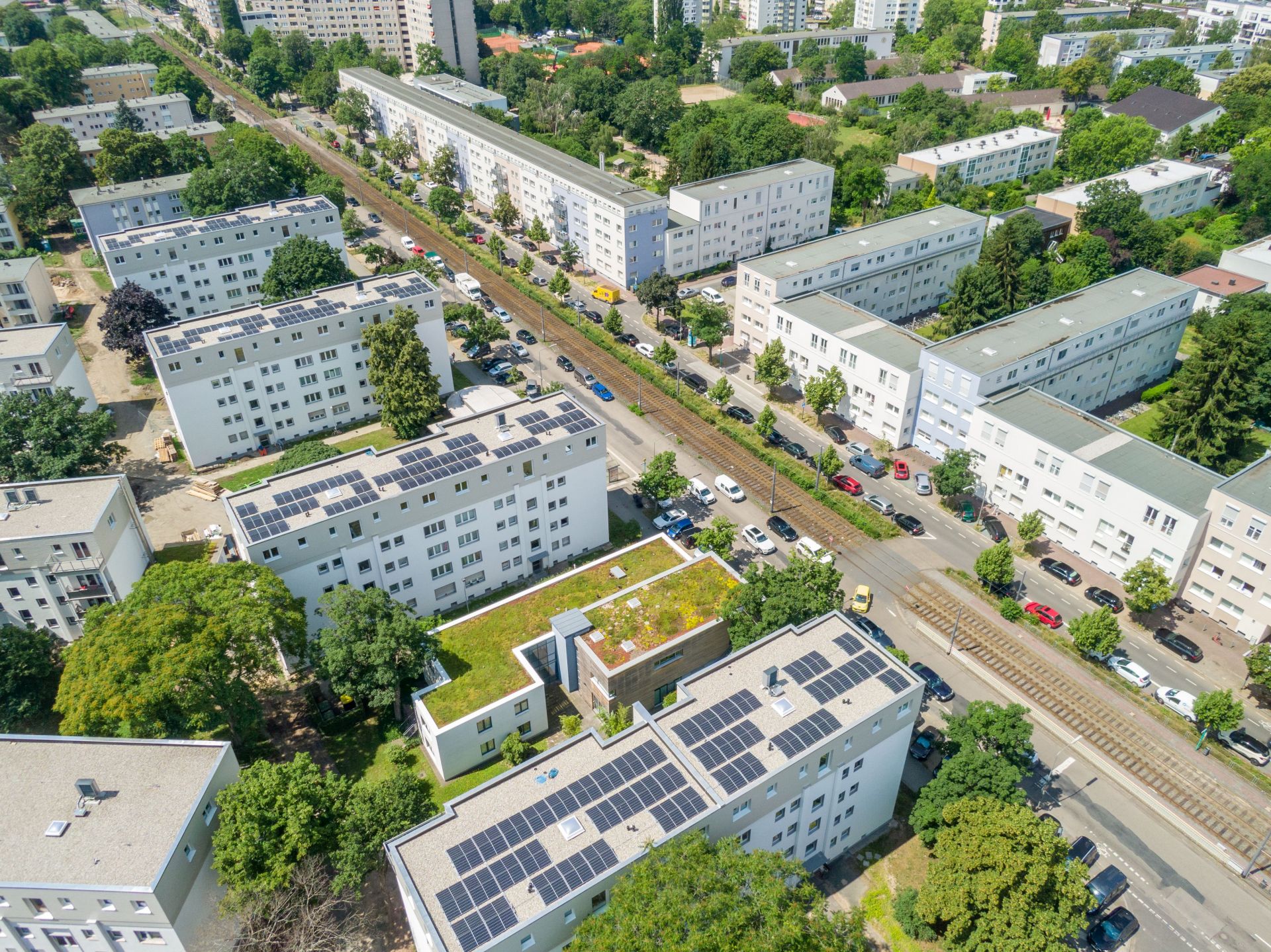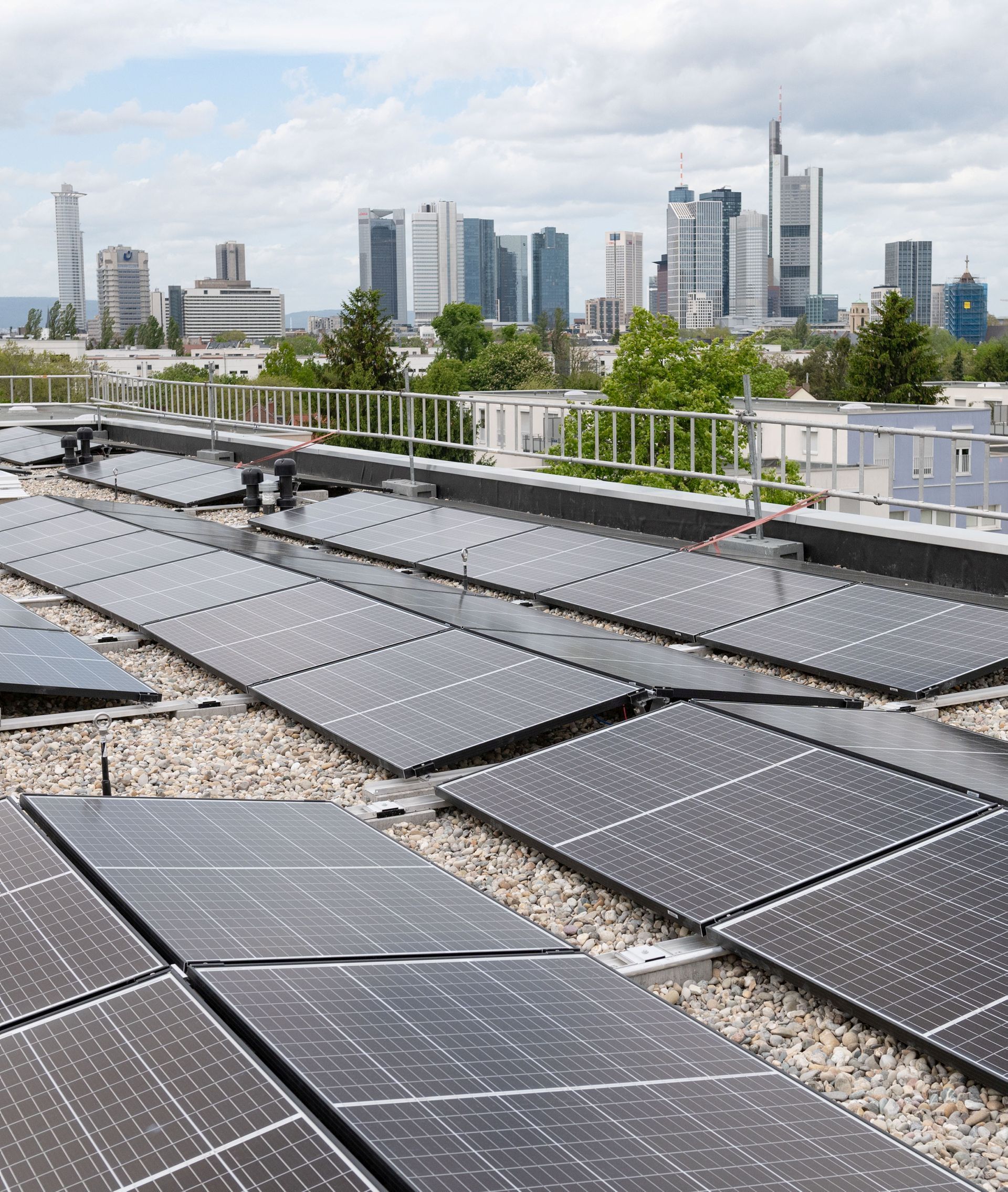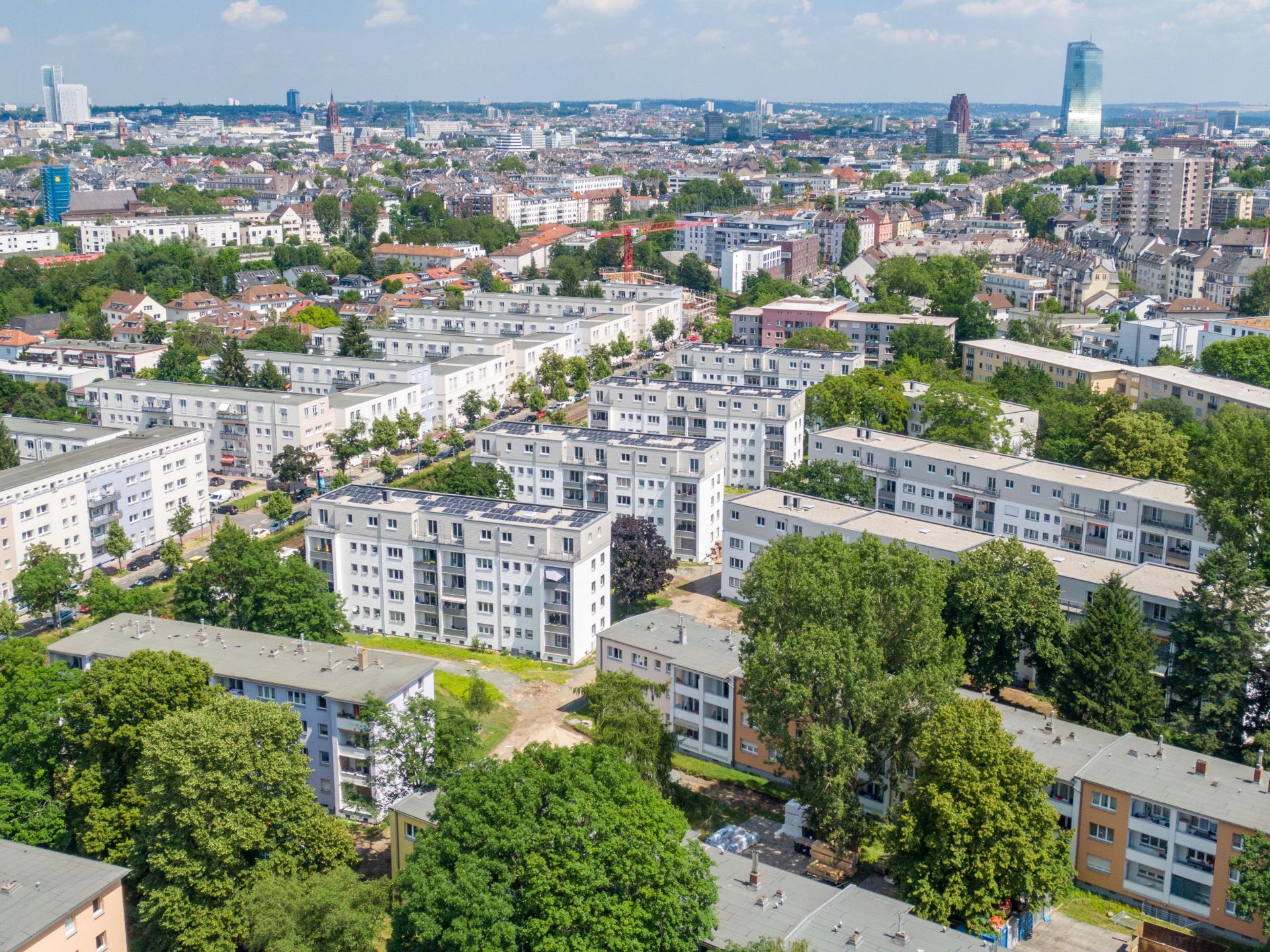 Über den Dächern der Fritz-Kissel-Siedlung: NHW und Mainova haben hier ihr bislang größtes gemeinsames Mieterstromprojekt umgesetzt. Foto: NHW / Marc Strohfeldt
