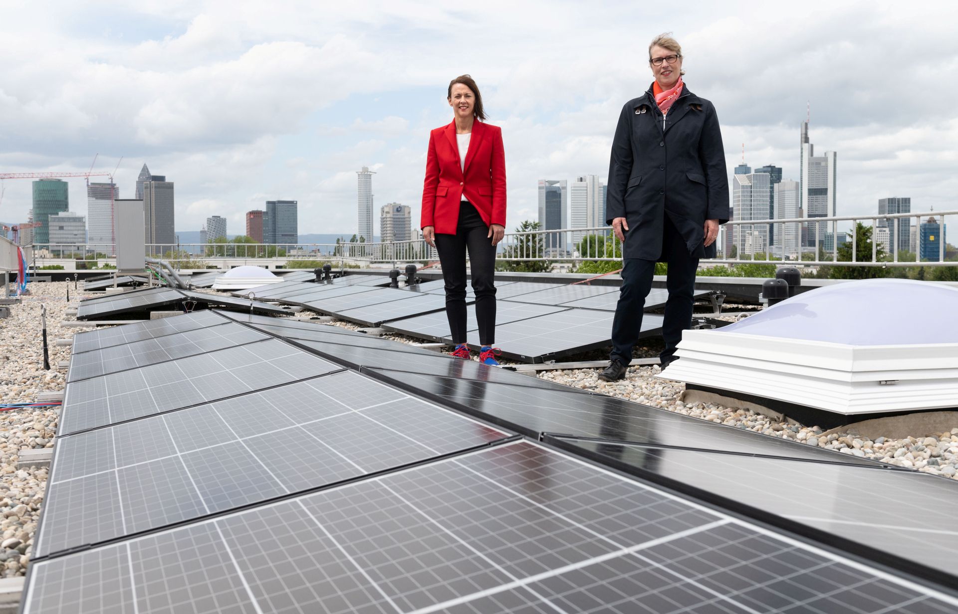 Über den Dächern der Fritz-Kissel-Siedlung: NHW (re. Geschäftsführerin Monika-Fontaine Kretschmer) und Mainova (li. Vorständin Diana Rauhut) haben hier ihr bislang größtes gemeinsames Mieterstromprojekt umgesetzt. Foto: NHW / Marc Strohfeldt