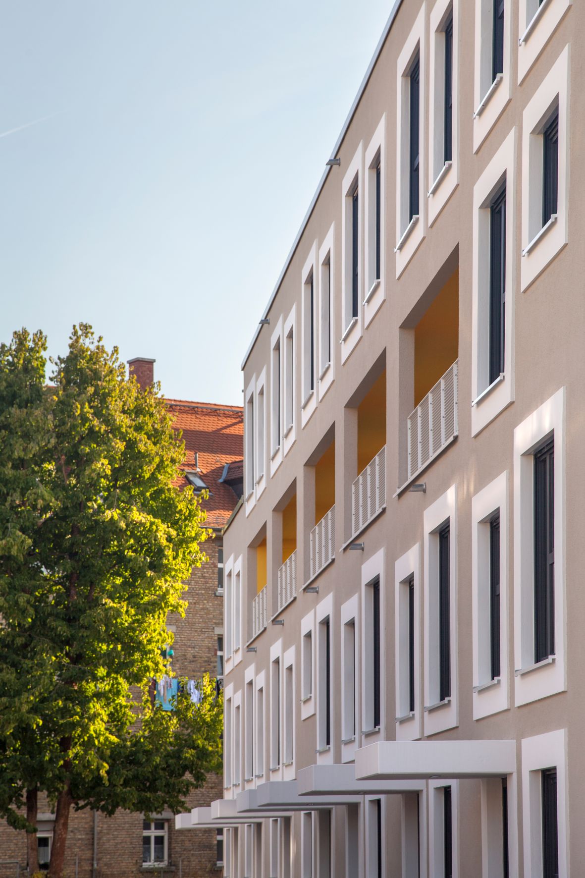 Der Lohn: das Qualitätssiegel Nachhaltiger Wohnungsbau des Vereins zur Förderung der Nachhaltigkeit im Wohnungsbau (NaWoh) und der mit 1.500 Euro dotierte DMK-Award für Nachhaltiges Bauen, vergeben von der Dagmar + Matthias Krieger Stiftung. Der GustavsHof punktet u.a., weil die 70 Wohnungen mit 39 bis 105 m² vor allem für Familien bezahlbaren Wohnraum in Innenstadtnähe bieten. Hinzu kommt: Die offene Laubengangerschließung ermöglicht bei 80 Prozent der Wohnungen eine sehr gute Belichtung sowie das Durchlüften über Fenster und Türen. Die hydrophile, also feuchtigkeitsfreundliche Bauweise ermöglicht es, Feuchtigkeit aufzunehmen und an die Außenluft abzugeben. So konnten wir auf eine chemische Ausstattung der Putze und Farben gegen Pilze und Algen verzichten und eine gesunde, nachhaltige und gut recyclingfähige Bausubstanz schaffen.