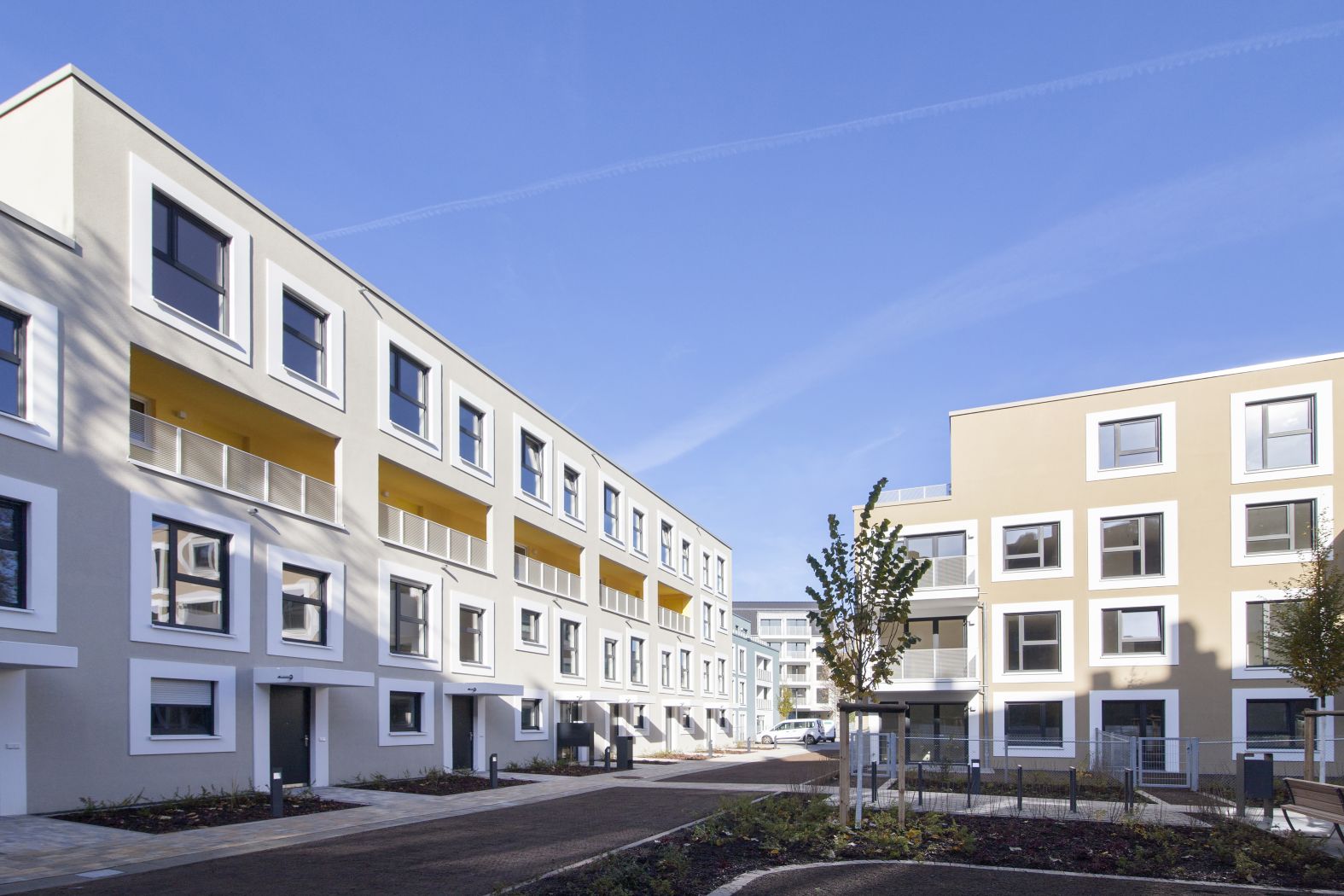 Der GustavsHof in Offenbach bietet 70 Wohneinheiten in sechs drei- bis fünfgeschossigen und mit Wohngrößen zwischen 39 und 105 m2 vor allem für Familien kostengünstigen Wohnraum. Foto: FFM-ARCHITEKTEN. Markus Raupach