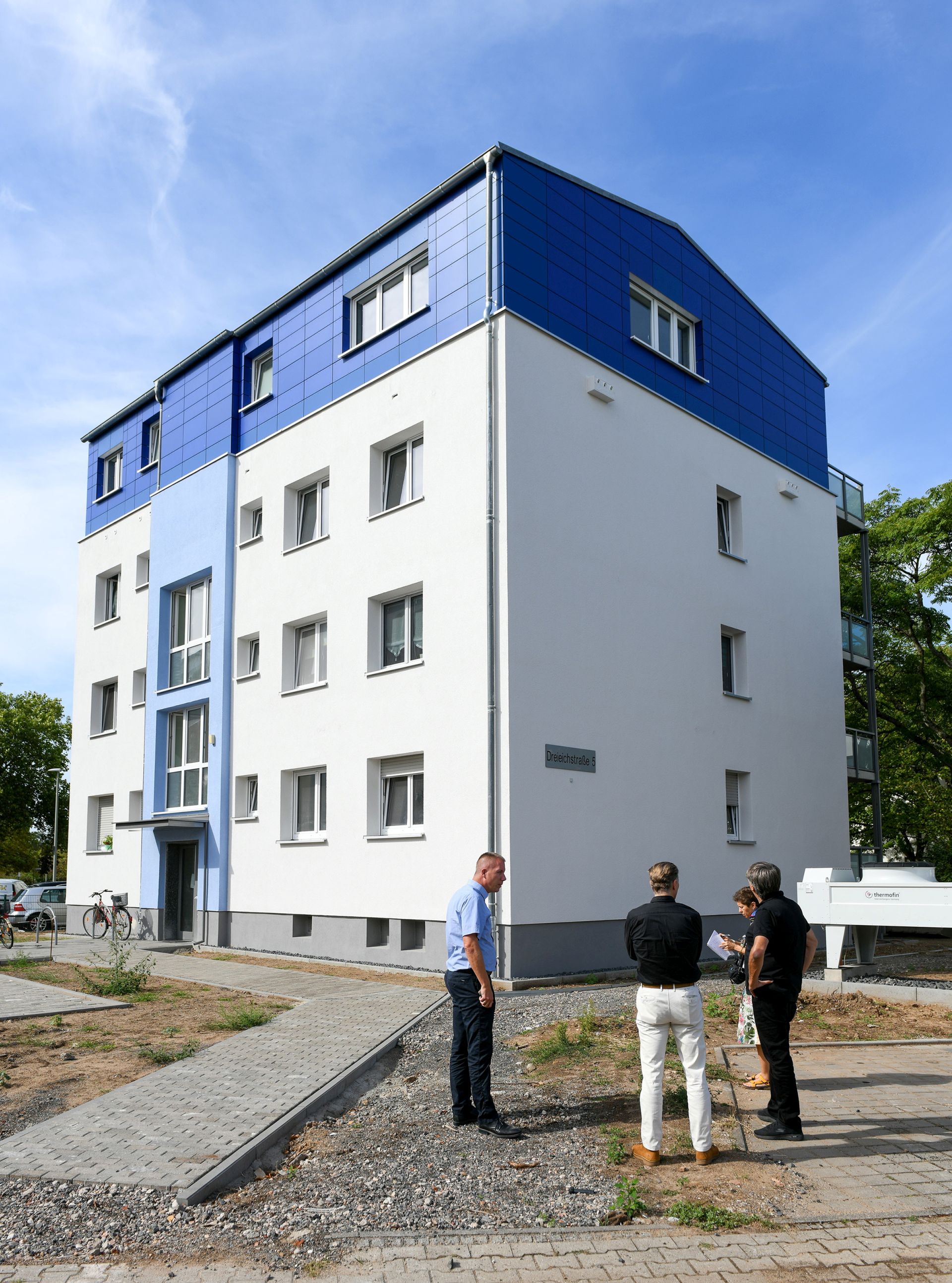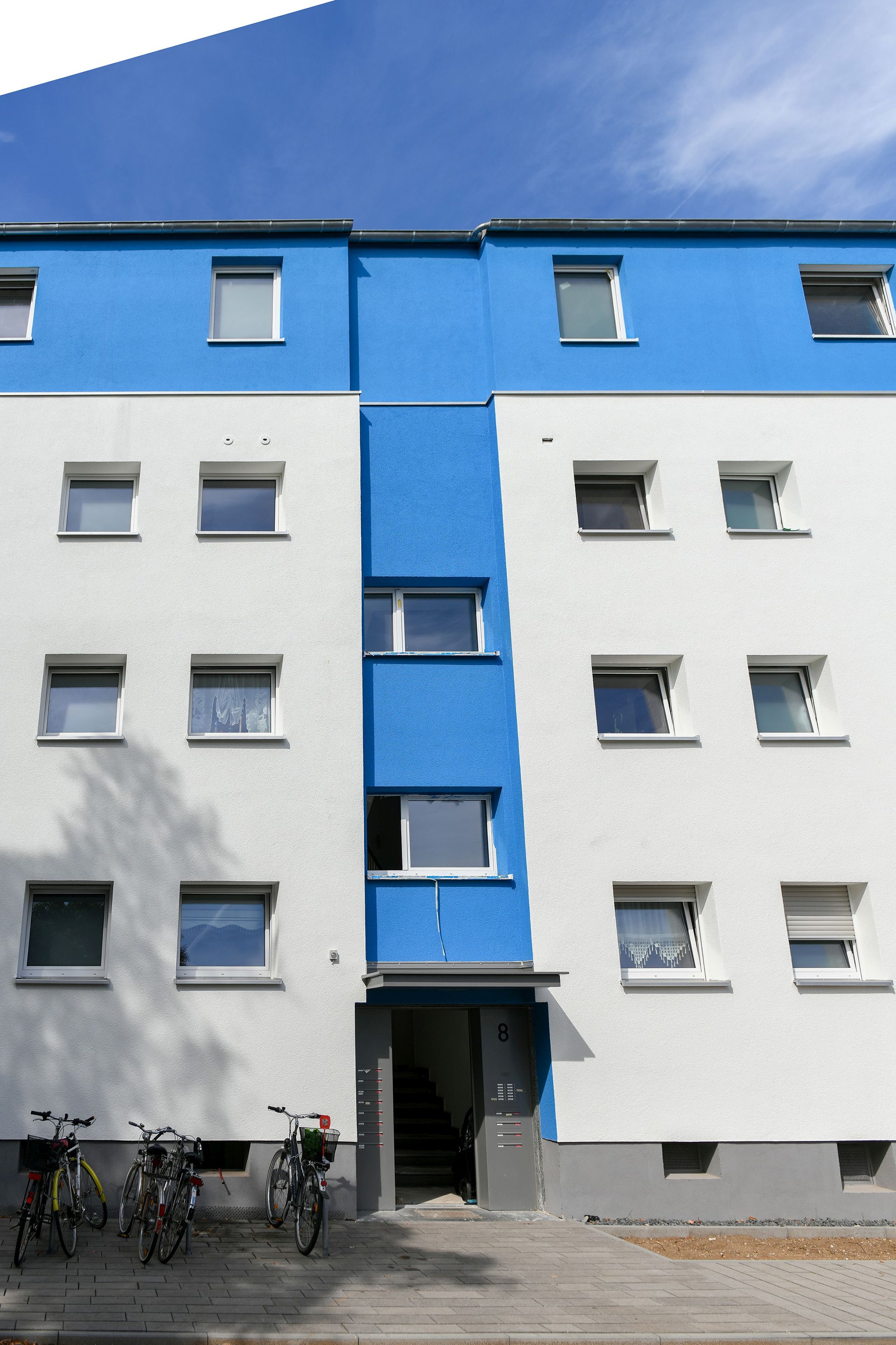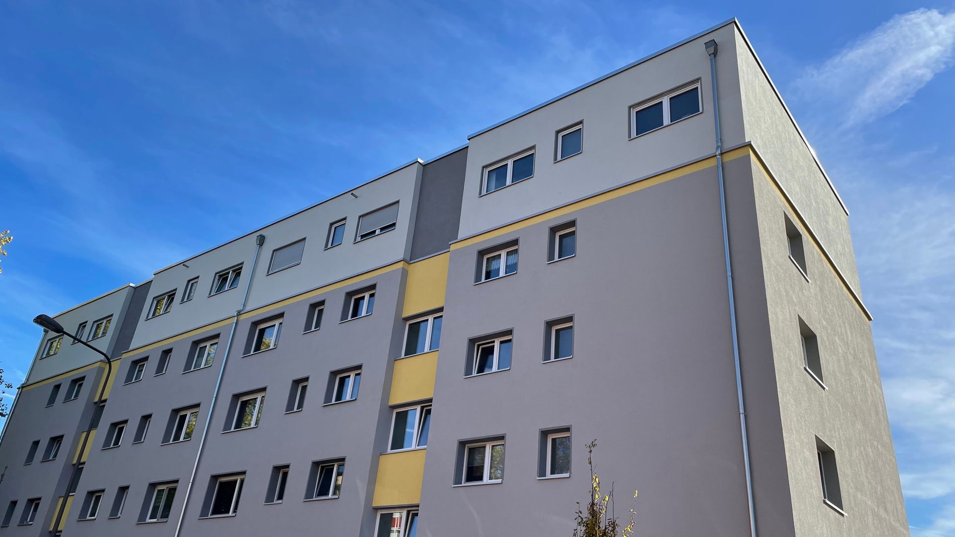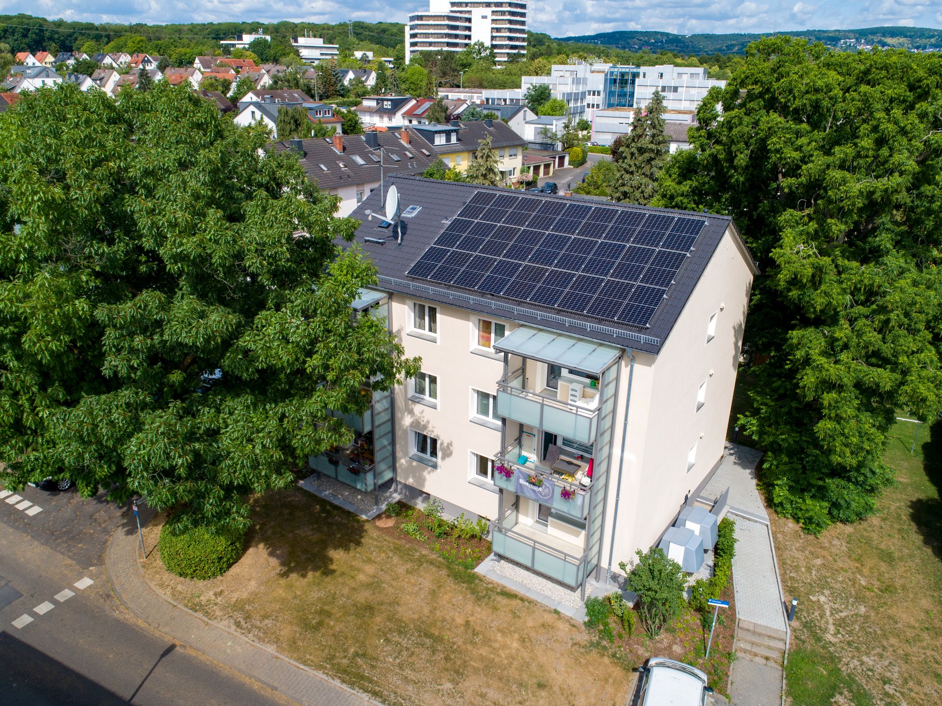 Äußerst erfolgreich verlief auch ein Pilotprojekt in der Höhenstraße in Schwalbach. Die durch die eingesetzten Maßnahmen wegweisende Modernisierung wurde bereits 2022 fertiggestellt. Dabei wurde die Wärmeerzeugungsanlage auf ausschließlich erneuerbare Energien umgestellt. Jetzt fungieren zwei Wärmepumpen als neue Zentralheizung, gleichzeitig erwärmen sie das Trinkwasser. Ihre Stromversorgung wird von einer Photovoltaikanlage auf dem Dach unterstützt. Zudem wurden Wohnungsstationen installiert, die das durch einen Plattenwärmetauscher fließende Trinkwasser erwärmt. Eine Technische Besonderheit sind die wohnungszentralen Lüftungsanlagen mit Wärmerückgewinnung. Hierbei wird die Wärme der Abluft aus Bad und Küche über Wärmetauscher in der Lüftungsanlage an die hereinströmende Frischluft übertragen. Die erwärmte Luft gelangt dann über Luftkanäle, die in der neuen Abhangdecke des Flurs verbaut wurden, in alle Zimmer. „Dieser Kreislauf spart viel Energie, denn die Wärme der Abluft kann so wiederverwendet werden und verpufft nicht“, beschreibt die für die Modernisierung zuständige Architektin Monica Palmer den Vorteil des Verfahrens. Darüber hinaus erhielt das Gebäude sämtliche Maßnahmen einer Vollmodernisierung, zu der unter anderem Dämmung, dreifach verglaste Fenster sowie die Erneuerung von Sanitär- und Elektroinstallationen gehörten. Die Mieterinnen und Mieter profitieren auch, da sie z.B. in der Heizperiode nicht mehr lüften müssen und so Heizkosten sparen können. Amüsant am Rand: Palmer wurde von einigen Mietern angerufen, deren Heizung angeblich nicht funktionierte. Weit gefehlt: Die gedämmte Außenhülle und die Lüftungsanlage hielten die Raumtemperatur konstant hoch und somit sprang die thermostatgesteuerten Heizungskörper nicht an.