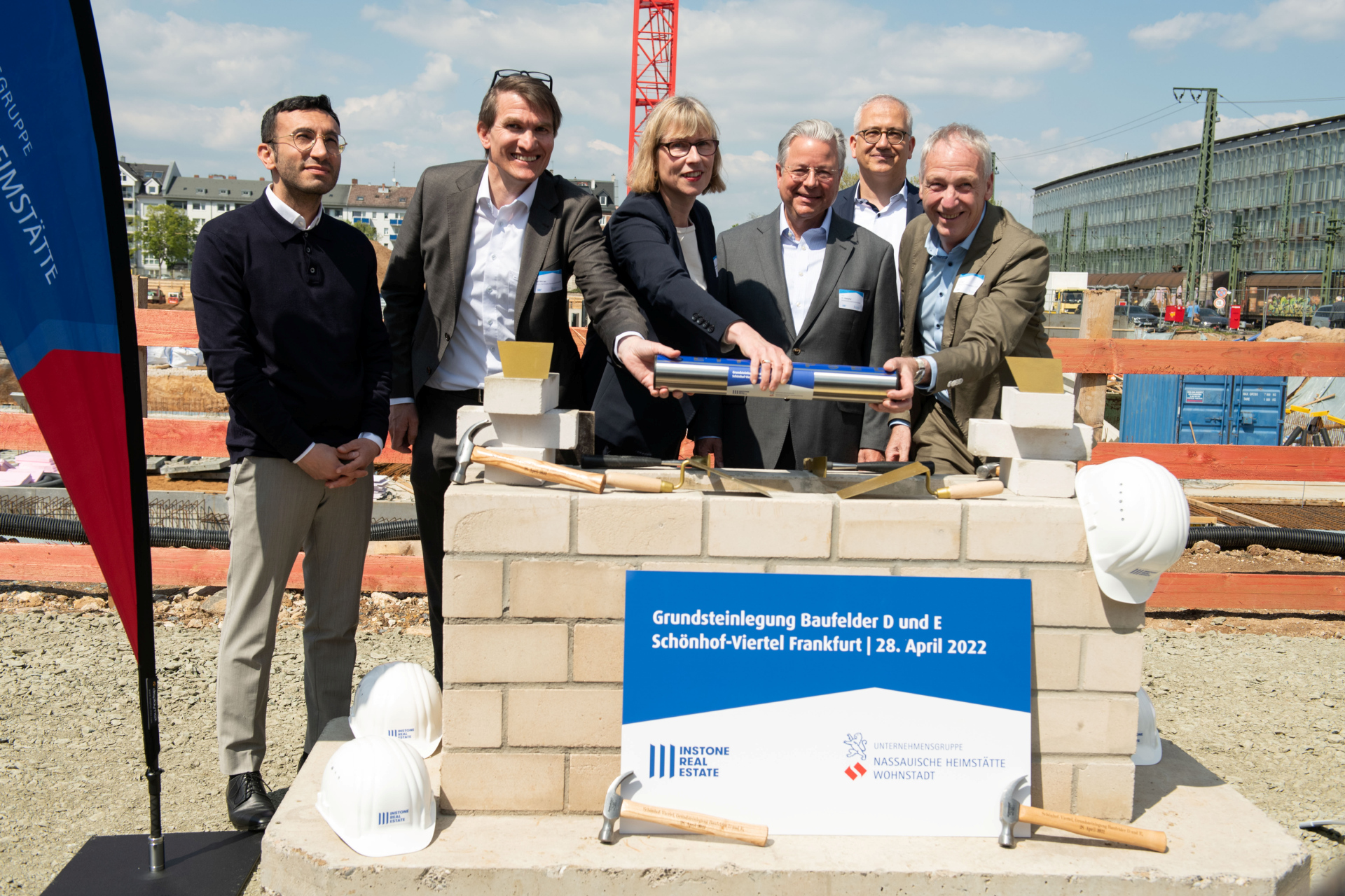 Grundsteinlegung mit (v. links) Planungsdezernent Mike Josef, Instone-Geschäftsführer Ralf Werner, den NHW-Geschäftsführern Monika Fontaine-Kretschmer, Dr. Constantin Westphal und Dr. Thomas Hain (ganz rechts) sowie Staatsminister Tarek Al-Wazir. Foto: NHW / Stefan Krutsch