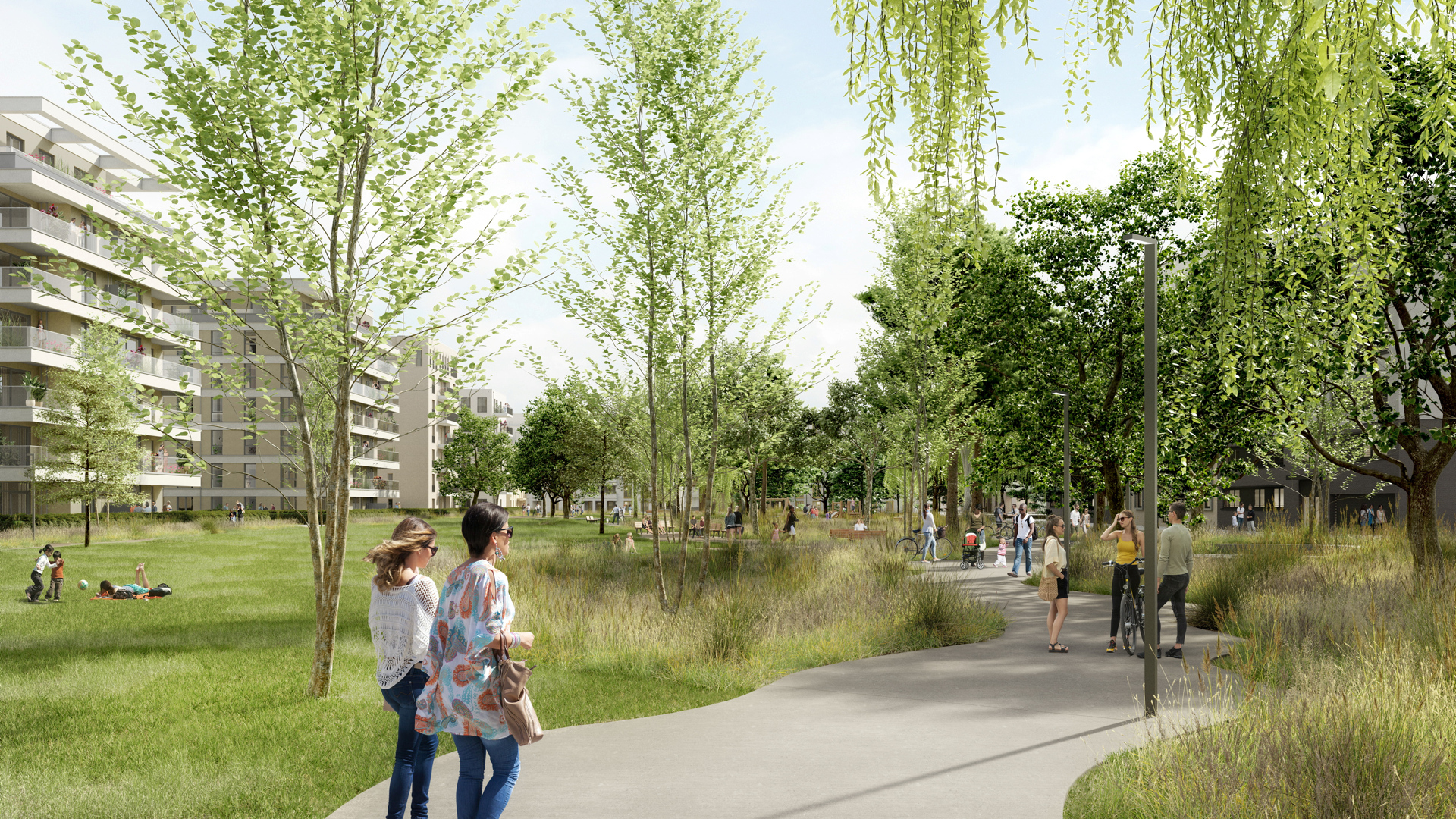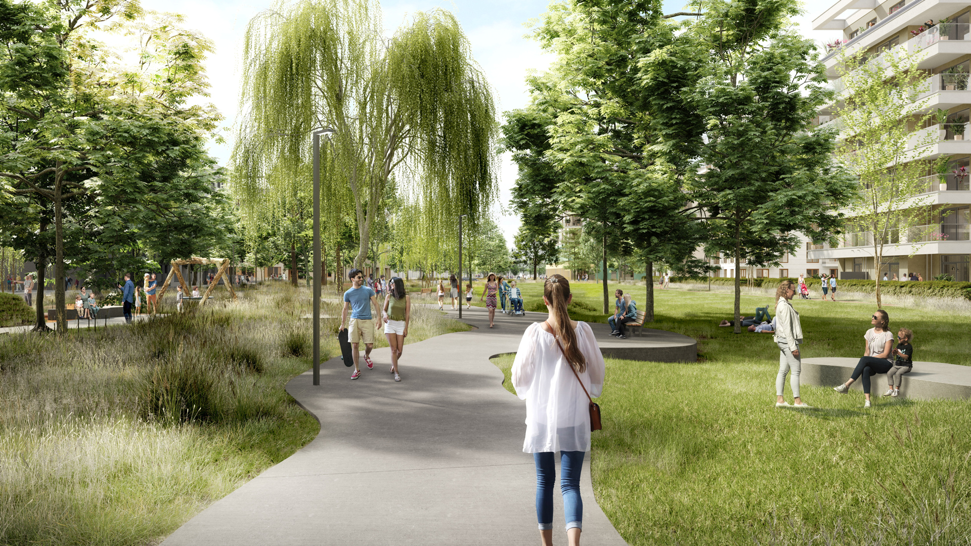 Vorrangiges Ziel ist es, Wohlbefinden und Gesundheit der Menschen zu fördern. Urban Gardening, ein Sportplatz sowie Grill- und Liegewiesen werden zu sozialen Treffpunkten, Felsen- und Kletterlandschaften sowie Spielplätze zu Abenteuerwelten für Kinder. E-Bike- und Carsharing-Stationen schaffen alternative Mobilitätsangebote. Darüber hinaus werden im Park heimische sowie klimaresiliente Pflanzenarten angesiedelt. Sämtliche Dächer werden begrünt, die Gärten gehen fließend in die Parklandschaft über. Mehrere bedrohte Tierarten sollen hier ein Zuhause erhalten, u.a. sind Fledermaushäuser, Bienenstöcke und Insektenhotels geplant. Eine spezielle Beleuchtung mit Lichtsensoren bei Gehwegen schützt nachtaktive Tiere. Bei Materialauswahl und technischer Ausstattung spielen Ressourcenschonung, Stoffkreislauf und Unterhaltungskosten eine große Rolle. Spielplätze, Fahrradparcours, Kletter- und Parcoursbereich sowie Sportplatz bekommen einen wasserdurchlässigen Belag, Regenwasser wird in unterirdischen Speichertanks gesammelt und zur Bewässerung genutzt. 45 Prozent der Dachflächen werden mit Photovoltaik ausgestattet.