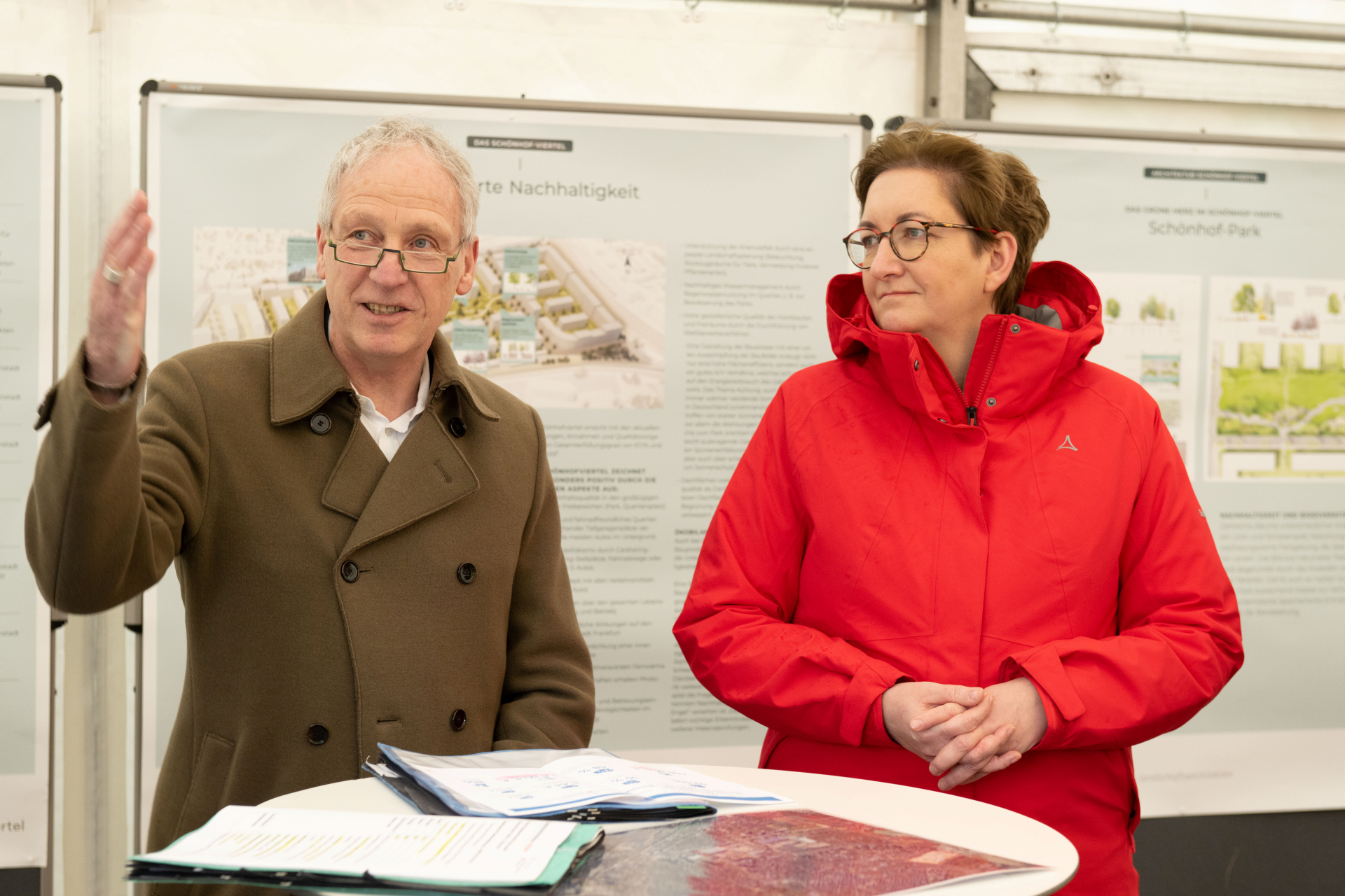 Viel Lob für das Schönhof-Viertel: Bundesbauministerin Klara Geywitz, hier mit NHW-Geschäftsführer Dr. Thomas Hain, betonte die Wichtigkeit von bezahlbarem, attraktivem und klimafreundlichem Wohnraum vor allem in Metropolen wie Frankfurt. Foto: NHW / Stefan Krutsch