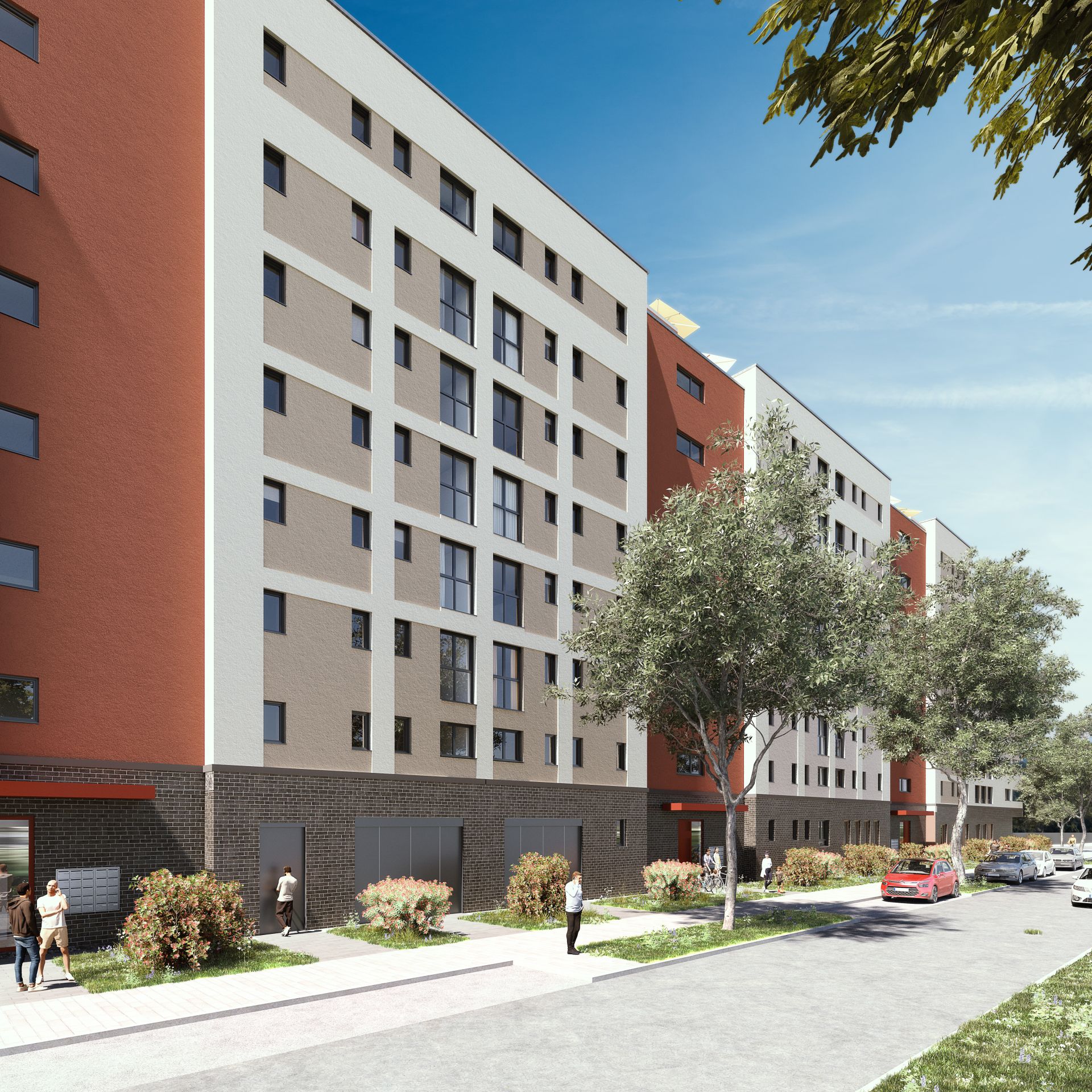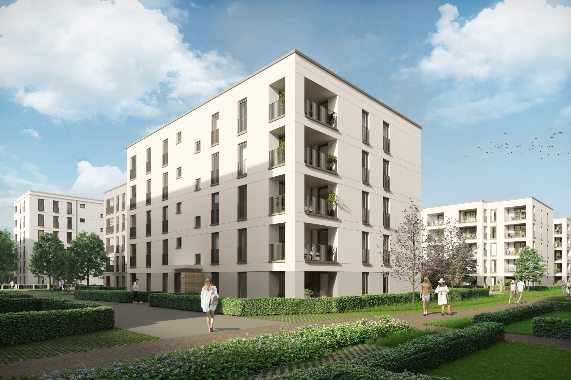 Rund 1.300 der 2.000 Wohnungen wird die NHW realisieren, etwa drei Viertel davon zur Miete. Insgesamt sind 30 Prozent aller Wohnungen und rund 45 Prozent der NHW-Wohnungen gefördert – überwiegend nach dem ersten und zweiten Förderweg, mit Mieten zwischen 5 und 10,50 Euro je qm Wohnfläche/Monat. Die Projektpartner haben bei der Planung darauf geachtet, die ganze Bandbreite von unterschiedlichen Wohnungen anzubieten. Die Palette reicht von Ein-Zimmer-Wohnungen für Single-Haushalte über Zwei- und Drei-Zimmer-Wohnungen für Paare mit und ohne Kinder bis hin zu Vier- und Fünf-Zimmer-Wohnungen für Familien sowie barrierefrei erreichbaren Wohnungen etwa für Senior:innen. „Ein Wohnungsmix also, der das komplette demografische Spektrum abdeckt“, sagt Projektleiterin Viktoria Röschlau. „Das ist gerade für Neubauviertel ganz wichtig. Jeder kennt ja diese Neubau-Reihenhaus-Gebiete, in die auf einen Schlag junge Familien einziehen, und nach 20 Jahren sitzen die Eltern in den leeren Häusern. Das wollen wir vermeiden. Wir wollen eine echte Mischung haben, von der Demografie her und von den Einkommensgruppen.“ Alle Wohnungen haben Balkone, Terrassen oder Loggien. Die ersten Wohnungen werden voraussichtlich 2024 fertig sein.