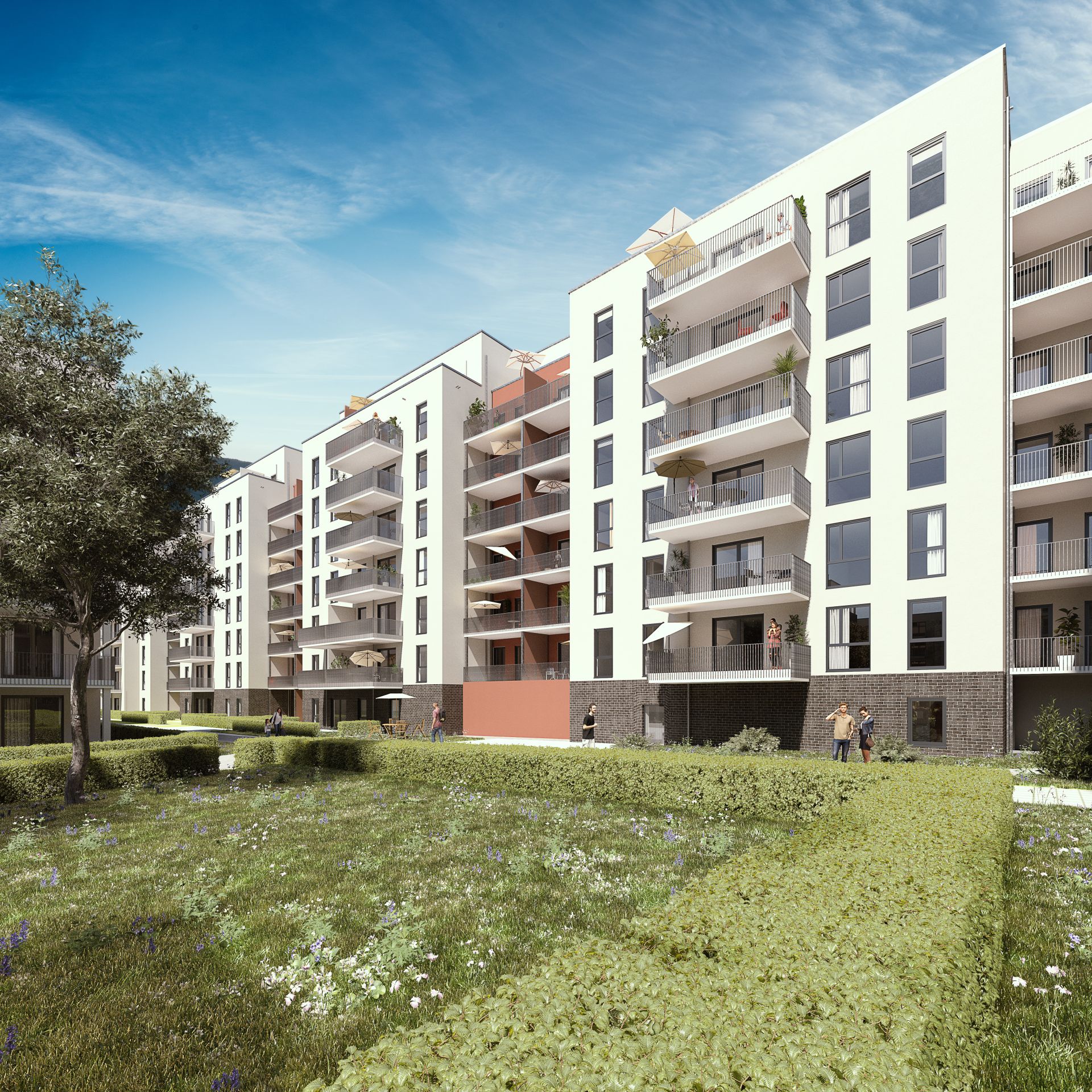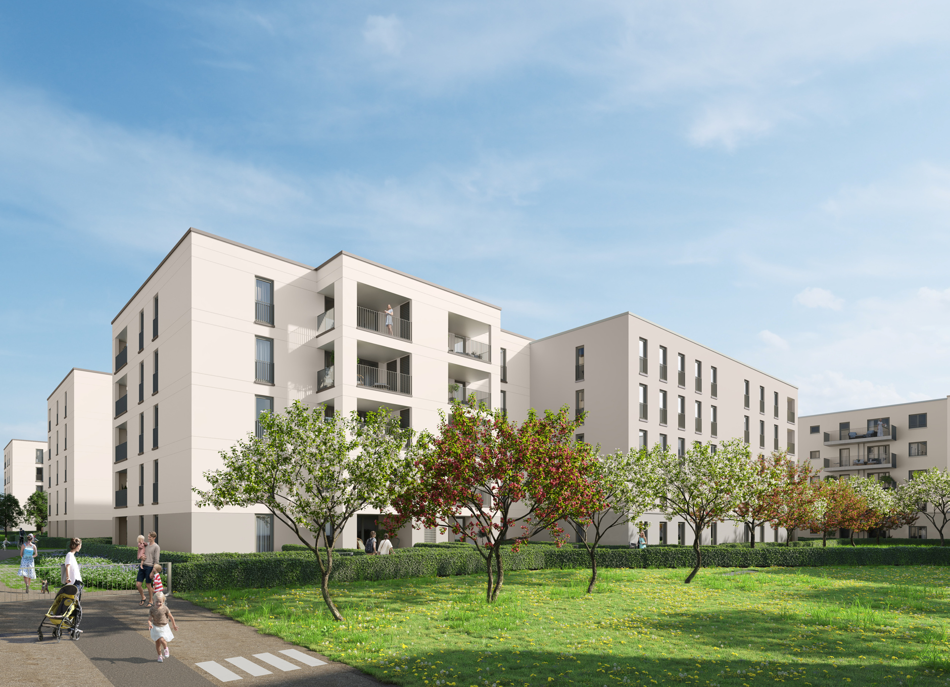 nuville steht für urbanes Lebensgefühl in grüner, geschützter Wohnlage. Die Wohnungen sind gruppiert um innenliegende Hofgärten mit Treffpunkten, Spielplätzen und Privatgärten. Visualisierung: NHW