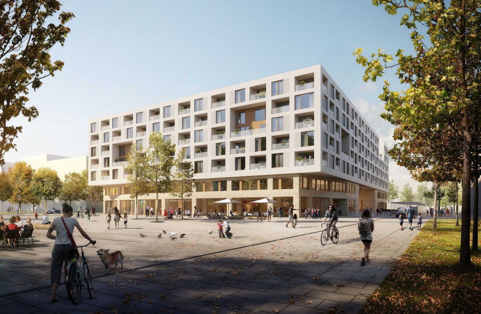 Er wird das Herzstück des SHV, das Zentrum des sozialen Miteinanders: Der 2,8 Hektar große Quartierspark wird sich wie ein grünes Band von West nach Ost durch das Viertel ziehen. Die Menschen sollen hier spazieren gehen, sich wohlfühlen und erholen. Es wird Spiel- und Freizeitmöglichkeiten geben, Ruhebereiche, Wildblumenwiesen, Flächen für Urban Gardening, das grüne Klassenzimmer und natürlich jede Menge Blumen, Sträucher und Bäume. „Der Park vereint die hohen Anforderungen an Erlebbarkeit des öffentlichen Raums, Kinderfreundlichkeit und Nachhaltigkeit. Gemeinsam mit dem Quartiersplatz soll er zu einem Ort für Erholung und einer Quelle von Lebensqualität werden“, sagt Projektleiterin Viktoria Röschlau. Das Gebäudeensemble um den Quartiersplatz herum bildet die geografische und funktionelle Mitte des Schönhof-Viertels, in der die wesentlichen Bestandteile des urbanen Lebens aufeinandertreffen: Einkaufen, Wohnen, Arbeiten, Lernen und Gastronomie. Es entsteht ein lebendiges und dynamisches Zentrum mit hoher Wohn- und Aufenthaltsqualität.