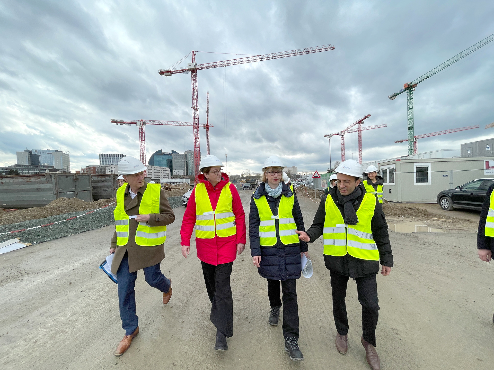 Bundesbauministerin Klara Geywitz (rote Jacke) machte sich gemeinsam mit Planungsdezernent Mike Josef (re.) und den NHW-Geschäftsführern Monika Fontaine-Kretschmer sowie Dr. Thomas Hain ein Bild vom Schönhof-Viertel. Foto: NHW / Stefan Krutsch