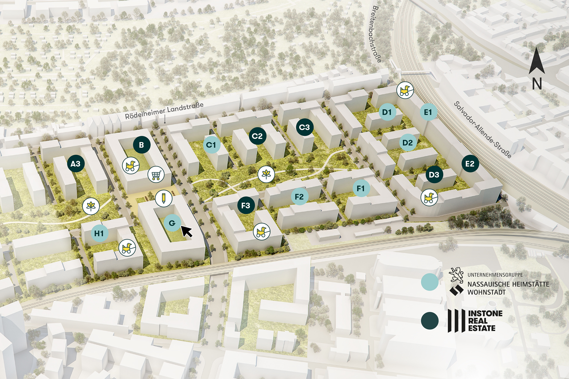 Rund 2.000 Wohnungen für ca. 6.000 Menschen bauen die Projektpartner Unternehmensgruppe Nassauische Heimstätte | Wohnstadt (NHW) und Instone Real Estate hier. Hinzu kommen Hessens erste Hybrid-Grundschule mit Sporthalle, fünf Kitas, Unterkünfte für Studierende und Menschen in Ausbildung, ein inklusives Wohnprojekt sowie Einzelhandels- und Gewerbeflächen. Ein Quartiersplatz und ein Park mit jeder Menge Raum zur Erholung und Freizeitgestaltung runden das Gesamtpaket ab. NHW und Instone streben für das Schönhof-Viertel das Quartiers-Zertifikat in Gold der Deutschen Gesellschaft für Nachhaltiges Bauen (DGNB) an.