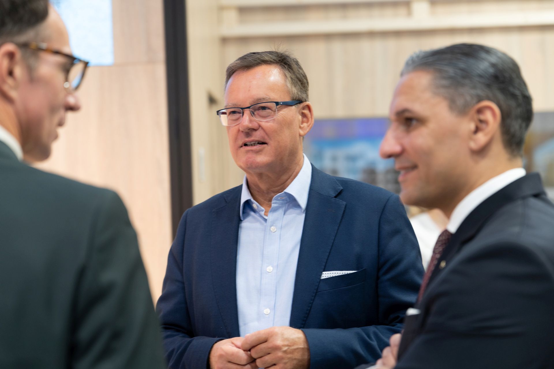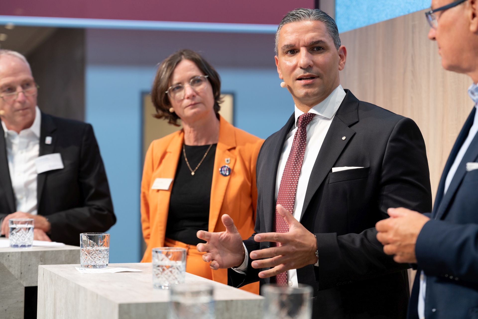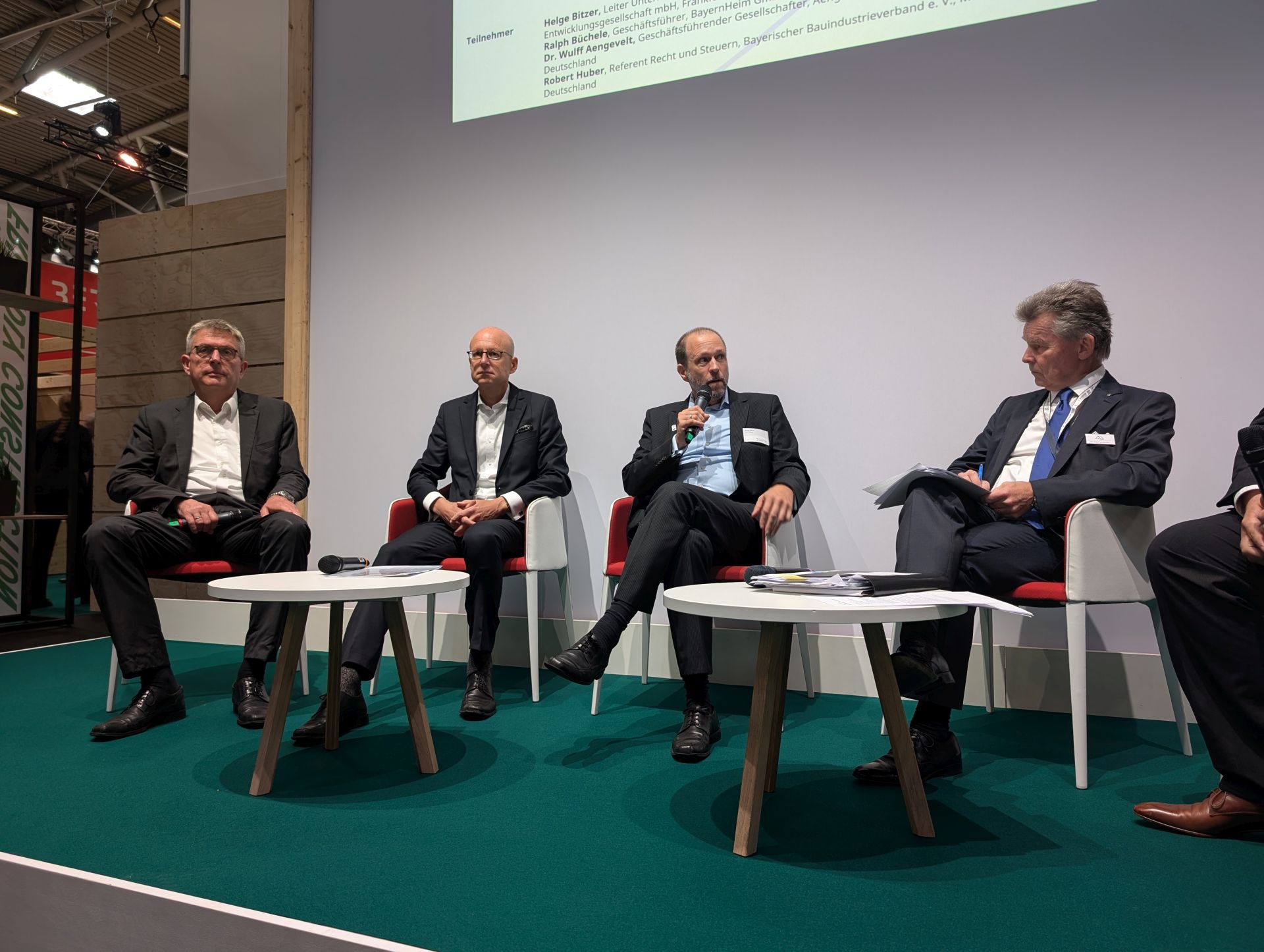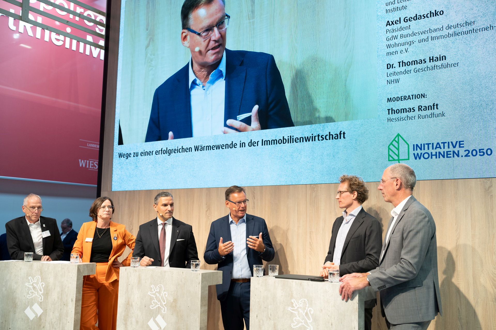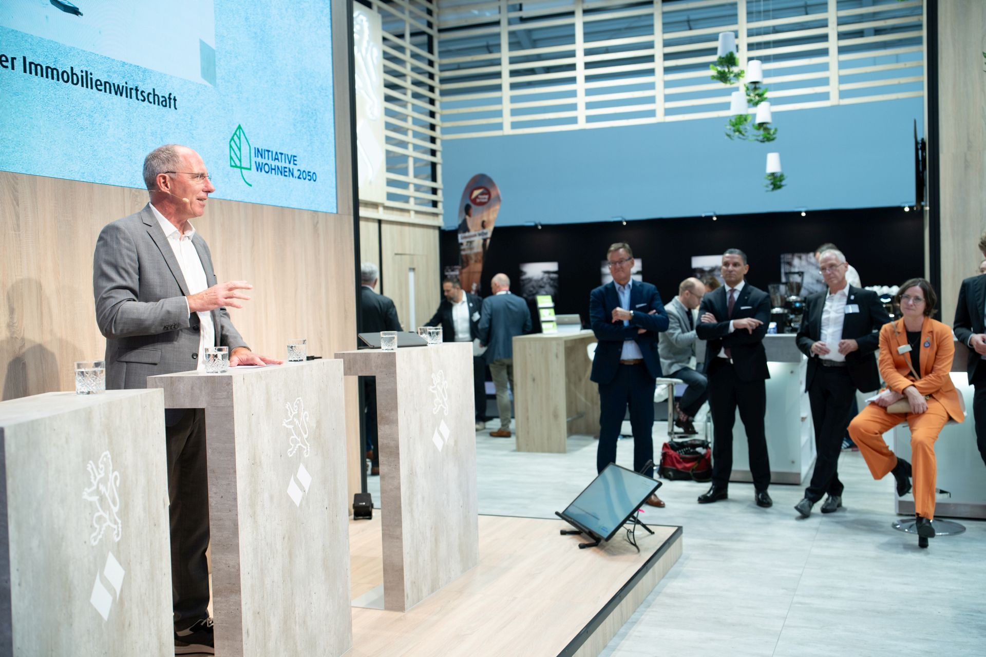 Schon seit einigen Jahren ist der Branchenzusammenschluss Initiative Wohnen.2050 (IW.2050) mit einem eigenen Fachgespräch Gast auf dem Messestand seines Gründungsmitglieds NHW. Wie Wege zu einer erfolgreichen Wärmewende in der Immobilienwirtschaft aussehen könnten, darüber diskutierten Axel Gedaschko, Präsident des GdW Bundesverbandes deutscher Wohnungs- und Immobilienunternehmen e. V. sowie Vorstandsvorsitzender der IW.2050, Dr. Thomas Hain, Leitender NHW-Geschäftsführer und stellvertretender Vorstand der IW.2050, mit Prof. Dr. Nikolas Müller, EBS Universität für Wirtschaft und Recht und Leiter Real Estate Management Institute (REMI). Komplettiert wurde die Runde durch zwei weitere Geschäftsführende großer deutscher Wohnungsunternehmen: Dr. Doris Zoller, Vorsitzende Geschäftsführerin der Münchner Wohnen GmbH, und Samir M. Sidgi, Vorsitzender der Geschäftsführung der SWSG – Stuttgarter Wohnungs- und Städtebaugesellschaft mbH.