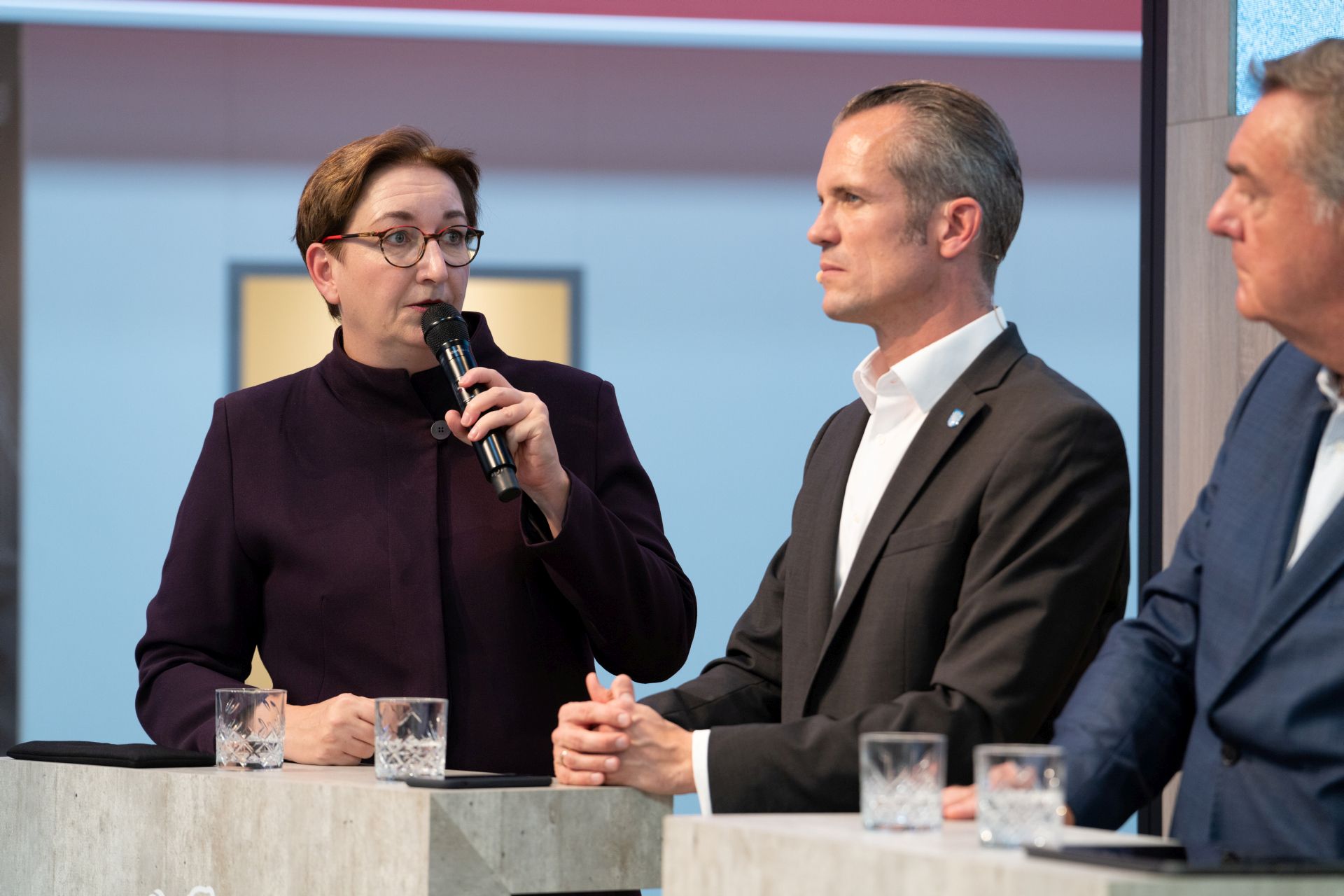 Der Messemontag startete mit zwei hochkarätig besetzten Fachforen und gehörte ganz den Stadtentwicklern. Mit Bundesbauministerin Klara Geywitz sprachen NHW-Geschäftsführerin Monika Fontaine-Kretschmer und die Oberbürgermeister aus Aachen (Sibylle Keupen), Offenbach (Dr. Felix Schwenke) und Hanau (Claus Kaminsky) über die Zukunftsfähigkeit der Zentren. Schwerpunkt des Gesprächs: Mögliche Herangehensweisen bei der Entwicklung von großen leer stehenden Kaufhaus-Immobilien. Schließlich ist dies nur eine von vielen Herausforderungen, vor der alle drei Kommunen stehen – auch in finanzieller Hinsicht. „Das ist eine Aufgabe, die Städte und Gemeinden ohne eine verlässliche Landes- und Bundesförderung alleine nicht stemmen können“, weiß Geywitz. Für sie ist die Städtebauförderung daher ein zentraler Schlüssel beim Umgestalten dieser ehemaligen Frequenzbringer sowie angrenzender innerstädtischer Flächen.