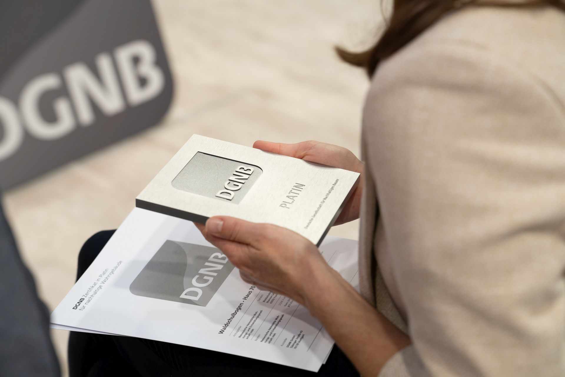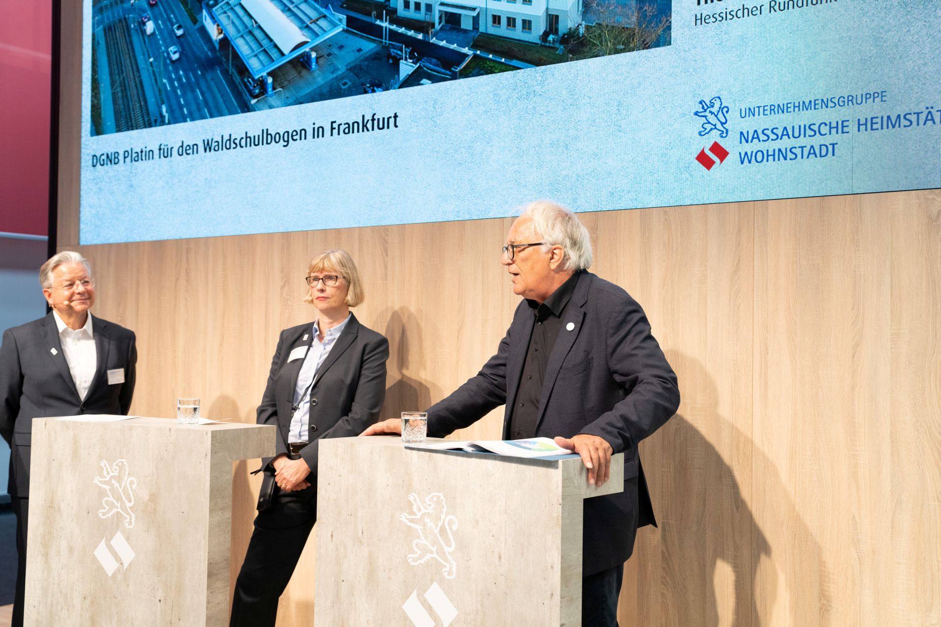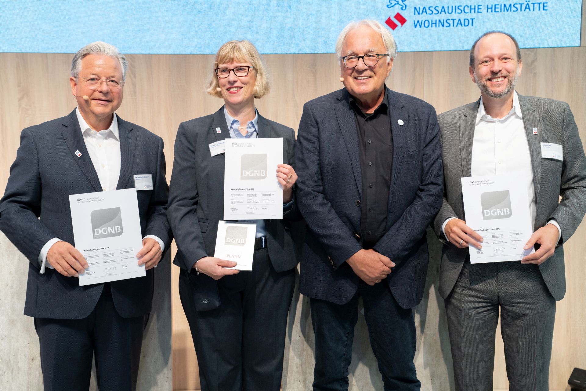 Dass sich bezahlbarer Wohnraum und nachhaltiges Bauen nicht ausschließen, belegt der Waldschulbogen in Frankfurt-Griesheim, den die NHW 2022 fertiggestellt hat. Das Projekt mit insgesamt 63 Wohnungen, 53 davon gefördert, erreicht höchste Standards in Bezug auf Umweltverträglichkeit. Dafür haben die drei Energieeffizienzhäuser am NHW-Messestand in München jetzt jeweils ein DGNB-Zertifikat in Platin erhalten – überreicht von DGNB-Gründungs- und Präsidiumsmitglied Prof. Dr. Alexander Rudolphi. Es ist die höchste Auszeichnung der Deutschen Gesellschaft für Nachhaltiges Bauen und berücksichtigt sechs Hauptkriterien: Ökonomie, Technik, Prozess, Standort, Soziales und Ökologie. Die beiden NHW-Geschäftsführer Monika Fontaine-Kretschmer und Dr. Constantin Westphal nahmen die Urkunden entgegen.