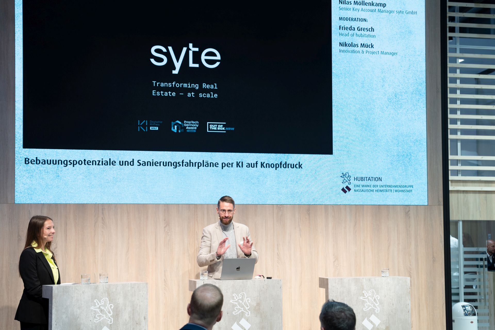 Nilas Möllenkamp, Senior Key Account Manager syte GmbH, präsentierte eine Software, die mittels KI Bebauungspotenziale und Sanierungsfahrpläne auf Knopfdruck erstellt. Für jedes erfasste Gebäude werden spezifische Kennziffern wie beispielsweise Gebäudefläche und -höhe, Baujahr, Fassadenqualität oder Energieeffizienzklasse ausgegeben – und das deutschlandweit.