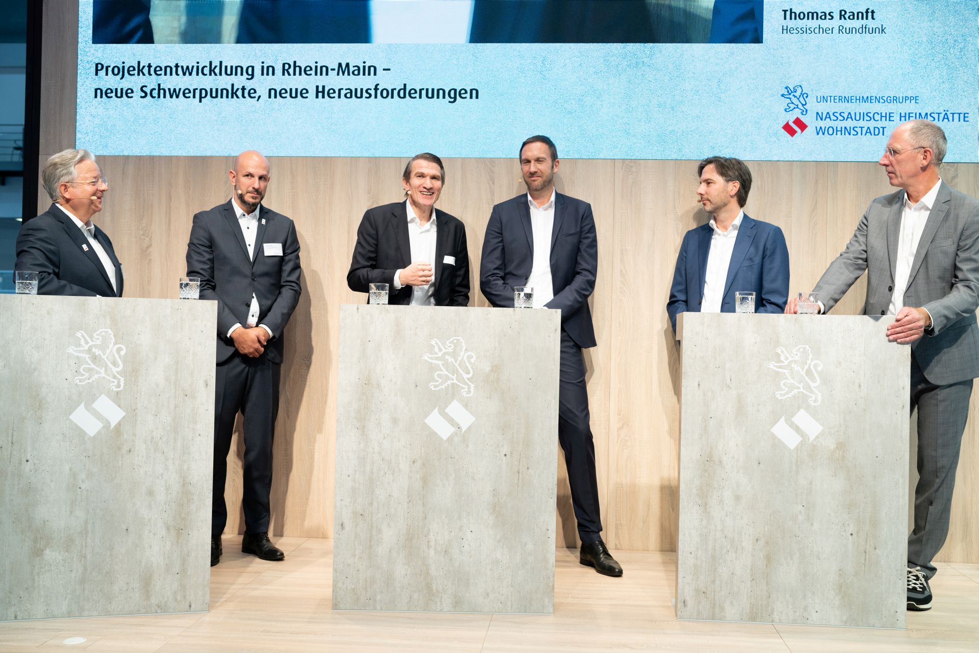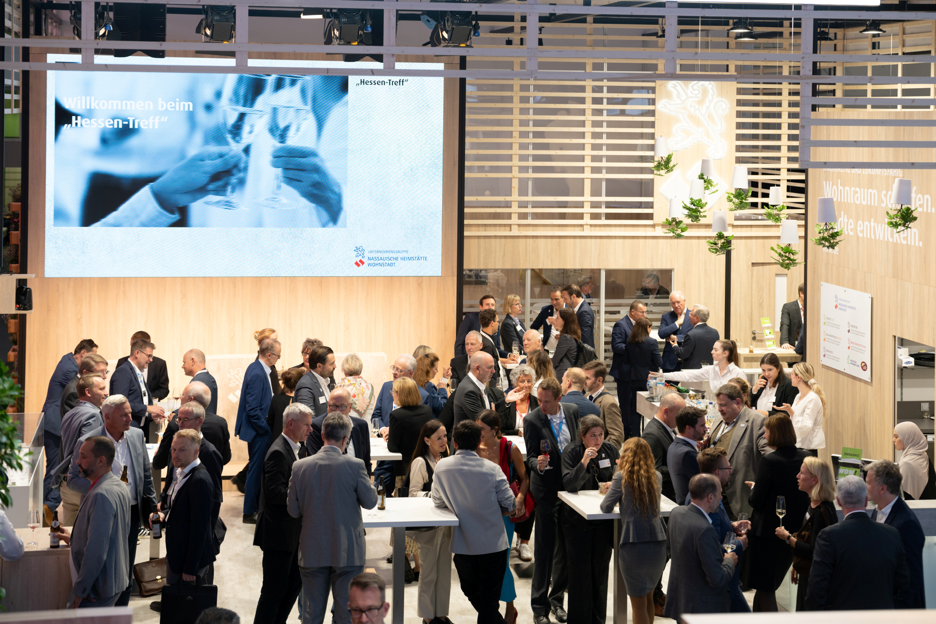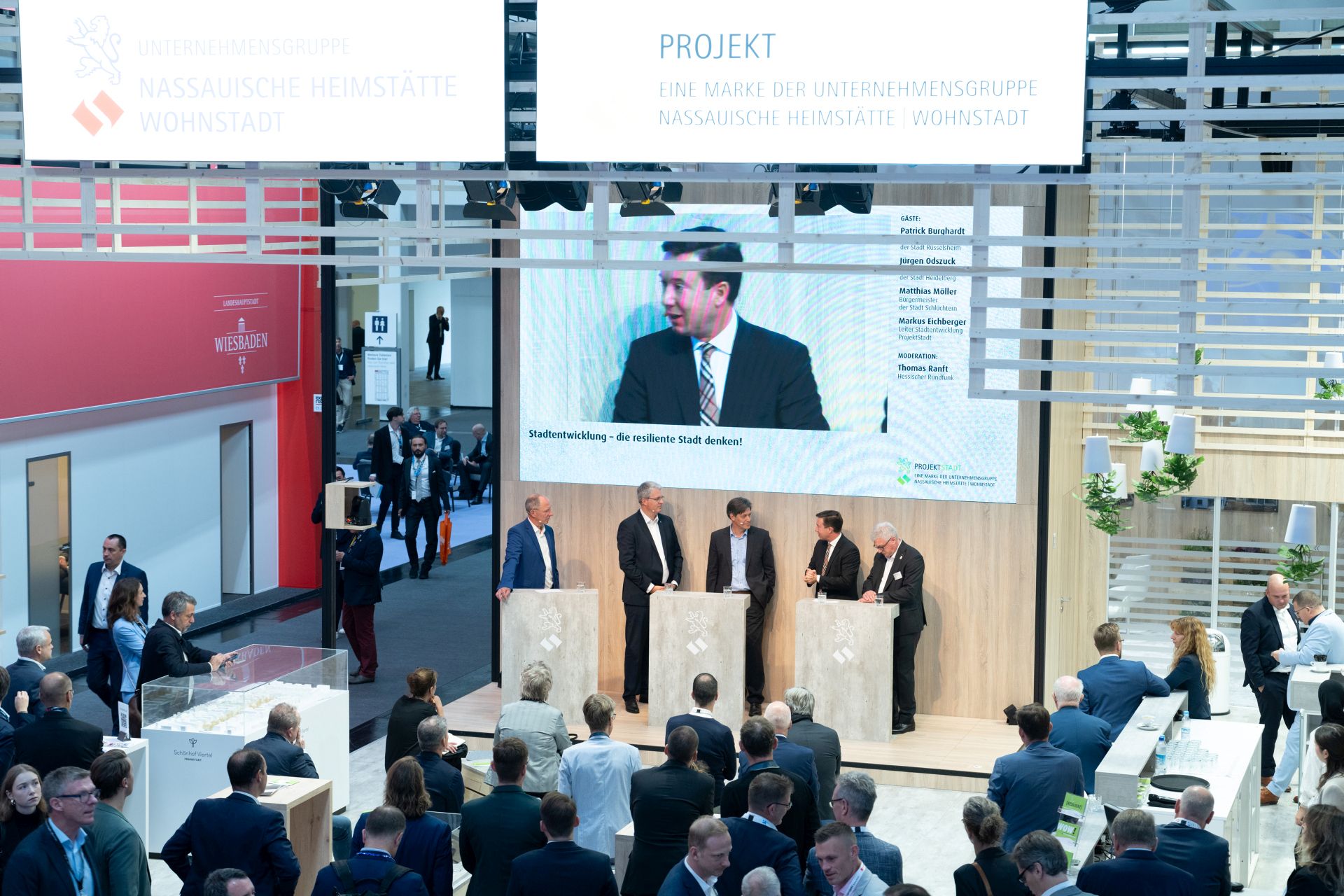 Spannende Diskussionen, informative Fachgespräche und Vorträge sowie reichlich Gelegenheiten zum Netzwerken warteten am 160 Quadratmeter großen Messestand 440 in Halle C1 auf die Besucher. Wie geht die Branche mit den derzeitigen multiplen Krisen um? Welche Entwicklungen, Innovationen und – vor allem – Lösungen gibt es? Fragen, mit denen sich vier Talkrunden beschäftigten, für die die Unternehmensgruppe Nassauische Heimstätte | Wohnstadt (NHW) prominente Vertreter aus Politik, Verbänden, Kommunen sowie der Projekt- und Immobilienwirtschaft gewinnen konnte. Eloquent moderiert wurden die Gespräche von Thomas Ranft (Hessischer Rundfunk).
