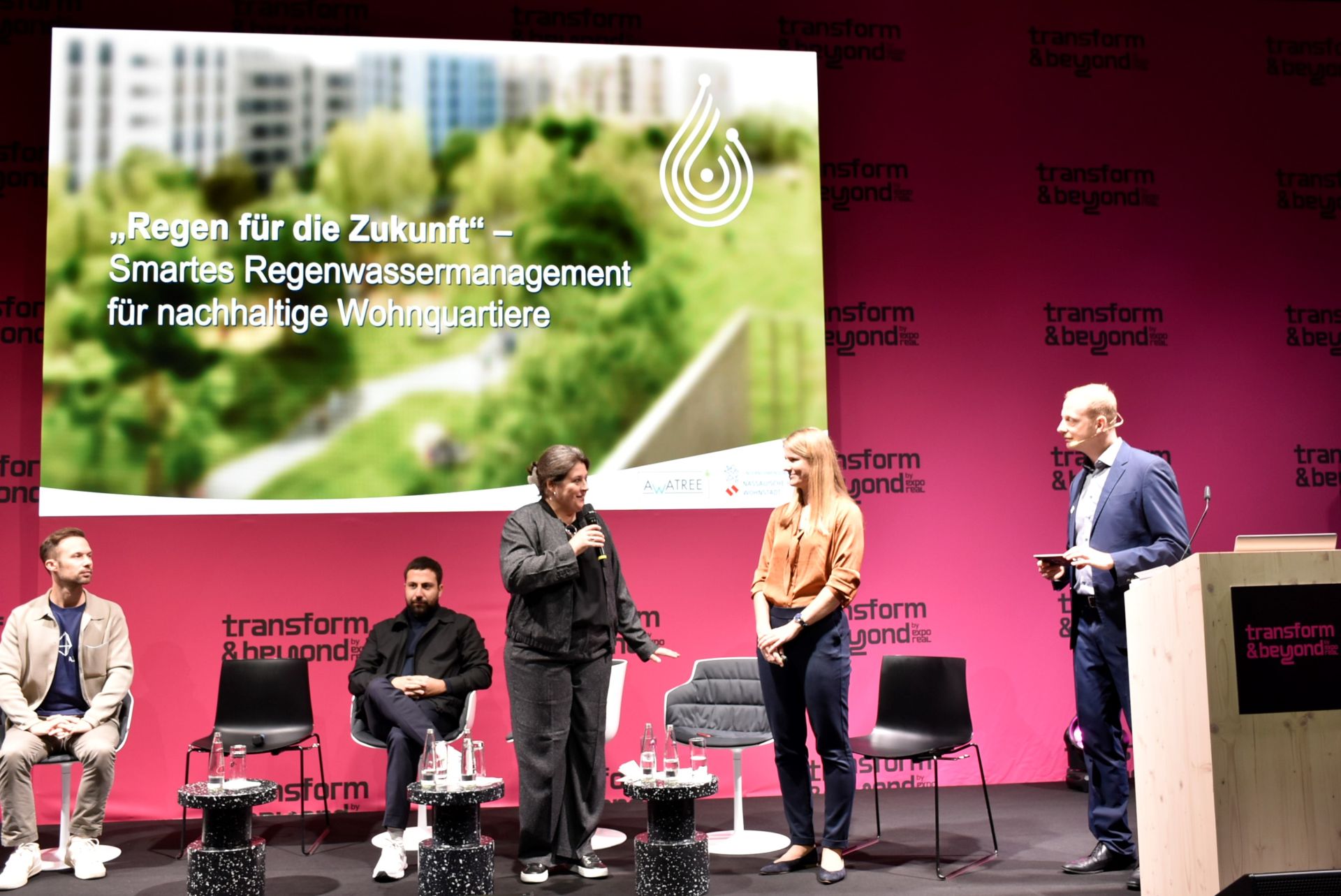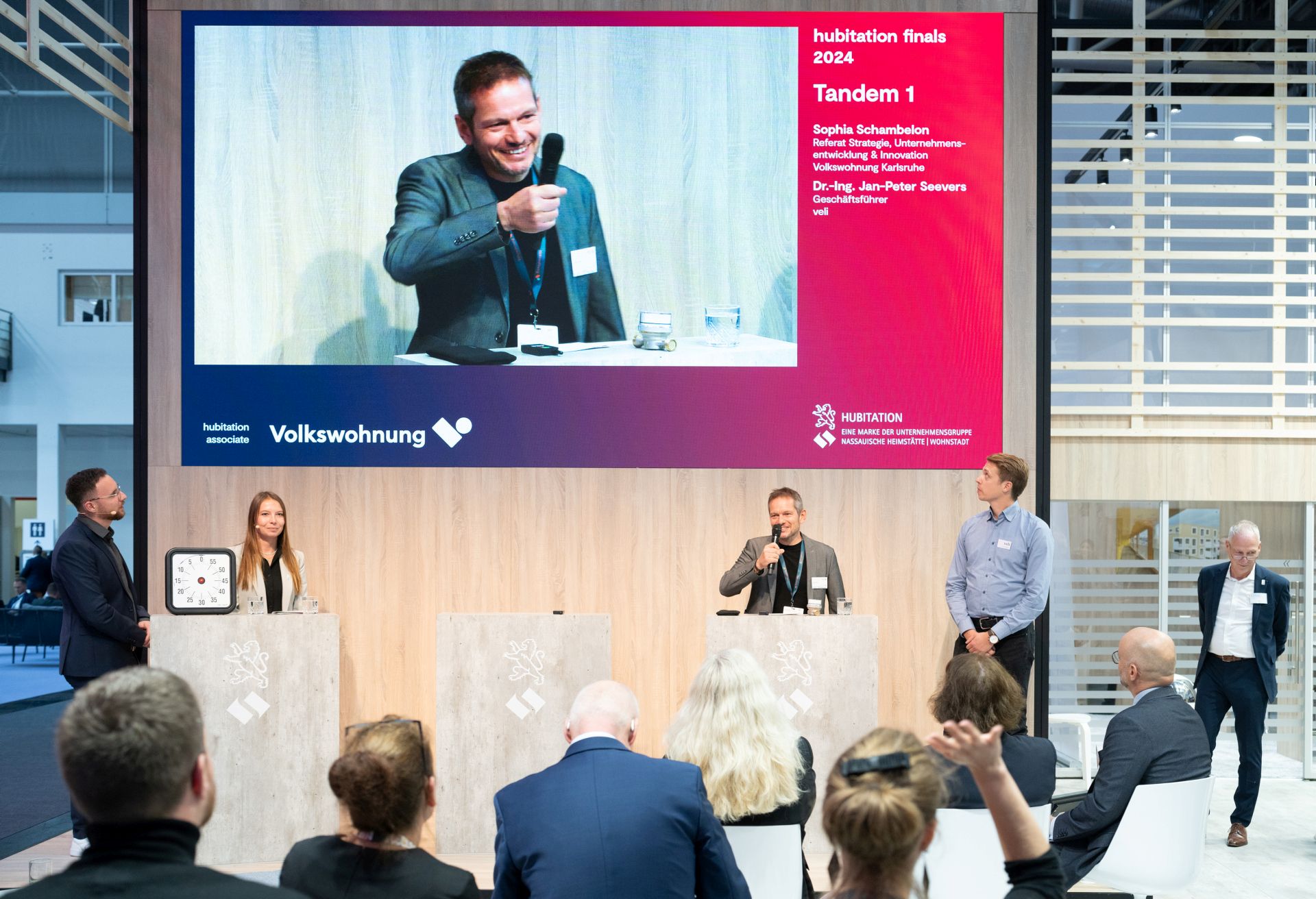 Höhepunkt am Messemontag waren die hubitation finals, die bereits zum dritten Mal am NHW-Stand stattfanden. Seit sieben Jahren bringt der Startup-Accelerator der NHW frische Ideen und etablierte Wohnungsunternehmen praxisorientiert zusammen, um Themen rund ums Wohnen und Arbeiten neu zu denken. Vier Tandems – bestehend aus je einem Startup und einem Wohnungsunternehmen aus dem Netzwerk der hubitation associates – hatten sich mit ihren gemeinsam erarbeiteten Pilotprojekten dem Votum gestellt. Nach einem spannenden Pitch entschied das Startup Awatree den Innovation Contest für sich. Iris Christophers, Leiterin Business Development bei Awatree, hatte ein intelligentes und nachhaltiges Wasserkonzept für Freiflächen vorgestellt und damit die Jury überzeugt. Neben weiteren Einladungen zu großen Branchenevents winkt ein Pilotprojekt mit dem Tandempartner NHW, vertreten durch die Martina Fendt, Leiterin des Freiflächenservice. Moderiert wurden die finals von Frieda Gresch, Head of hubitation, und Nikolas Mück, Innovation & Project Manager hubitation.