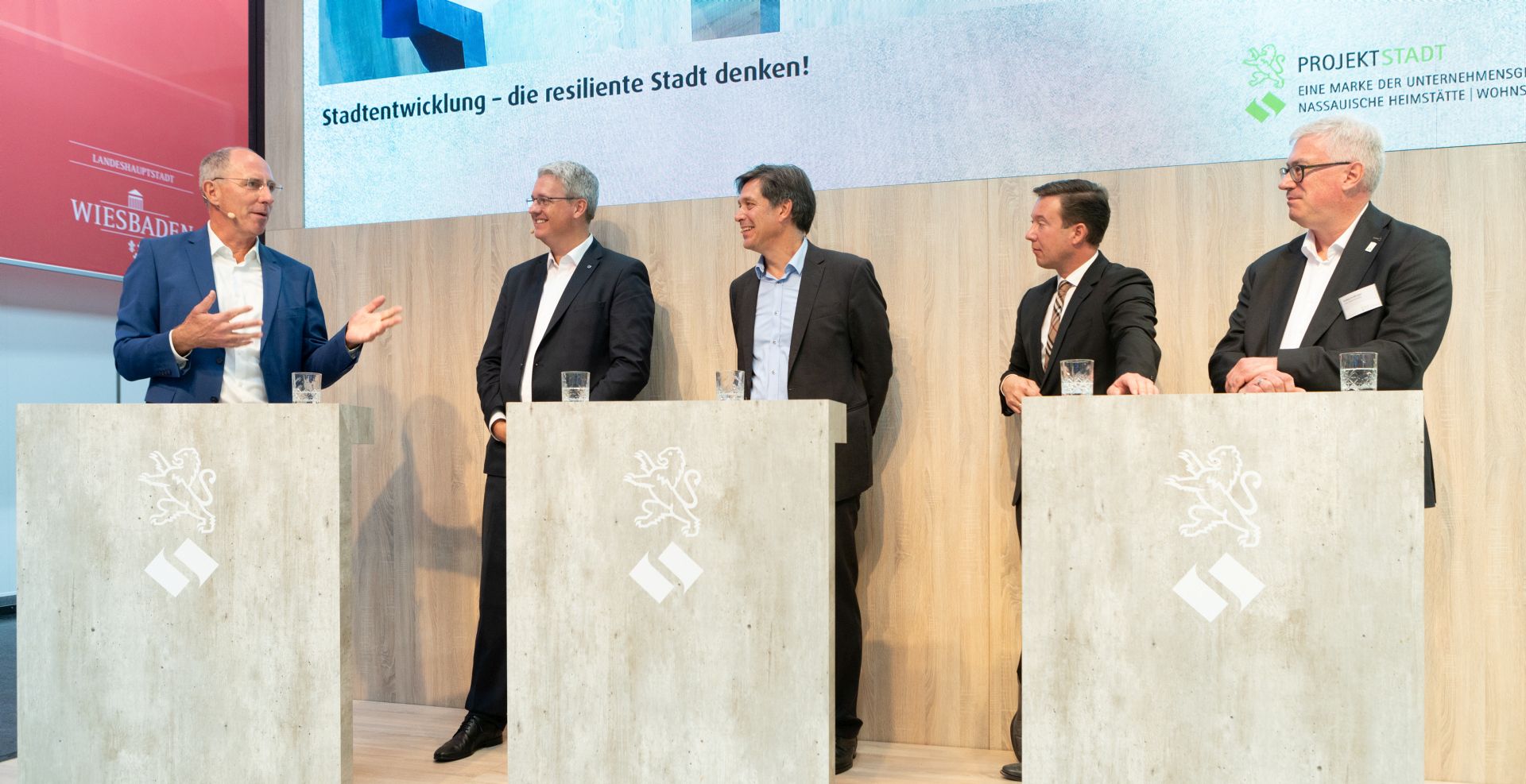 Dass es angesichts steigender Anforderungen ohne zusätzliche Fördermittel nicht geht, zeigte auch das zweite Panel, das sich mit der resilienten Stadt beschäftigte. Markus Eichberger, Leiter der NHW-Stadtentwicklungsmarke ProjektStadt, diskutierte mit seinen Gästen aus den Rathäusern in Heidelberg (Jürgen Odszuck), Rüsselsheim (Patrick Burghardt), Bad Hersfeld (Anke Hofmann) und Schlüchtern (Matthias Möller) neue Strategien hinsichtlich Ressourcenverbrauch, Klimawandel, demografischer Wandel und sozialer Fragmentierung, denen eine nachhaltige Stadtentwicklung Rechnung tragen muss – jeweils mit gesellschaftlichem, ökologischem und ökonomischem Bezug. „Stadtentwicklung darf man nicht in einzelnen Segmenten sehen, sondern als integriertes Ganzes“, brachte es Eichberger auf den Punkt. „Dazu gehören Mobilität, soziale Resilienz, Zusammenleben, Wohnen, aber natürlich auch Nachhaltigkeit und Klimaanpassung.“ Eine gute Planung spare dabei zwar Geld, dennoch seien Kommunen beim Bewältigen dieser Aufgaben auf Zuschüsse von Bund und Land sowie eine Kontinuität in der Fördermittellandschaft angewiesen.