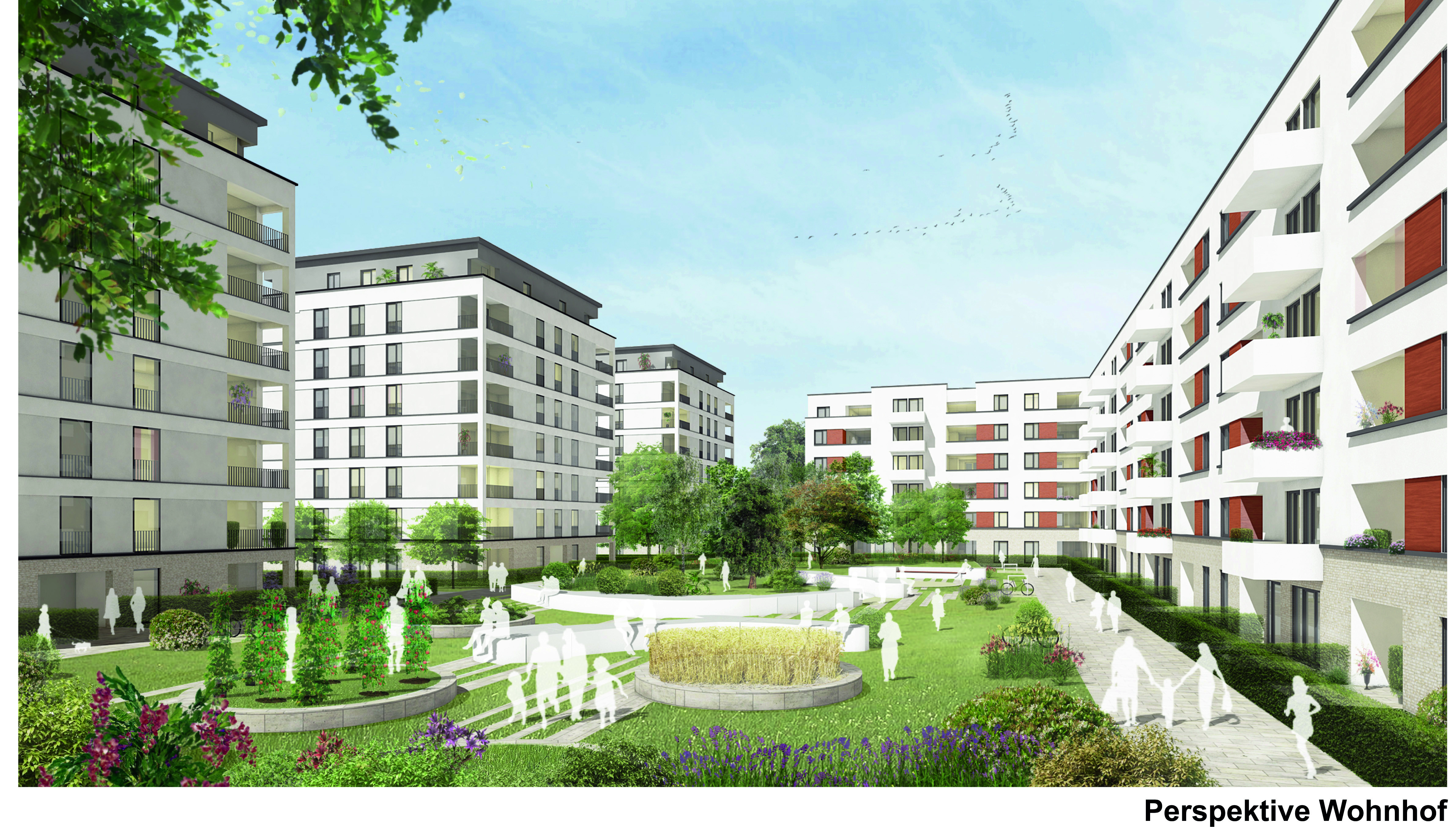 Großzügig, einladend und grün – der Innenhof in der Südstadt verspricht eine hohe Aufenthaltsqualität. Visualisierung: Hoechstetter und Partner Architekten