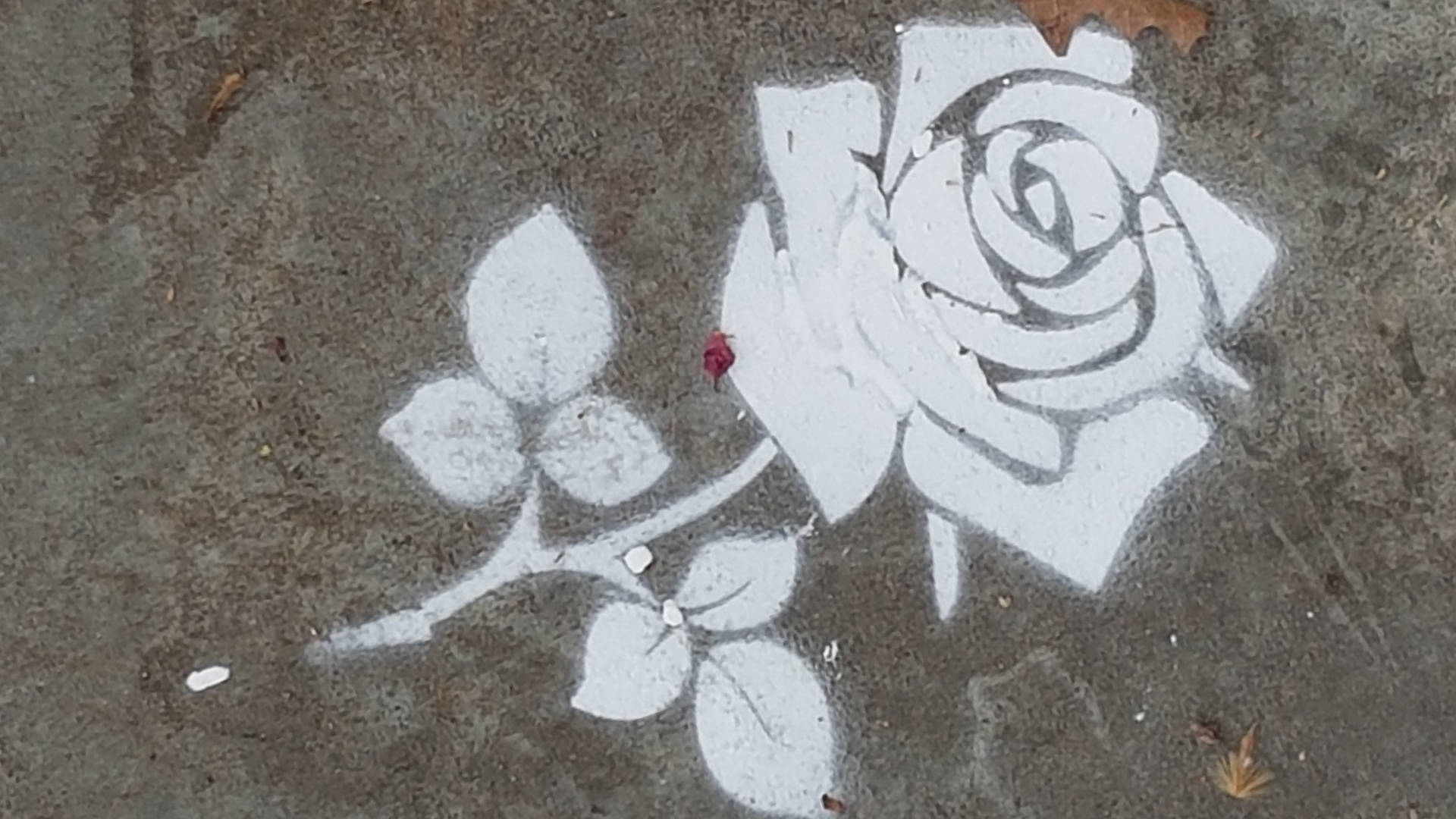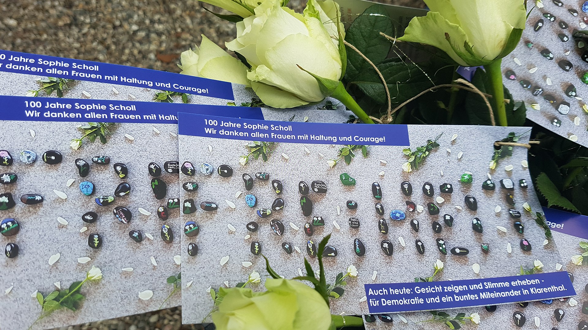 Die weißen Rosen wurden durch eine handgeschriebene Karte eines Kindes und einen Flyer zur Bedeutung von Sophie Scholl für das Leben heute ergänzt. Gleichzeitig wurden mit Schablonen weiße Rosen auf den Weg gemalt.