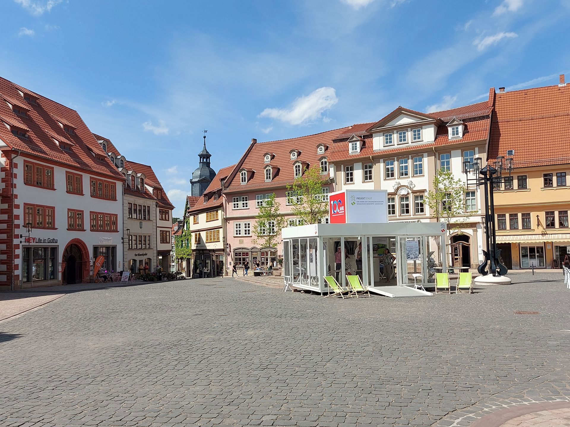 „Historischer Platz in neuem Gewand“ hieß es in Gotha. Zum Tag der Städtebauförderung stand der Infotainment-Cube der NHW auf dem frisch sanierten Hauptmarkt. Hier befand sich jahrelang eine Großbaustelle, welche die ProjektStadt in Weimar als Sanierungsträger betreut hat. Die umfangreiche Sanierung ist seit diesem Jahr fast vollständig abgeschlossen. Der Cube diente als Treffpunkt für Führungen über den Hauptmarkt, durch den historischen Fischkeller oder zur Pumpstation des Leinakanals. Außerdem konnten sich die Besucher:innen über die Sanierung des Hauptmarktes und die Leistungen der NHW informieren, es gab einen Fotowettbewerb und für Kinder ein Hauptmarkt-Quiz.