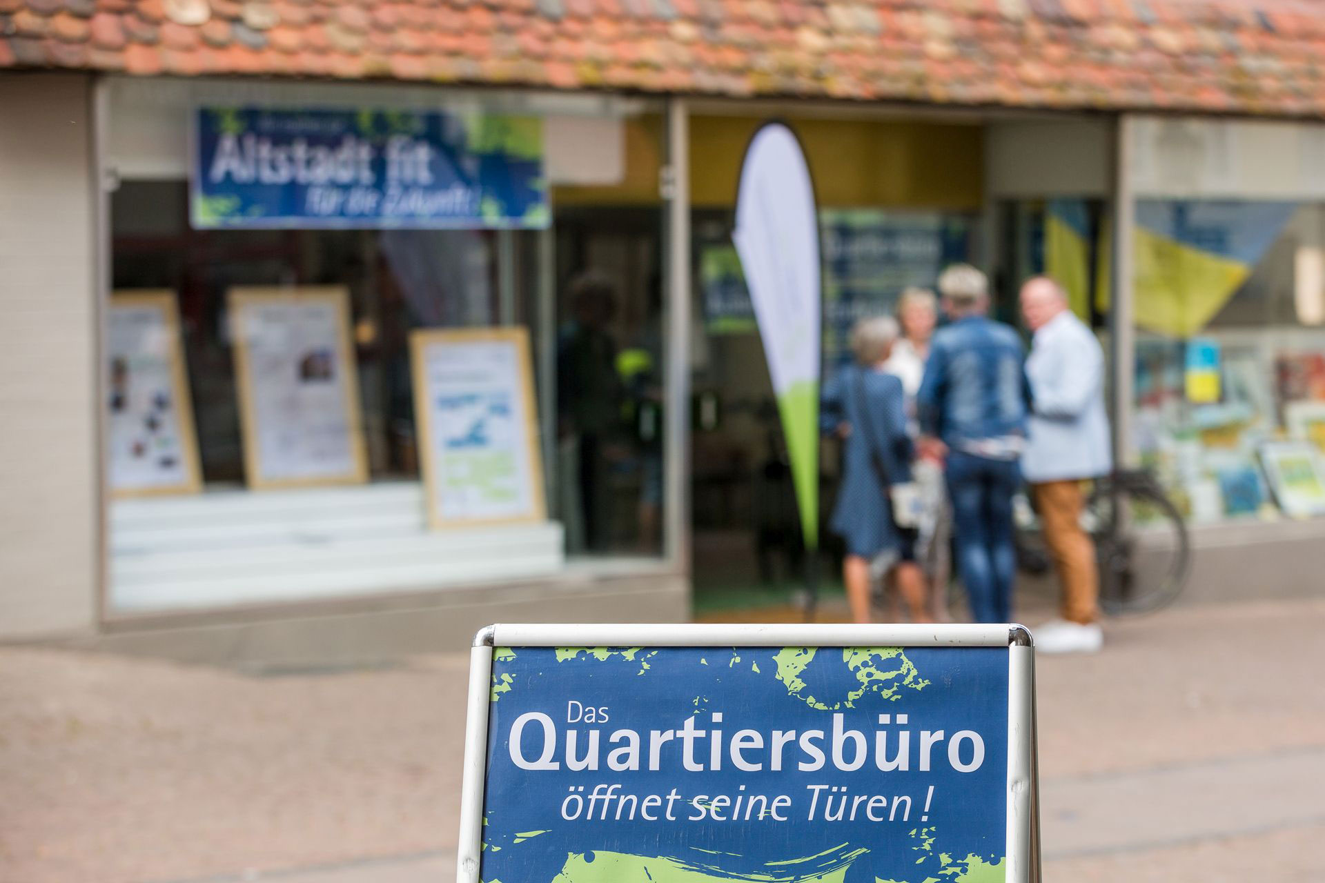 Eröffnung des Quartiersbüros. Dieses wird nun in prominenter Lage am Marktplatz zu finden sein. Gleichzeitig wurde auf das Förderprogramm „Lebendige Zentren" und die damit verknüpften Projekte aufmerksam gemacht. Vor Ort gab es eine Ausstellung der bisher angestoßenen Maßnahmen.