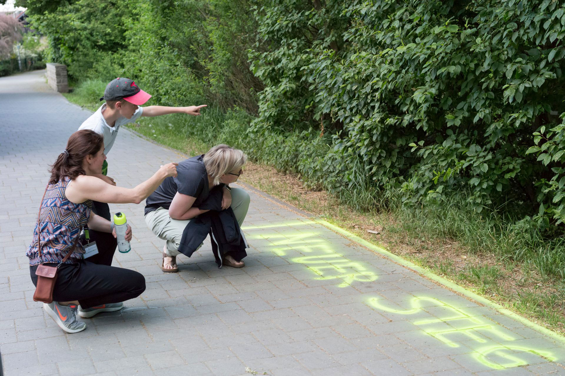 An verschiedenen Haltepunkten erklärte die Fachplanung das Vorhaben. Auf der abgesperrten Straße konnten die Bürger:innen an einer Beteiligungsstation bequem auf Liegestühlen und Sitzhockern Platz nehmen. Auf Stellwänden wurden die beiden vorliegenden Varianten zur Vorentwurfsplanung vorgestellt. Gemeinsam wurden anschließend Stärken bzw. Schwächen diskutiert.