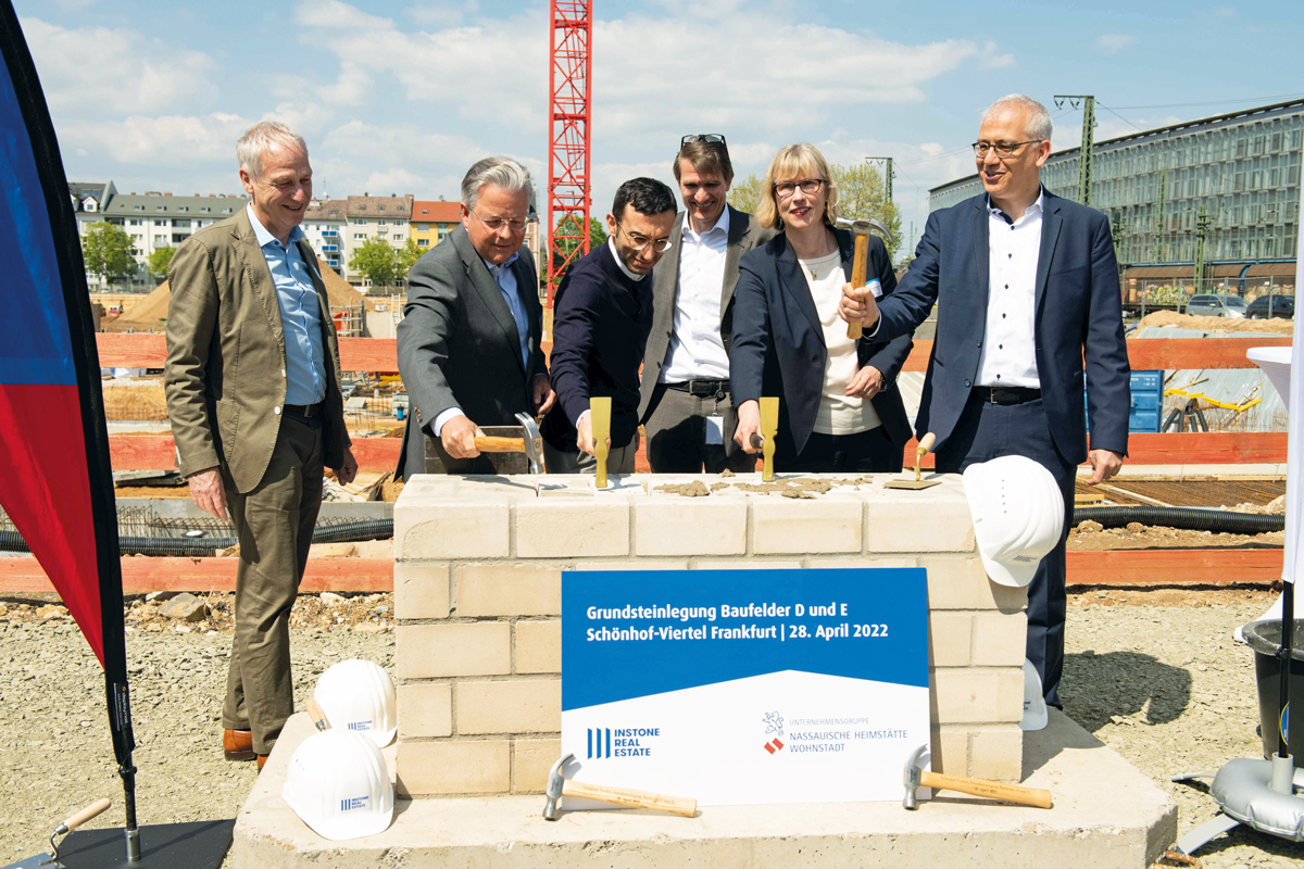 Auf dem Baufeld H1 errichtet die NHW eine Kita und rund 140 Wohnungen, 60 bis 70 Prozent davon gefördert. Im ersten Bauabschnitt entstehen auf den Baufeldern D und E insgesamt 612 Wohnungen, 191 davon gefördert, die restlichen sind frei finanzierte Miet- und Eigentumswohnungen. Die NHW selbst baut 395 Wohnungen und eine Kita, die verbleibenden 217 Einheiten realisiert Instone für das Unternehmen - ebenso wie eine weitere viergruppige Kita und ein Hostel für Studierende mit 184 Zimmern. Bei der Grundsteinlegung im April erklärte der Leitende NHW-Geschäftsführer Dr. Thomas Hain: „Das Schönhof- Viertel ist ein wichtiger Baustein, um den angespannten Wohnungsmarkt in Frankfurt zu entlasten. Damit realisieren wir nicht nur dringend benötigten innerstädtischen Wohnraum, sondern auch ein städtebaulich gelungenes Quartier mit hoher architektonischer Vielfalt.“