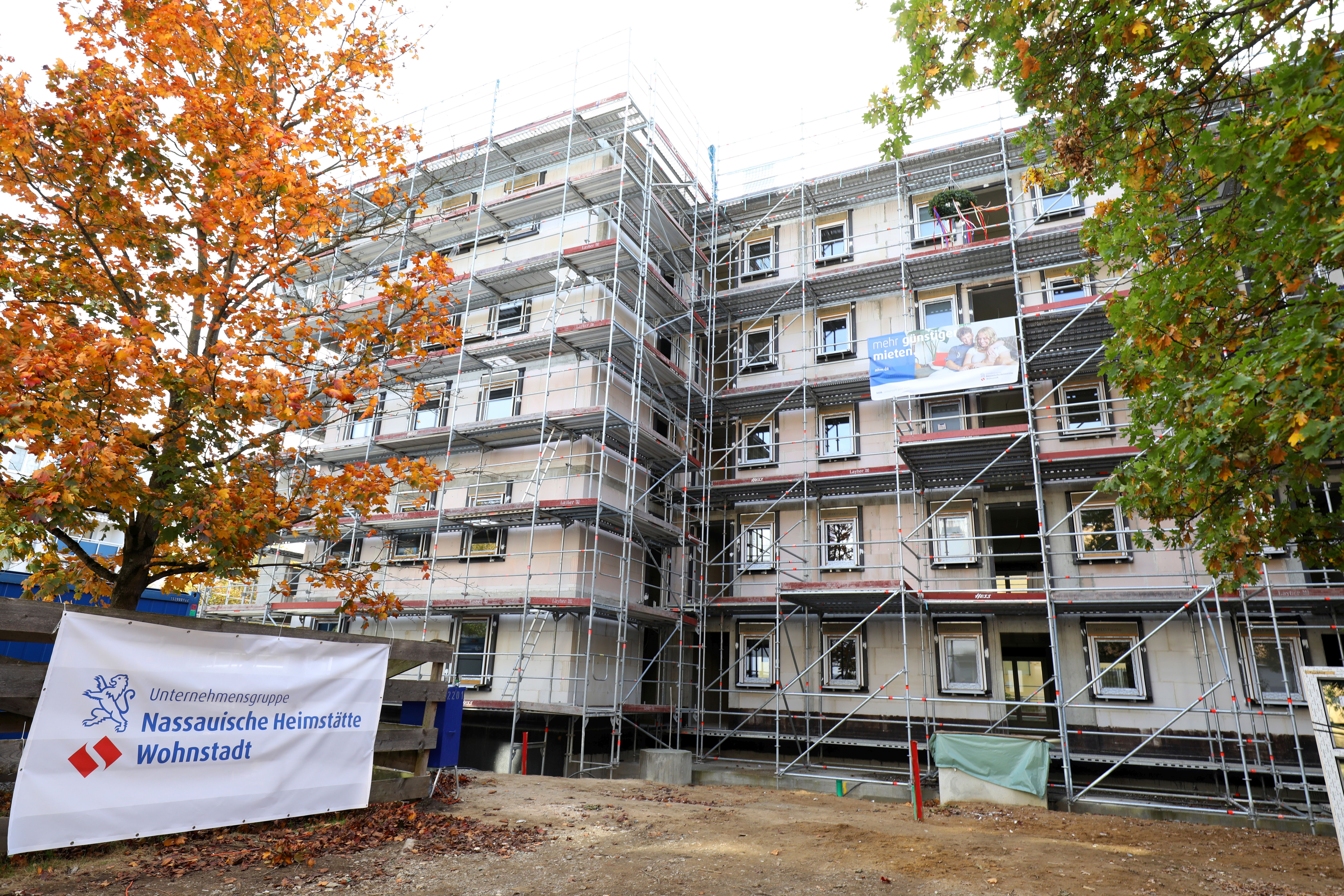 Die Unternehmensgruppe Nassauische Heimstätte | Wohnstadt (NHW) baut in der Adolf-Miersch-Siedlung in Frankfurt-Niederrad ein Mehrfamilienhaus mit insgesamt 39 Wohneinheiten – davon 15 gefördert. Außerdem entsteht dort eine Tiefgarage mit 14 Stellplätzen / Richtfest mit Marcus Gwechenberger, Dezernent für Planen und Wohnen.