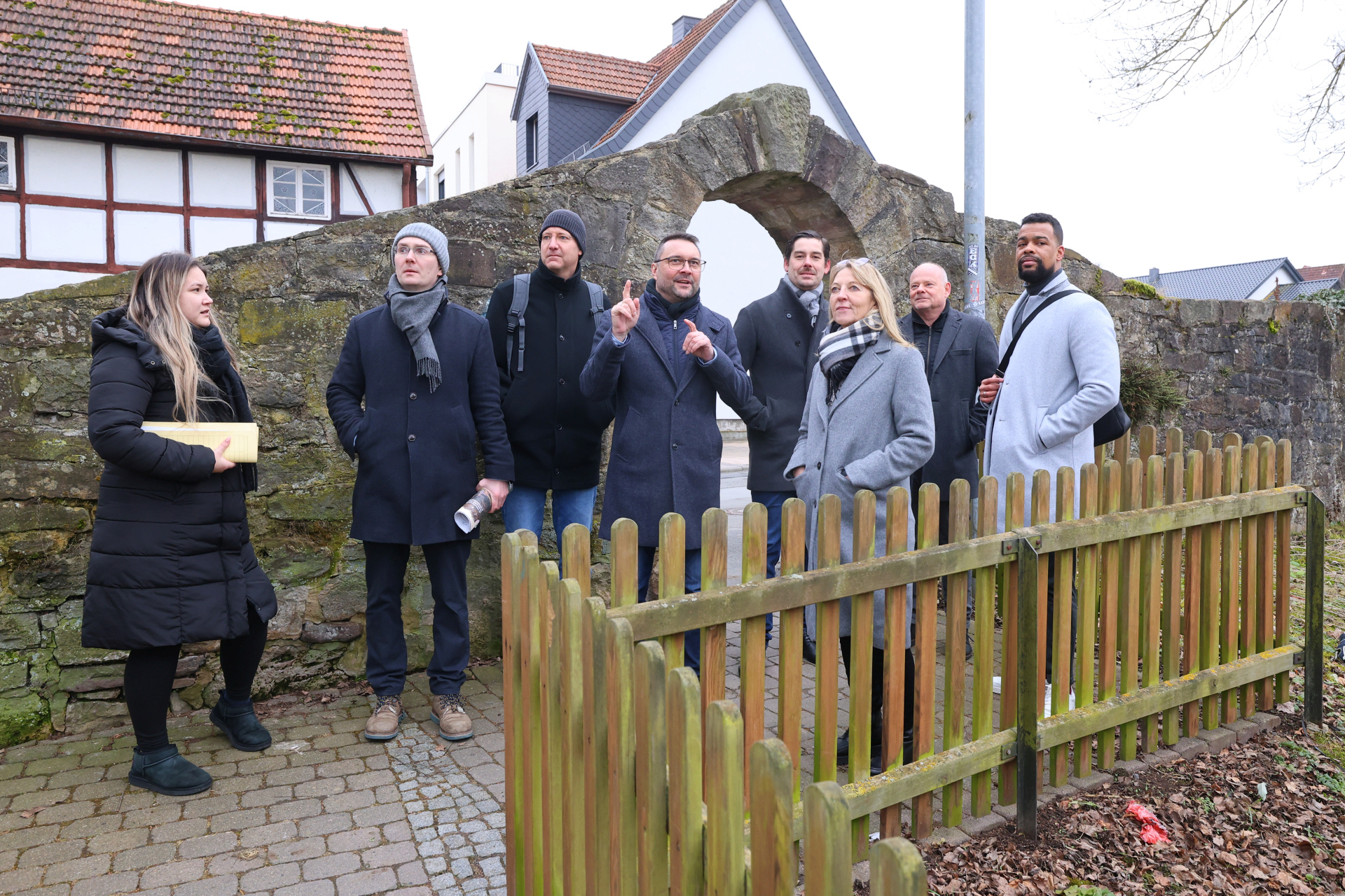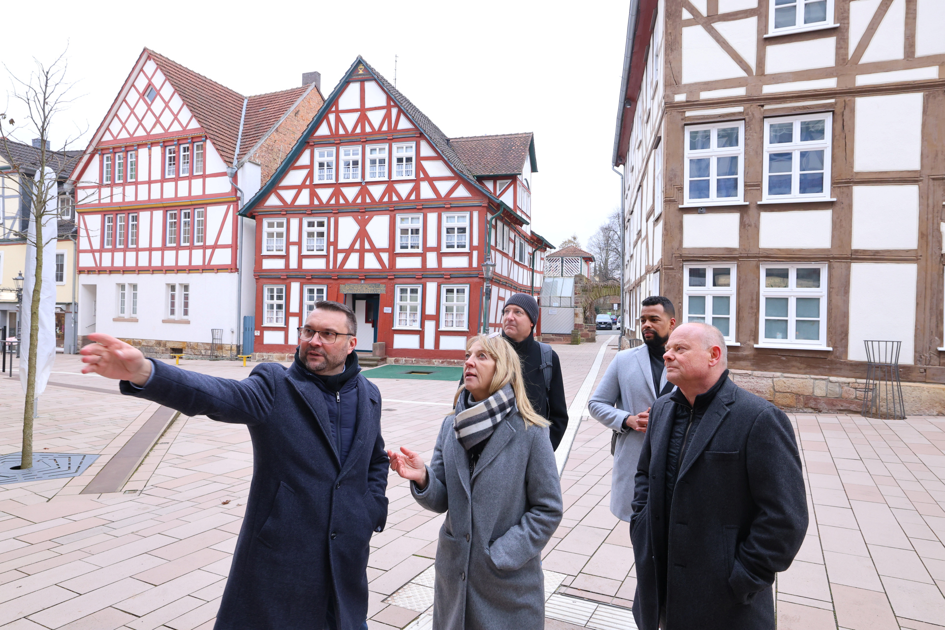 Vor Ort waren Karin Jasch, Referatsleiterin im Ministerium, Andrej Müller, verantwortlich für das Programm „Lebendige Zentren“, Vertreter der Hessen Agentur, Bürgermeister Torben Busse, Bauamtsleiter Dirk Lindemann sowie von der ProjektStadt Ulrich Türk, Leiter des Fachbereichs Stadtentwicklung Hessen Nord, und Projektleiter Marvin Coker. Die Stadtentwicklungsexperten der Unternehmensgruppe Nassauische Heimstätte | Wohnstadt sind im Auftrag der Kommune für das Fördergebietsmanagement zuständig und maßgeblich dafür verantwortlich, dass 2024 rund 3,34 Millionen Euro an Fördergeldern an die Stadt bewilligt wurden – die höchste Einzelförderung in diesem Programm.