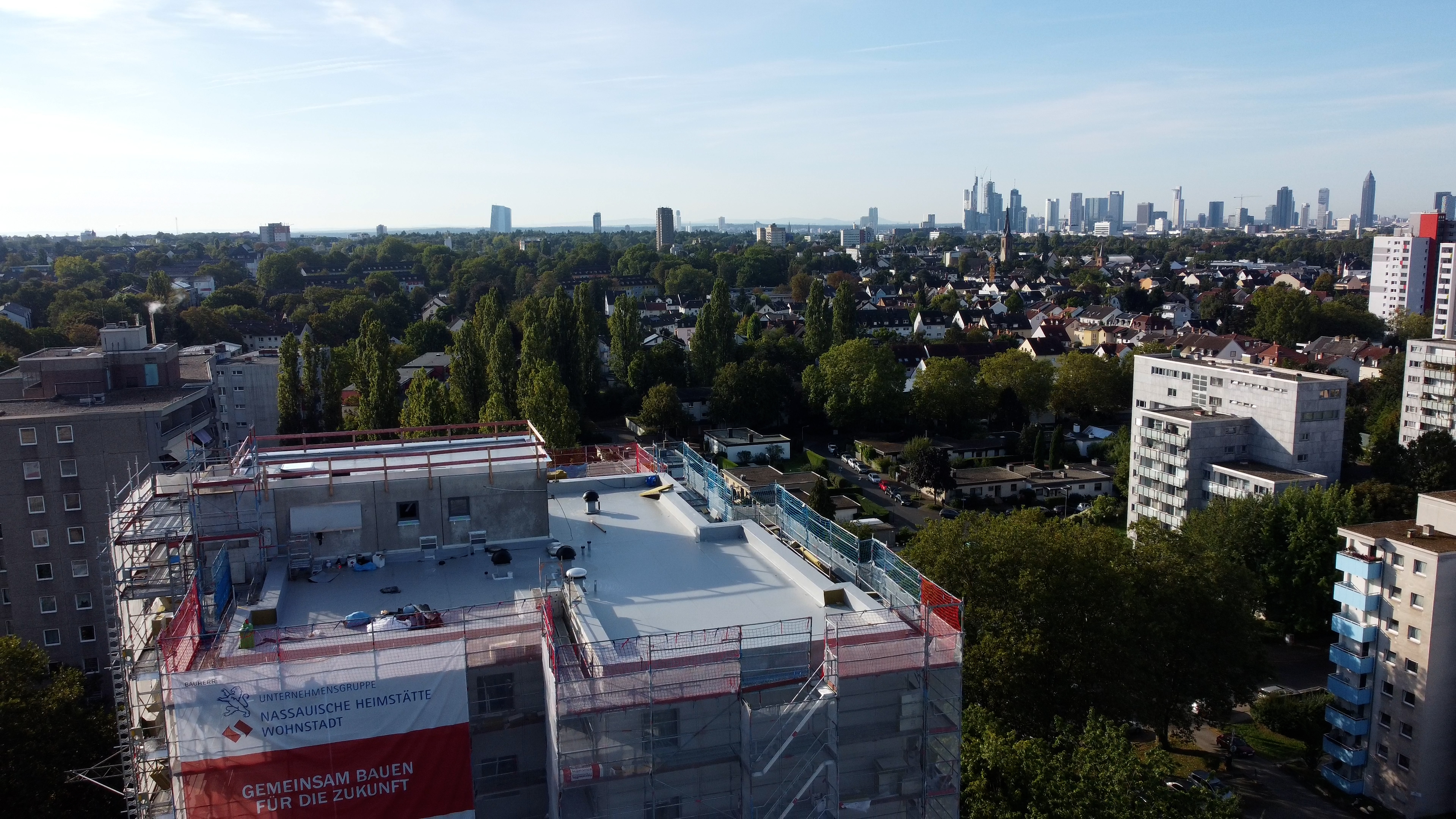 Im Zuge des Modernisierungsprogramms für mehr Klimaschutz modernisiert die Unternehmensgruppe Nassauische Heimstätte | Wohnstadt (NHW) seit März dieses Jahres zwei Hochhäuser in der Sigmund-Freud-Straße 119-121 energetisch, um den KfW Effizienzhaus 55-Standard zu erreichen. Vordringlichstes Ziel ist dabei die Reduktion der CO2-Emissionen um 75 Prozent und der Einsatz erneuerbarer Energien bei der Wärmeerzeugung. Unter anderem wurden bereits Fenster mit einer Dreifach-Verglasung eingebaut, die Fassaden erhalten ein Wärmedämmverbundsystem. „Damit sparen die Mieter zukünftig erheblich Energiekosten fürs Heizen, was bei den steigenden Energiepreisen ein nennenswerter Vorteil gegenüber dem ungedämmten Bestand ist“, so der Leiter des zuständigen NHW-Servicecenters, Wolfgang Koberg. „Die Balkone werden für den Umbau betonsaniert, damit bliebt die bestehende Balkonbrüstung erhalten. Zusätzlich wird eine Glasfaltwand eingebaut, um die ganzjährige Nutzung des Balkons zu ermöglichen. Die so gewonnene Wärme der Sonne schlägt sich einerseits positiv auf die Ökobilanzierung nieder, andererseits steigern wir damit auch den Wohnkomfort für die Bewohner. Das Flachdach erhielt ebenfalls eine Wärmedämmung und eine neue, hochwertige Abdichtung“, so Koberg.