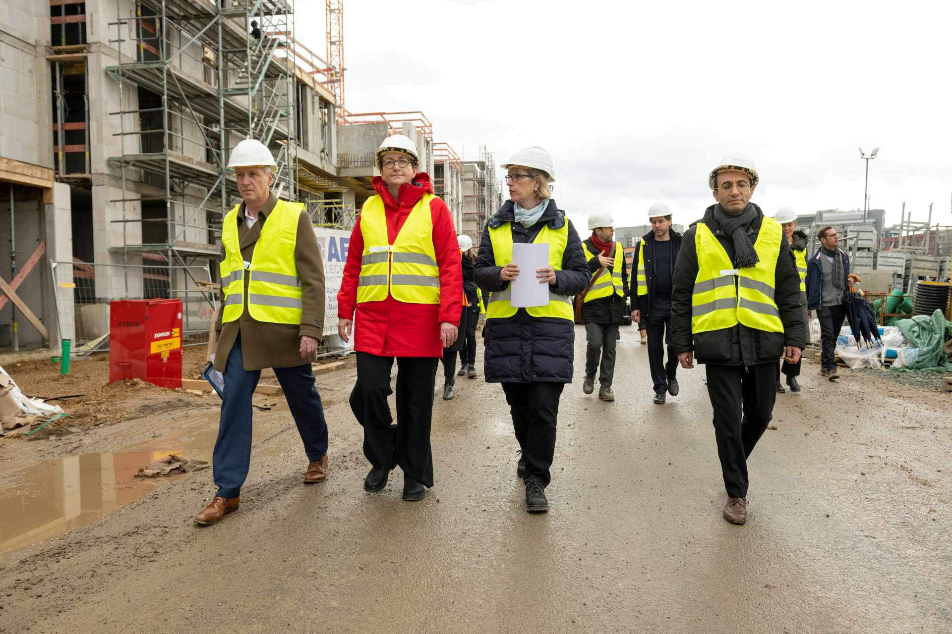 Bundesbauministerin Klara Geywitz hat am Montag, 13. März, zusammen mit Planungsdezernent Mike Josef, dem Leitenden Geschäftsführer der NHW, Dr. Thomas Hain und NHW-Geschäftsführerin Monika Fontaine-Kretschmer einen Baustellenrundgang im Schönhof-Viertel gemacht. Dabei konnte sich die Ministerin davon überzeugen, wie zukunftsweisendes Bauen und eine tragfähige Quartiers- und Wohnentwicklung in der Großstadt funktioniert.