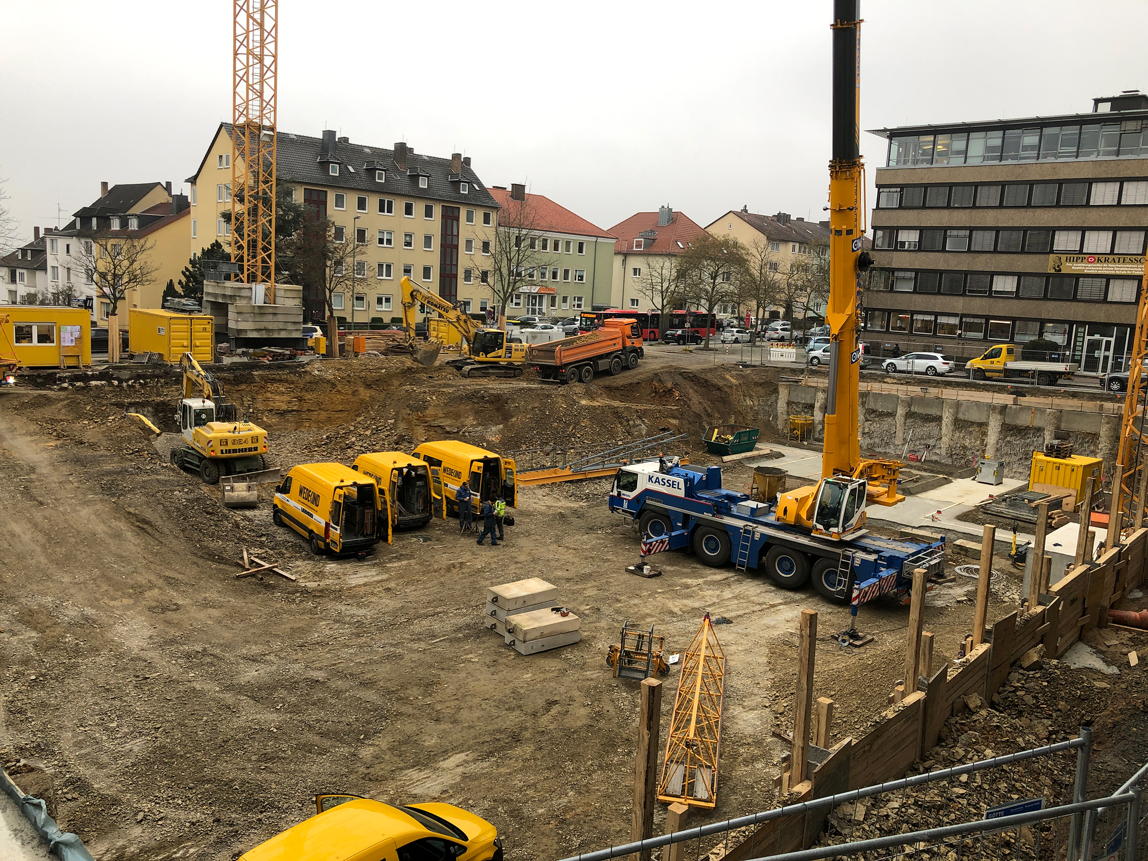 Das neue Gebäude wird in U-Form als Blockrandbebauung an der Ecke Kölnische Straße/Uhlandstraße realisiert. Die bis zu fünf Geschosse sind nach oben hin gestaffelt und bilden zu den Anliegerstraßen eine geschlossene Front. Durch die U-Form entsteht ein Innenhof, der den künftigen Mietern Erholungs- und Rückzugsflächen bietet. Die 47 frei finanzierten und 13 geförderten Mietwohnungen des MartiniTor sind zwischen 48 und 93 qm groß, bieten rund 3.770 qm Wohnfläche und richten sich an unterschiedliche Zielgruppen. Das Spektrum reicht von der Zwei-Zimmer-Wohnung für Singles und Paare bis hin zur Vier- und Fünf-Zimmer-Wohnung für Familien mit einem oder zwei Kindern. Alle Wohnungen haben einen barrierefreien Zugang und erhalten einen Balkon. Die Miete wird voraussichtlich zwischen 6,50 und 10,50 Euro betragen. Die drei Gewerbeeinheiten im Erdgeschoss haben eine Nutzfläche von etwa 480 qm. In eine davon wird eine Bäckerei mit Café einziehen, die Mieter der übrigen Gewerbeeinheiten stehen noch nicht fest. Hinzu kommt eine Tiefgarage mit 44 Stellplätzen. Darüber hinaus werden zwei Carsharing-Plätze zur Verfügung gestellt. Insgesamt investiert die Unternehmensgruppe rund 16 Millionen Euro in das Projekt. Um Zeit und Geld zu sparen, werden Fertigteilwände aus Beton als Trennwände eingesetzt und die Außenwände aus großformatigen Kalksandsteinen gemauert. Der felsige Untergrund sowie die beengten Verhältnisse stellen darüber hinaus eine besondere Herausforderung für die Bauherren dar. Läuft auch weiterhin alles nach Plan, können die ersten Mieter im Jahr 2022 einziehen. „Im Martini-Quartier entsteht ein vielfältiges und modernes Quartier zum Wohnen, Arbeiten und Wohlfühlen“, sagt NHW-Regionalcenterleiter Jürgen Bluhm. „Mit dem MartiniTor leisten wir gerne unseren Beitrag dazu, dass es in guter Lage von Kassel zu einer möglichst großen Nutzungsmischung sowie einer sozialen Vielfalt kommt – und das zu einem bezahlbaren Mietpreis.“