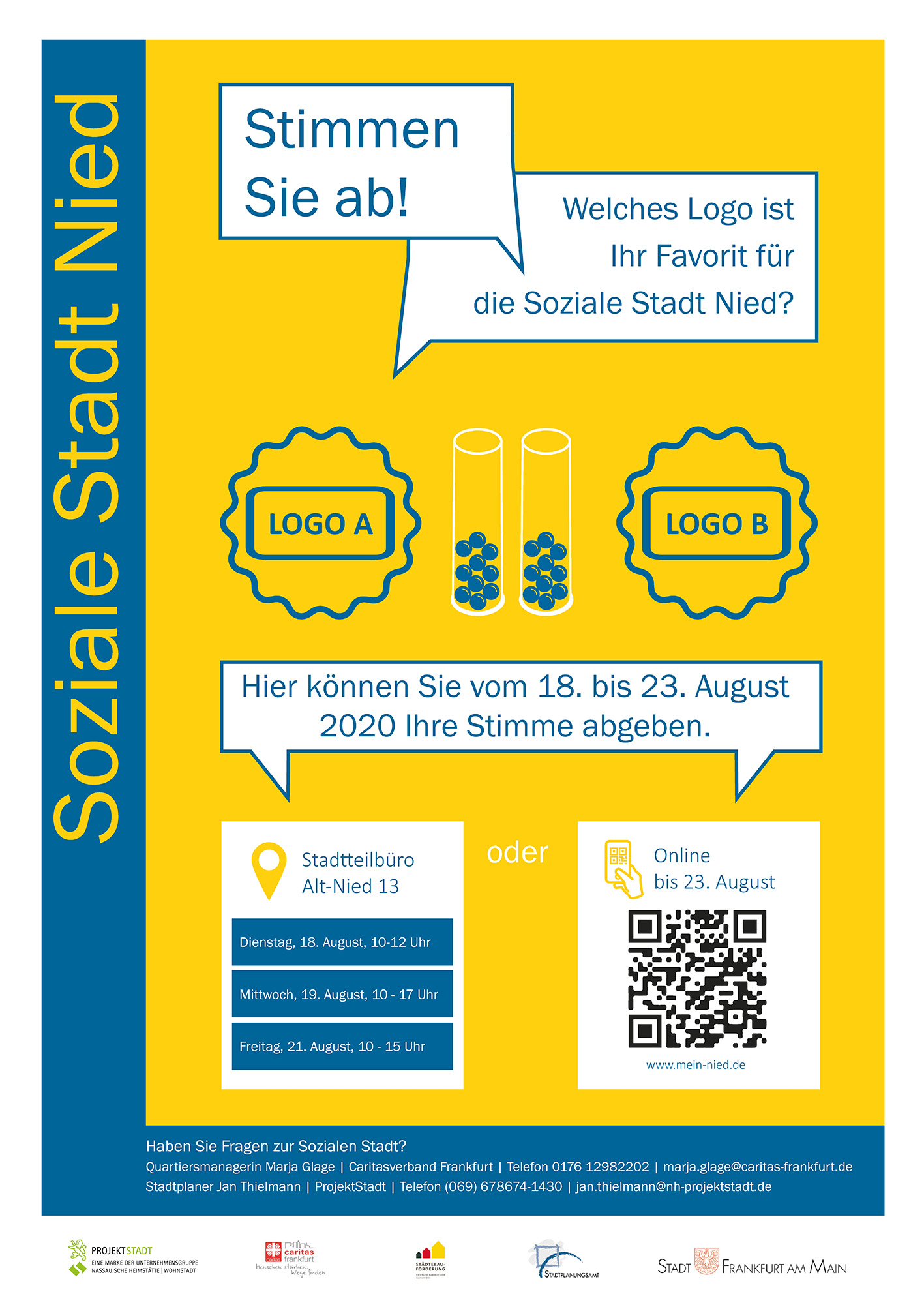 Zwei Logo-Entwürfe werden in der öffentlichen Sitzung des Stadtteilbeirats um 18 Uhr im Gemeindesaal von St. Markus in der Mainzer Landstraße 787 vorgestellt und diskutiert. Pandemiebedingt ist zur Teilnahme eine Anmeldung unter 0176/12982202 erforderlich. Danach können alle Nieder für ihr Logo abstimmen. Das Stadtteilbüro in Alt-Nied 13 ist für die Wahl Dienstag von 10 bis 12 Uhr, Mittwoch von 10 bis 17 Uhr und Freitag von 10 bis 15 Uhr geöffnet. Dort stehen zwei Demokratiesäulen mit den Logos zur Auswahl, in die jedes Kind und jeder Erwachsene aus Nied einen Ball einwerfen kann. Parallel dazu ist die Online-Abstimmung ist unter mein-nied.de bis zum 23. August 2020 möglich.