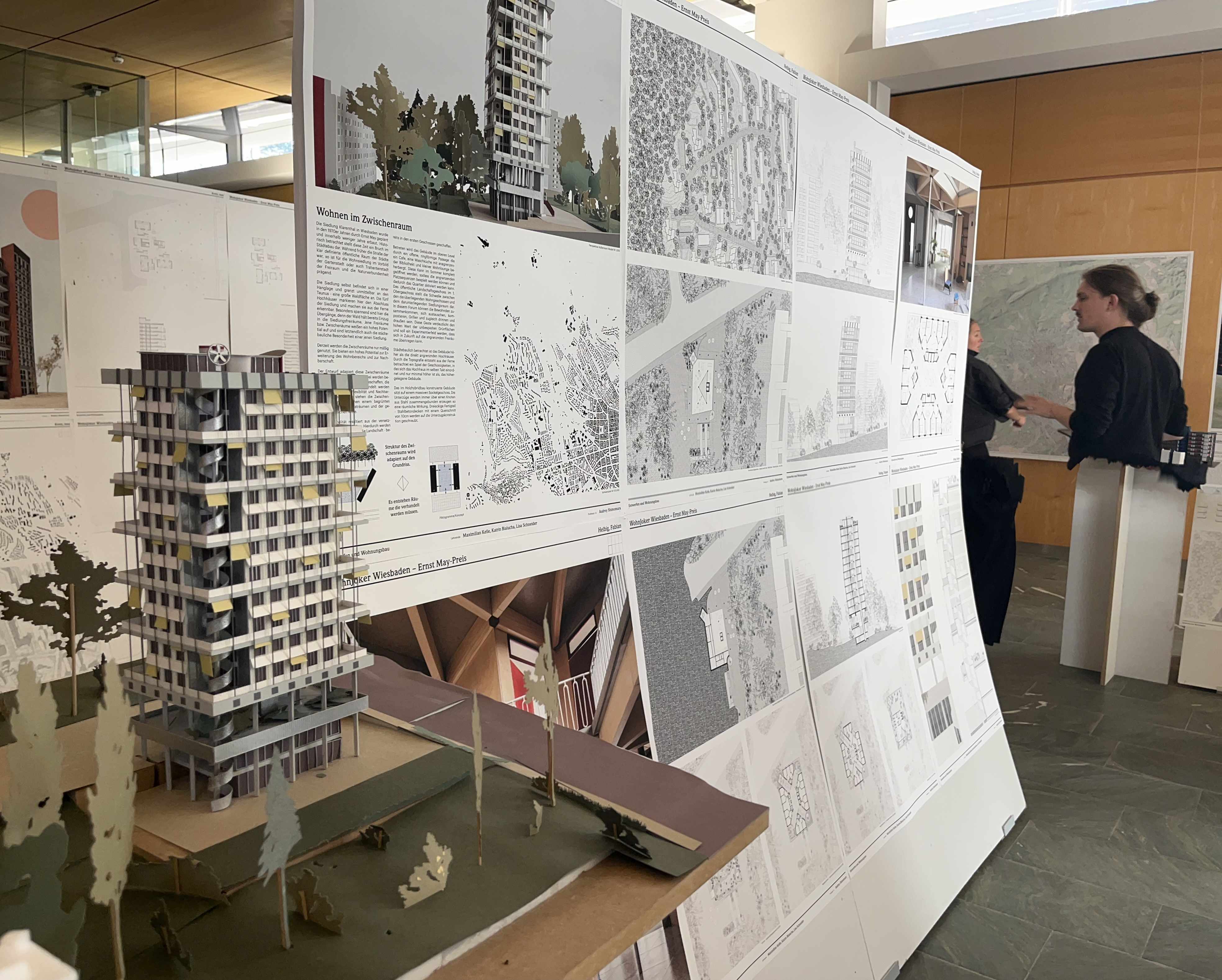 Die Unternehmensgruppe Nassauische Heimstätte | Wohnstadt (NHW) setzt gemeinsam mit der TU Darmstadt, Fachgebiet für Entwerfen und Wohnungsbau, eine 30 Jahre alte Tradition fort. Nach der coronabedingten Pause vergab die NHW zum 16. Mal den Ernst-May-Preis (EMP). Der EMP wird seit 1988 im Zwei-Jahres-Turnus für Studierende der TU Darmstadt ausgelobt, das Preisgeld in Höhe von 10.000 Euro stiftet die NHW. Dieses Jahr stand der Preis unter dem Titel WohnJoker für die Großwohnsiedlung Klarenthal in Wiesbaden. Die Gewinner-Arbeiten sind nun im Stadtplanungsamt Wiesbaden ausgestellt. In Anwesenheit von Professorin Audrey Shimomura, Leiterin Fachgebiet Entwerfen und Wohnungsbau an der TU Darmstadt, NHW-Geschäftsführerin Monika Fontaine-Kretschmer und Camillo Huber-Braun, Leiter des Stadtplanungsamtes Wiesbaden wurde die Ernst-May Preis Ausstellung im Stadtplanungsamt Wiesbaden eröffnet.