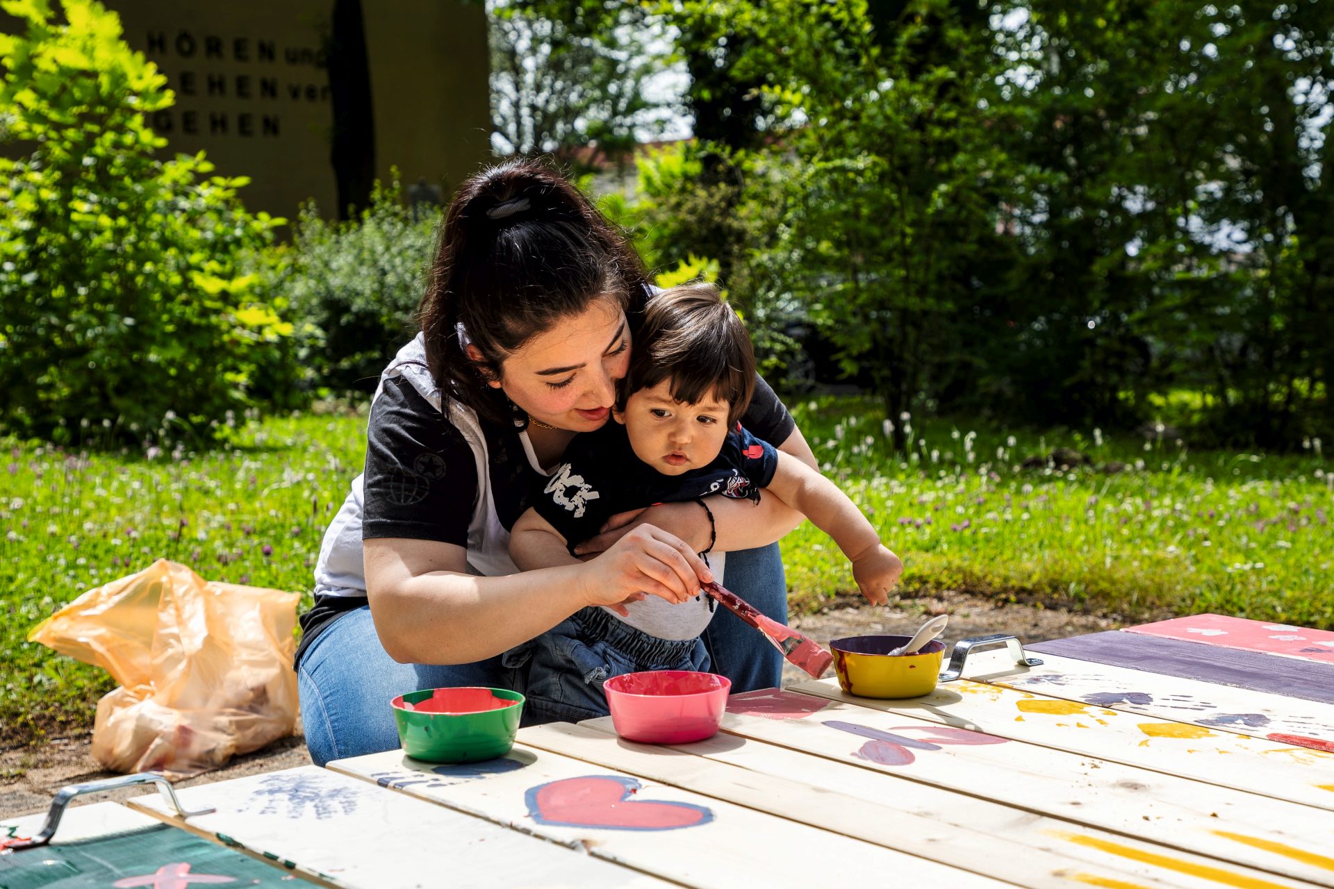 Mit einer Malaktion haben die Bewohnerinnen und Bewohner ihr Quartier zusätzlich aufgewertet. Bei Kuchen, Snacks und Getränken gestalteten mehrere Familien die vorab in der Werkstatt vorbereitete Abdeckung des Sandkastens in schillernden Farben mit Blumen, Sonnen und allerlei anderen Motiven.