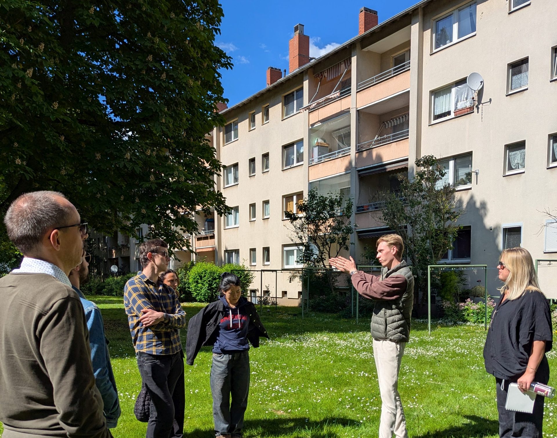 Stephan Kuger, Architekt bei der NHW, gab den Studierenden, ihrem Professor Dr. Martino Tatarra sowie den wissenschaftlichen Mitarbeitenden Max Kelle und Kathrin Bialucha einen 30-minütigen Überblick über die städtebaulichen und architektonischen Besonderheiten der jeweiligen Dekaden und ergänzte dies durch seine Einschätzung zur Entwicklung und Bedeutung einzelner Typologien im Frankfurter Bestand der NHW. Darüber hinaus skizzierte er, warum eine Transformation der Wohntypologien aus der Nachkriegszeit oft schwierig ist und ging auf einen Versuch des Weiterbaus durch die NHW im Frankfurter Riederwald ein.