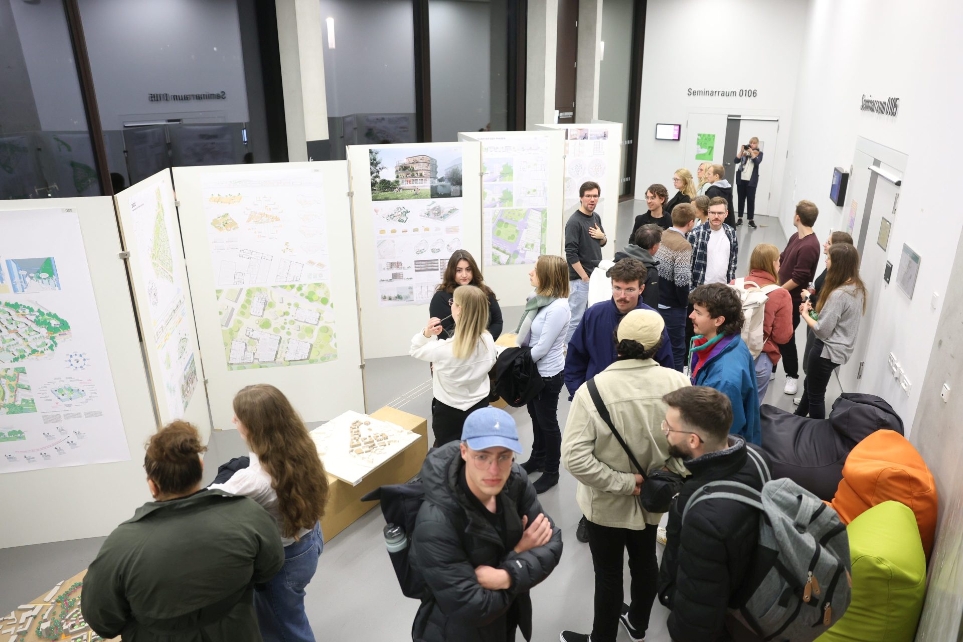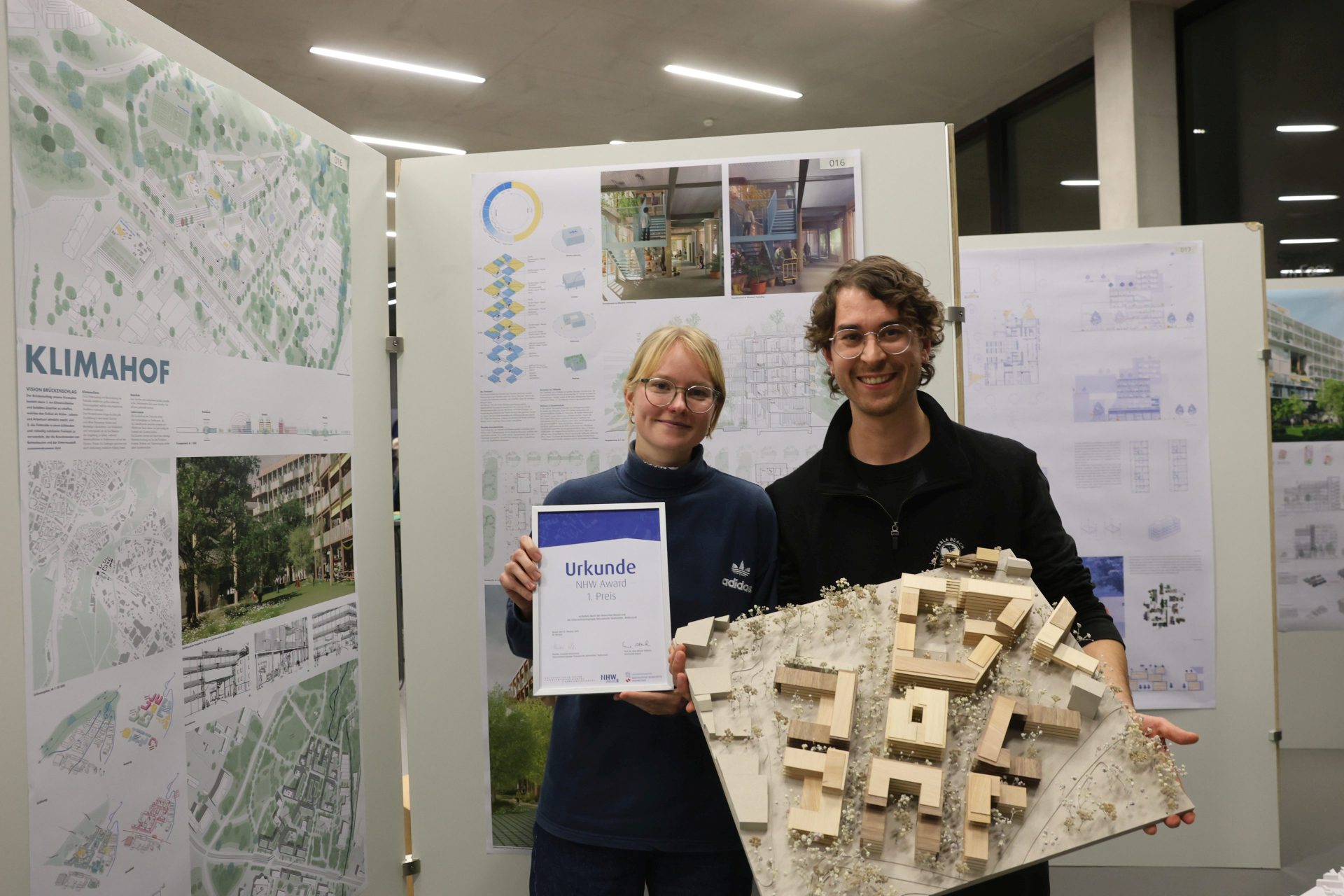 Insgesamt haben sich 160 Studierende mit der Aufgabenstellung auseinandergesetzt. 18 Arbeiten wurden eingereicht, die meist mehrere Studierende im Team interdisziplinär bearbeitet haben. Eine schwierige Aufgabe für die Jury, die sich schließlich einstimmig für zwei erste Plätze entschied. Elina Klett und Tom Stehmann überzeugten mit ihrem Projekt Klimahof, Celina Ebbert und Paul Fleckenstein mit OSTKAS. Den dritten Platz belegten Alissa Kohlstädt, Johanna Sauerwein, Laura Hilverkus und Tom Niemeier mit ihrem Projekt mischroom. Anerkennungen gingen an Ilona Jarmolowitsch und Meryem Düzova (RE:CONNECT), Markus Grote und Moritz Friedrich Reh (WohnWerk Stadt), Antonia Lüdicke und Mira Irmer (Konnektiv) sowie Zoé Schütte und Maximilian Schirmer (Vernetzung).