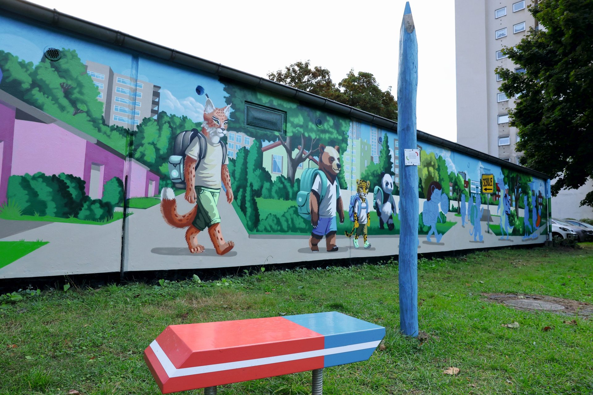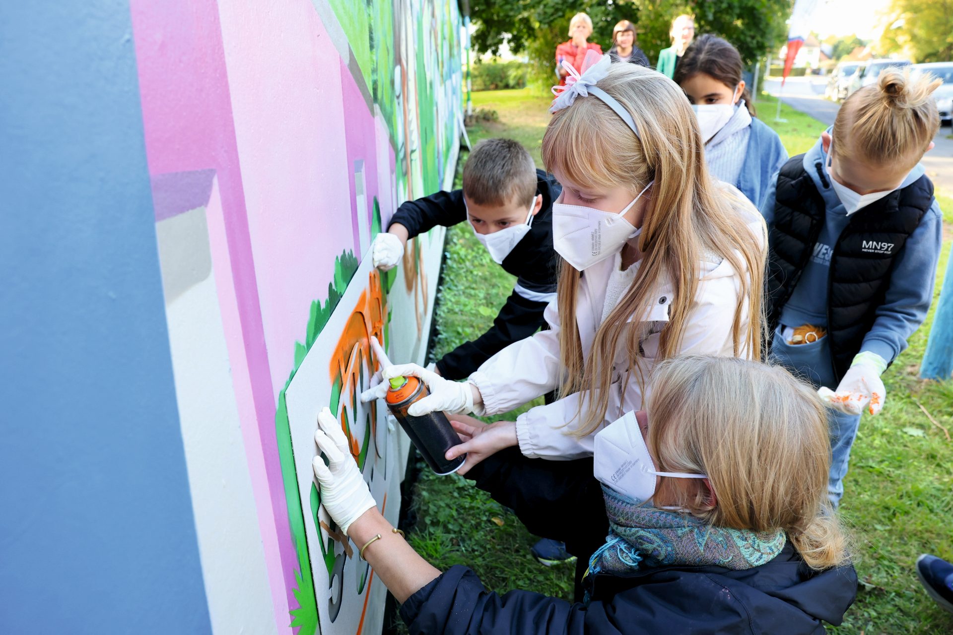 Hessens größtes Wohnungsunternehmen hat darüber hinaus die triste Garagenwand hinter der Haltestelle in der Waldemar-Petersen-Straße mit einem riesigen Graffiti verschönert. Die Künstler Dana Bormann und Sander Bartel verwandeln im Lauf des Septembers zusammen mit Schüler:innen der Grundschule Waldau die Rückseite des Garagenkomplexes in ein farbenfrohes, mehrere Meter langes Kunstwerk. Das Wandbild zeigt Tiere, die gemeinsam zur Schule gehen, und soll eine Aufbruchsstimmung vermitteln. Die Motive hatten Grundschüler:innen während der Sommerferien in einem Workshop mit Bormann erarbeitet. Unterstützung kommt zudem von der ortansässigen Malerfirma Bong, die die Fläche kostenfrei grundiert hat und im Nachgang den Wand- und Graffitischutz aufbringt. „So konnten die Schüler:innen den Ort mitgestalten, an dem sie sich morgens auf dem Weg zur Schule treffen“, sagt Alexander Hauschild. „Das sorgt für eine höhere Identifikation mit der Nachbarschaft und ist eine tolle Erfahrung in Sachen Kreativität und Selbstwirksamkeit.“ Zusätzlich wertet das Wandbild das Quartier weiter auf – ein rundum gelungenes Gemeinschaftsprojekt als Resultat der hervorragenden Zusammenarbeit zahlreicher lokaler Akteur:innen.