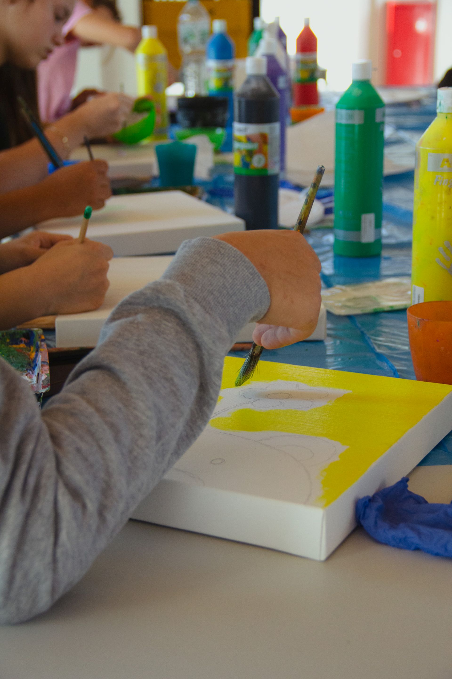 Das Anliegen dieses zweitägigen Workshops bestand darin, das unscheinbare Trafohaus gegenüber dem Bürgertreff zusammen mit den jungen Bewohner:innen optisch aufzuwerten: Das Trafohaus sollte zu einem einladenden Willkommensschild für das Quartier umgestaltet werden. Unter der professionellen Leitung durch den Designer Jansen erhielten die 14 teilnehmenden Kinder und Jugendlichen eine einführende Lektion in die Welt der Graffitikunst und wurden anschließend mit Handschuhen und Masken ausgestattet, um sicher in das kreative Abenteuer einzutauchen. Dabei lernten die Teilnehmenden verschiedene Sprühtechniken und Ansätze zur Gestaltung kennen. Der Workshop bot eine besondere Mischung aus Graffitikunst und einem selbstständigen Kunstprojekt. Während Jansen spezielle Motive für die Kinder und Jugendlichen vorbereitete, hatten sie die Gelegenheit, kleine Leinwände mit Motiven ihrer eigenen Fantasie zu bemalen und eine Erinnerung zu schaffen, die mit nach Hause genommen werden konnte.