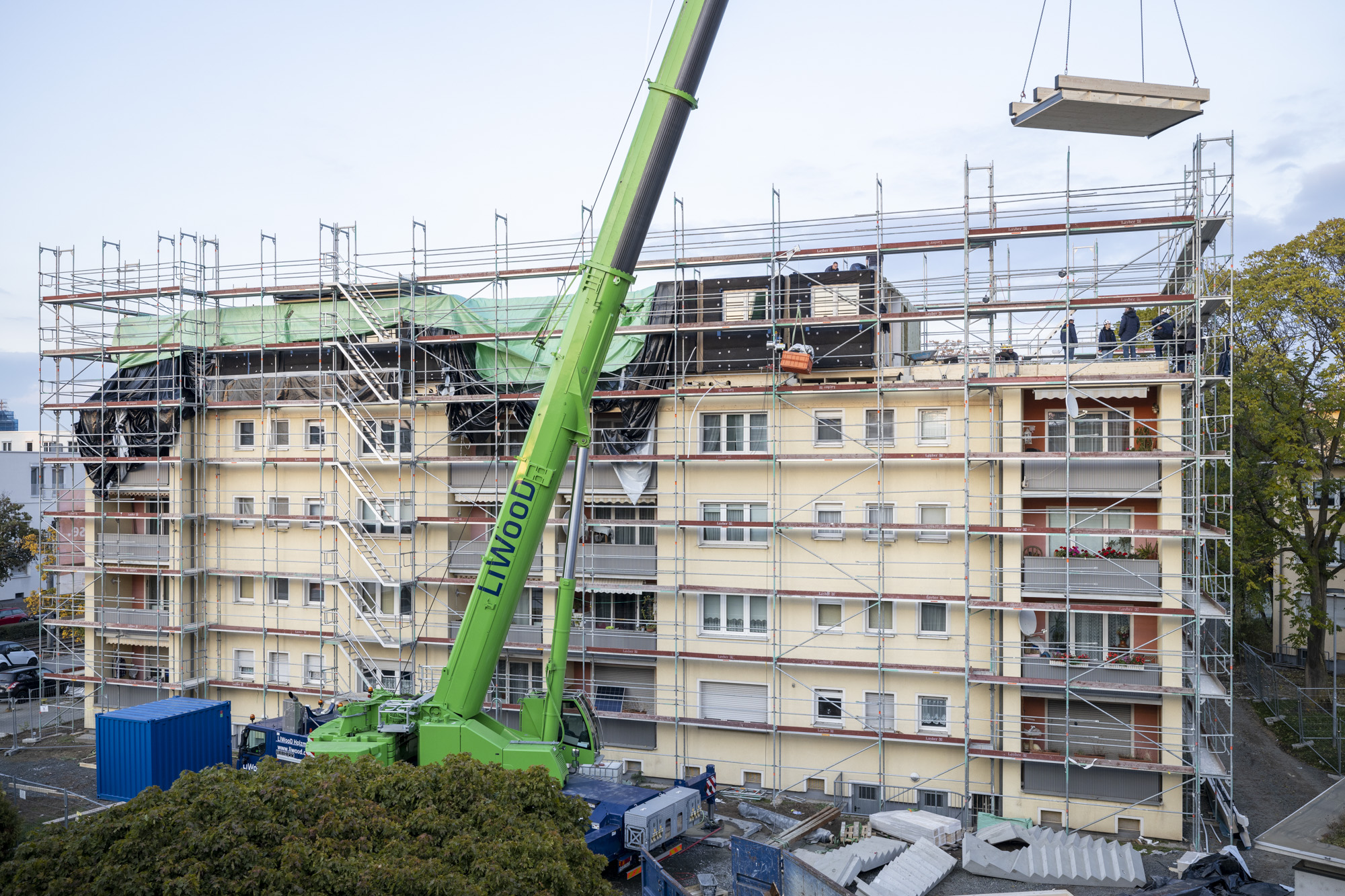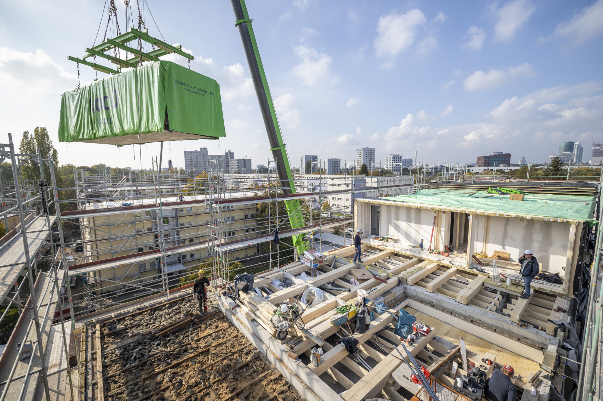 Neun von 14 Häusern in der Fritz-Kissel-Siedlung sind bereits mit Modulen aus Holz aufgestockt, sie beinhalten 40 von 82 geplanten Wohnungen – so lautet die Zwischenbilanz der Unternehmensgruppe Nassauische Heimstätte I Wohnstadt (NHW), die die große Frankfurter Nachkriegssiedlung seit September letzten Jahres aufstockt.