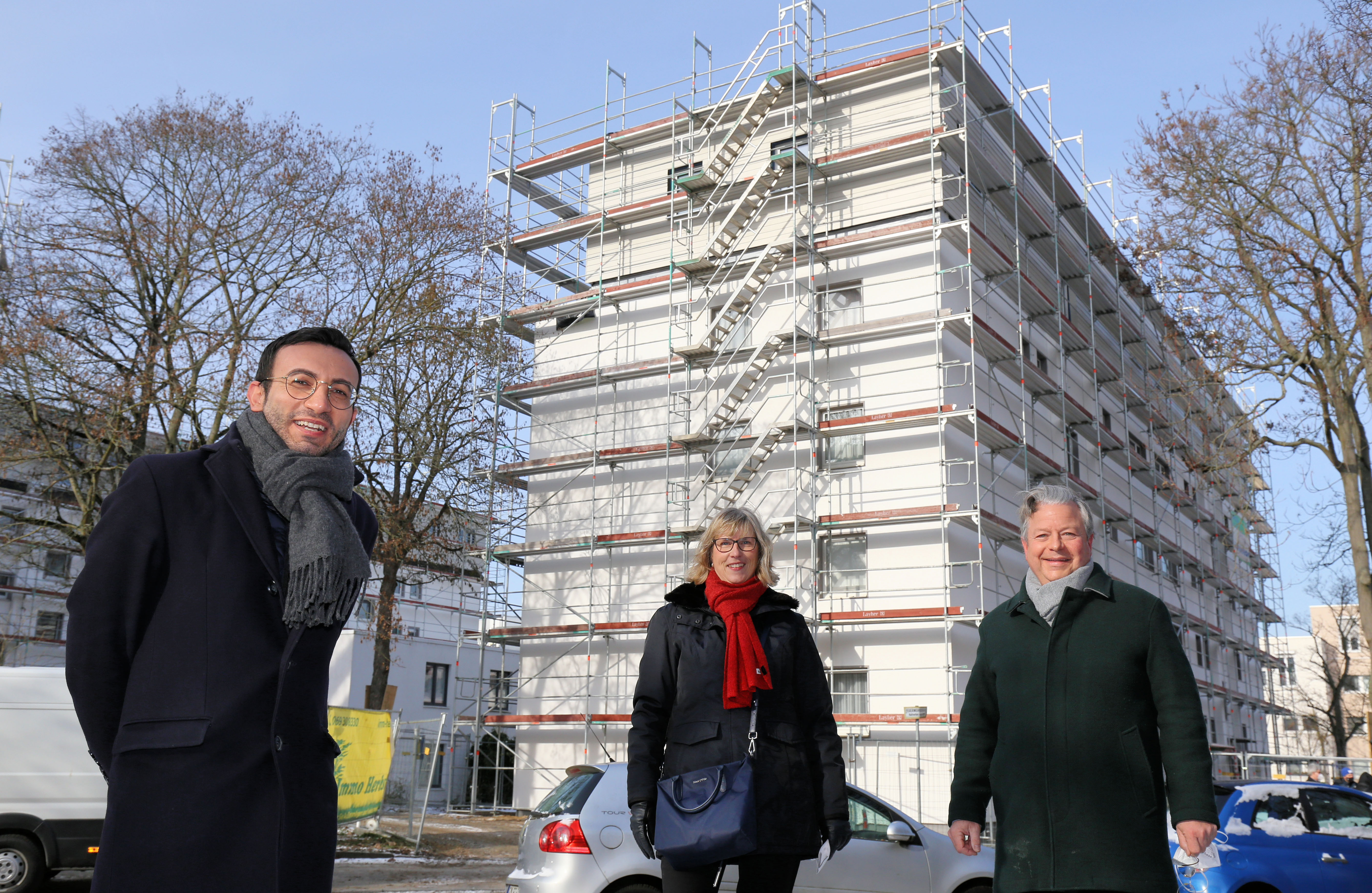 Knapp die Hälfte der neuen Wohnung hat die NHW im Zuge der Aufstockung der Fritz-Kissel-Siedlung in Frankfurt-Sachsenhausen bisher fertiggestellt. Jetzt besuchten zwei NHW-Geschäftsführer und Frankfurts Planungsdezernent Mike Josef die Baustelle.
