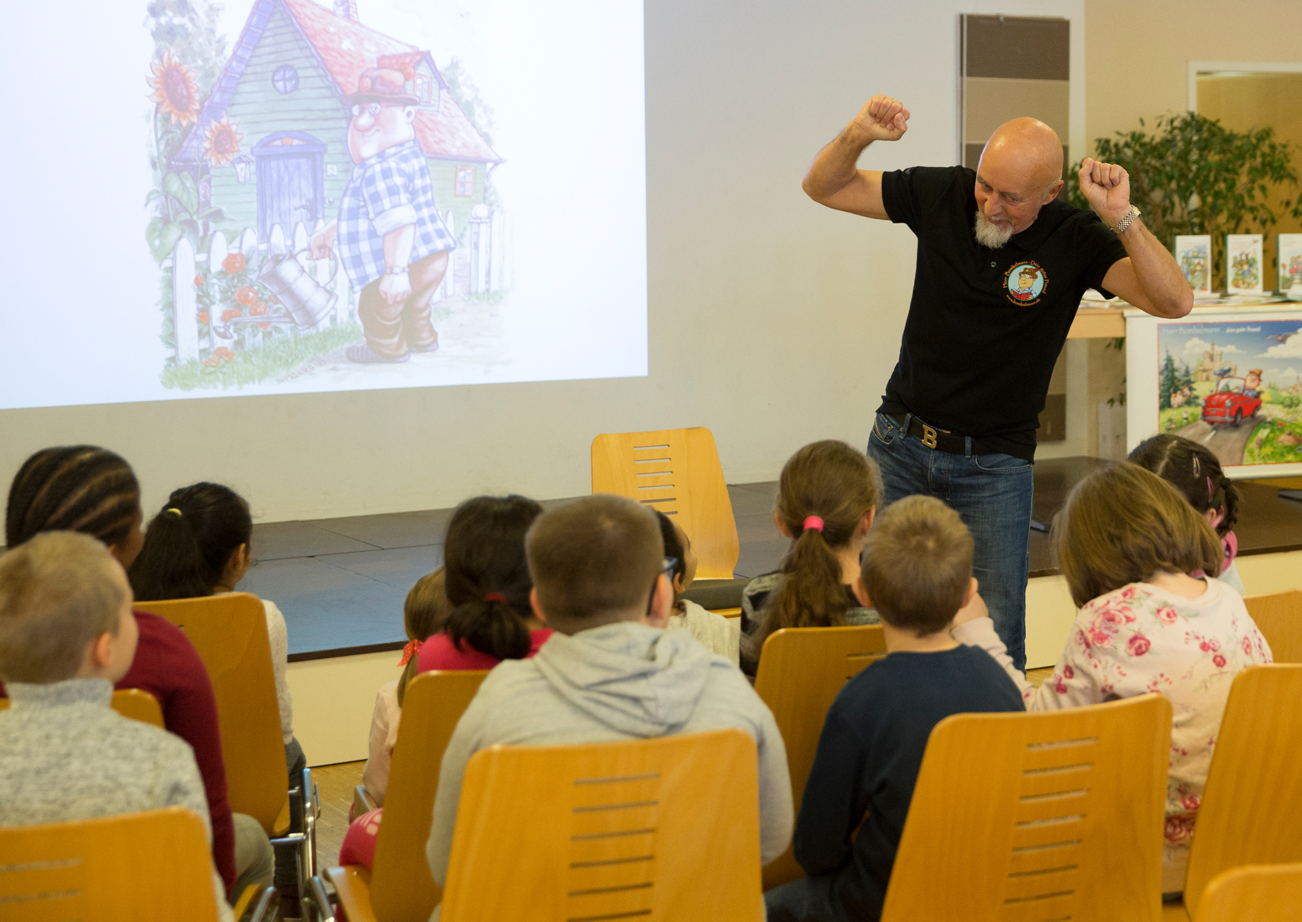 Ein Glücksfall also, dass der gefragte Vorleser Wolfgang Lambrecht, der in jedem Jahr zahlreiche Grundschulen besucht, der Einladung ins Bürgerzentrum Aschenberg gefolgt ist. Denn ihm gelingt es auf unangestrengte Weise, in seine Geschichten jede Menge nützliches Weltwissen zu verpacken. So lernen die Kinder durch Herrn Bombelmann viel über die Kontinente der Erde, über deren Klima, Vegetation und Ureinwohner, und bekommen nebenbei auch wichtige Naturphänomene erklärt. Auch Sebastian Claaßen, der von Seiten der AWO den Bücherspielplatz betreut, freut sich über den Besuch von Herrn Bombelmann und seinem Autor: „Wolfgang Lambrecht ist ein Vorlese-Profi. Er kann sich bei seinen kleinen Zuhörern sehr gut auf die jeweilige Altersgruppe einstellen. Außerdem trägt er seine Geschichten so lebendig vor, dass es ihm im Handumdrehen gelingt, alle Kinder zu fesseln und auf seine Ausflüge ins Land der Phantasie mitzunehmen.“