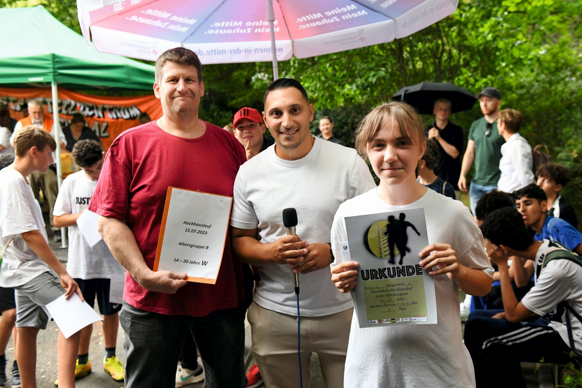 Michael Koch, Vorstandsvorsitzender des Klarenthaler Dachverbandes, überreichte den Siegern zusammen mit NHW-Servicecenterleiter Gökhan Toprak ihre Preise. Gökhan Toprak hatte zuvor die Läuferinnen und Läufer auf den letzten Metern engagiert angefeuert. „Der Hochhauslauf soll natürlich zuallererst den sportlichen Ehrgeiz bei den Klarenthalern wecken. Noch wichtiger ist es aber, dass wir hier eine Veranstaltung etabliert haben, die generationsübergreifend funktioniert und das soziale Miteinander stärkt.“ Carmen Neumann-Hofmann vom NHW-Sozialmanagement ergänzt: „Wenn es den einen oder anderen motiviert, öfter die Treppen anstatt den Fahrstuhl zu nutzen, haben wir schon ein großes Ziel erreicht. Außerdem fördert der Lauf die regionale Identifikation und den nachbarschaftlichen Zusammenhalt der Anwohner – ein wichtiges Anliegen für die NHW.“