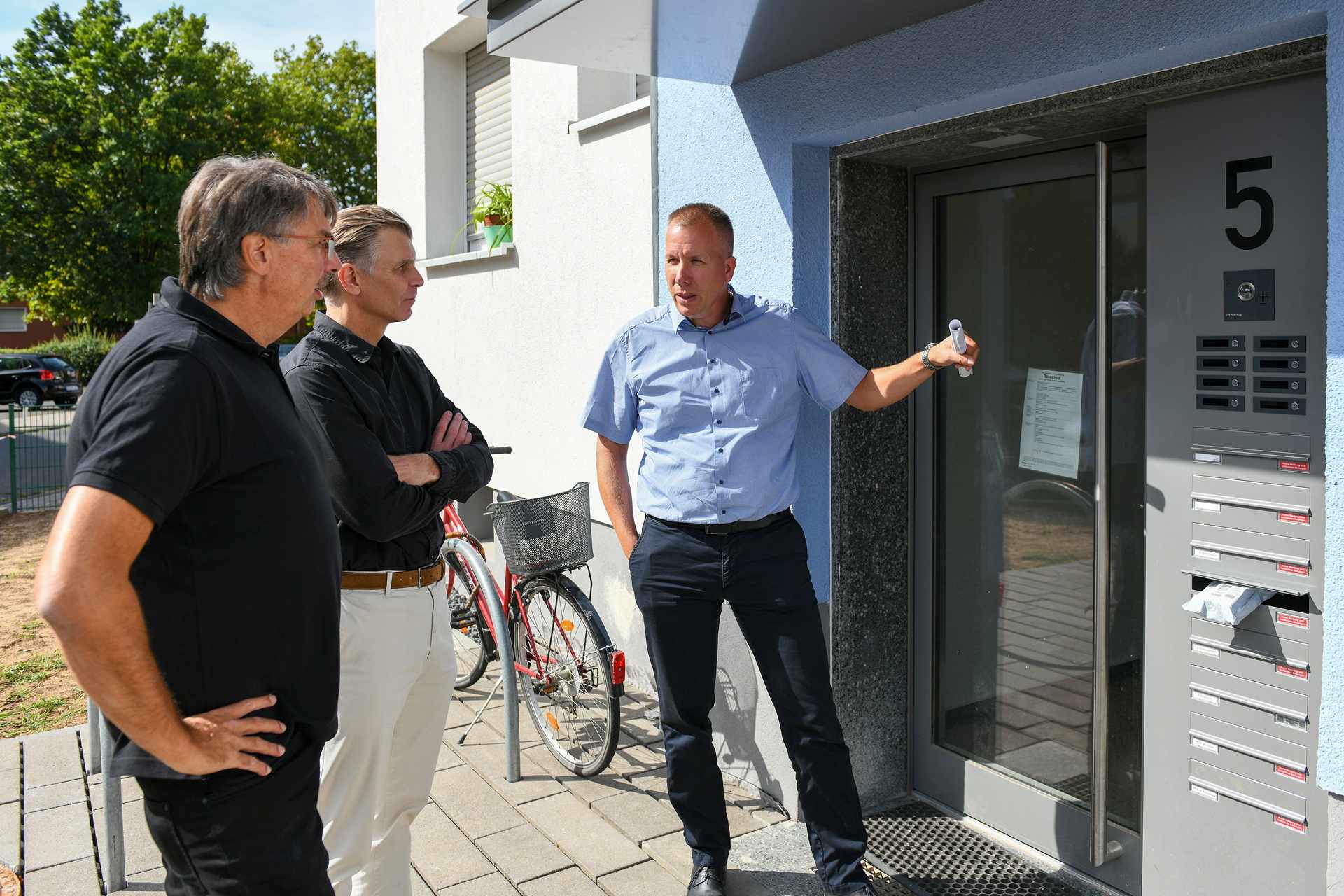 Dieses Bauprojekt ist in jeder Hinsicht vorbildlich. Durch diese Form der Nachverdichtung hat die Stadt Kelsterbach zusätzlichen Wohnraum von insgesamt 112 Quadratmetern Wohnfläche plus Balkone gewonnen, zudem wurden für die Aufstockung viele recycelte Materialien genutzt. „Bei Modernisierungen fallen sehr viele Wertstoffe an“, erklärt Robert Lotz, NHW-Fachbereichsleiter Modernisierung & Großinstandhaltung. Nun kann man diese wegwerfen – oder man verwertet sie, wie in der Dreieichstraße geschehen. Holzrahmenbauwände, Fenster, Balkonverkleidungen, Lichtschalterabdeckungen, der Dachstuhl und vieles mehr sind Recyclingprodukte. „Wir haben in der Dreieichstraße das erste Recyclinghaus in ganz Hessen geschaffen“, erklärt Lotz stolz. Ansehen tut man dies dem Haus aus dem Jahr 1965 nicht. Alles sieht neu aus – und ist es ja irgendwie auch. Nachhaltig und sparsam. Insgesamt wurden durch diese innovative Herangehensweise elf Tonnen CO2 und 50 Prozent Müll eingespart. Am erstaunlichsten scheint jedoch zu sein, dass der Bau trotzdem 500 Euro günstiger pro Quadratmeter wurde: „Wir konnten im Vergleich zu einem Bau mit komplett neuem Material mit den Recyclingmaterialien 500 Euro auf den Quadratmeter einsparen“, so Lotz. Da stellt sich die Frage, warum sich diese nachhaltige Bauweise noch nicht durchgesetzt hat. Das fragte sich wohl auch die Architektenkammer, die nun in der Folge ein Nachhaltigkeitspapier entwickelt. Die NHW geht in Sachen Nachhaltigkeit noch einen Schritt weiter. „Wir haben vor dem Haus eine Luft-Wärme-Pumpe installiert. Damit verzichten wir nicht nur auf den Bezug von Gas, sondern sind komplett unabhängig von fossilen Energien“, erklärt Tobias Bundschuh, NHW-Servicecenter-Leiter. Auch Bürgermeister Manfred Ockel, der gemeinsam mit Tobias Bundschuh und Robert Lotz die neu entstandenen Wohnungen besichtigte, lobt das Bauprojekt als sehr vorbildhaft und ist stolz, dieses in Kelsterbach zu sehen. Und auch in Sachen Naturschutz haben die Architekten mitgedacht. „Wir sind bei unseren Planungen in enger Absprache mit dem Naturschutzbund (NABU)“, so Lotz. „In den letzten zehn Jahren sind allein 75 Prozent der Insekten verschwunden. Wir haben eine Verpflichtung, uns mit dem Naturschutz auseinanderzusetzen.“ Und so findet man am Haus auch Einfluglöcher für Fledermäuse und fest verbaute Brutkästen für Mauersegler. Die erste der beiden Wohnungen mit jeweils 56 Quadratmetern ist bereits vermietet. Die zweite ist noch frei und ab Oktober werden im Gebäude gegenüber die ebenfalls aufgestockten zwei Wohnungen mit jeweils 75 Quadratmetern zur Vermietung fertig sein.