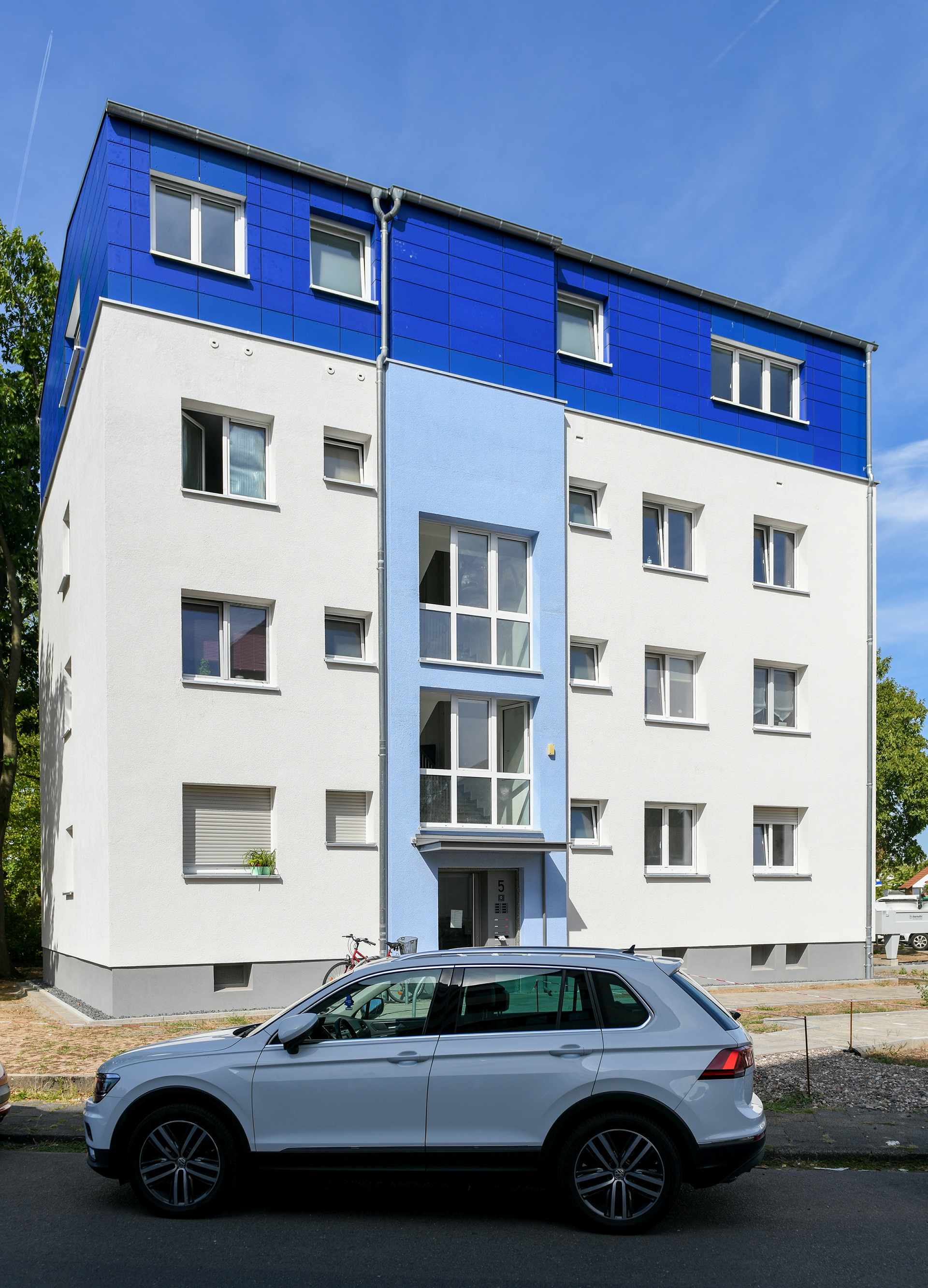 Das jüngste Vorzeigeobjekt der Unternehmensgruppe Nassauische Heimstätte | Wohnstadt ist das Haus Nummer 5 in der Dreieichstraße in Kelsterbach. In dem Bestandshaus wurden viele recycelte Materialien verbaut.
