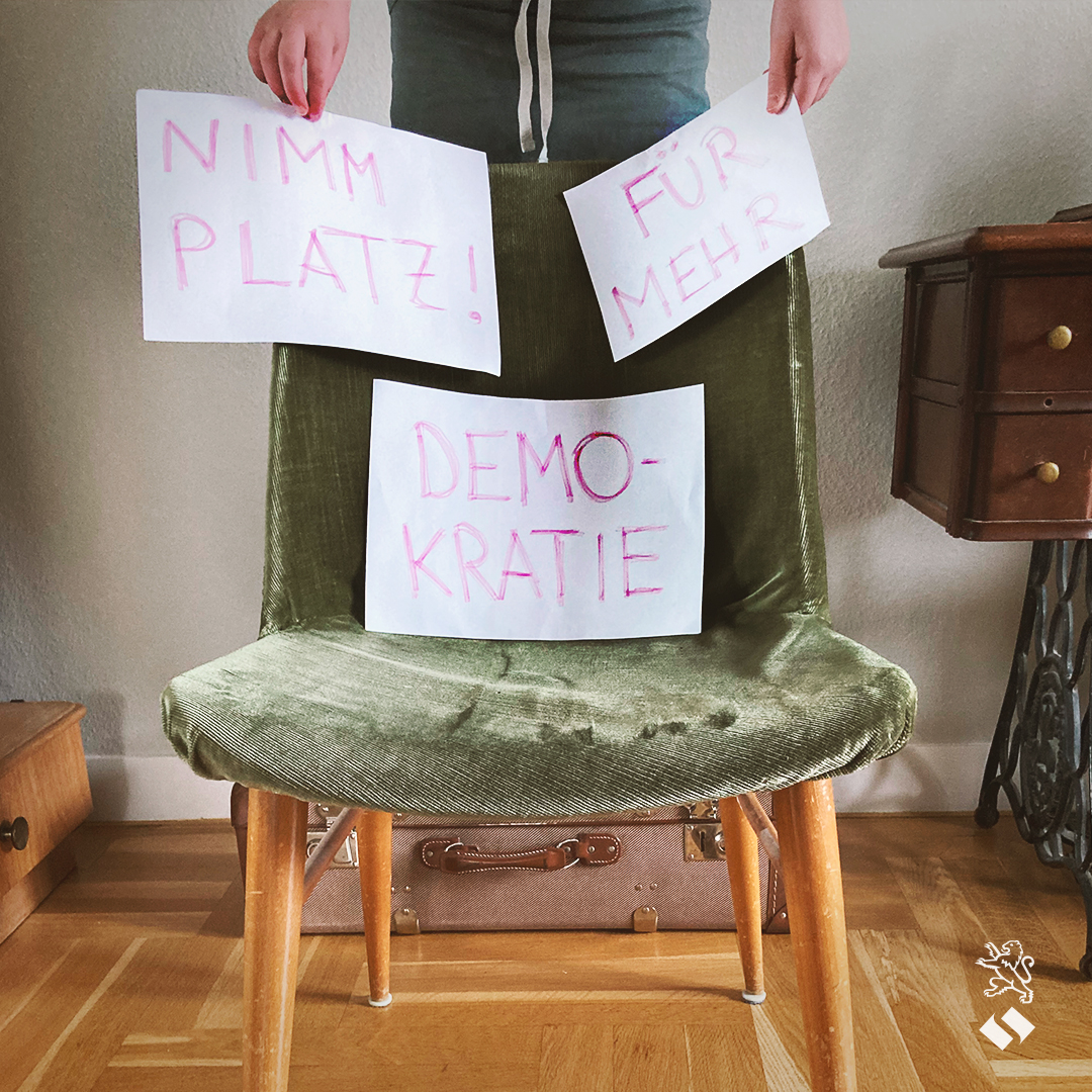Mit einem öffentlichen Aufruf werden für die Aktion gebrauchte Stühle gesammelt. Sie werden jeweils ein Schild „Platz nehmen für Demokratie“ tragen, mitgeliefert wird zudem eine kurze „Gebrauchsanweisung“ mit möglichen Gesprächseinstiegen, Diskursregeln und weiteren Informationen. Die Stühle oder Sitzgruppen können in koordinierten Aktionen oder in Eigenregie in Unternehmen, Schulen oder Projekten gemeinsam bunt gestaltet oder auch mit Sprüchen, Wörtern und Bildern gegen Rassismus und für Vielfalt und Demokratie bestückt werden. Die Kampagne ist offen für verschiedenste Inhalte und Themen, sie setzt ein Format bzw. einen Raum, den Institutionen in vielfältigsten Settings aktiv nutzen können. Zudem ist eine Online-Plattform geplant, auf der weitere Aktivitäten der beteiligten Institutionen sichtbar gemacht werden können.