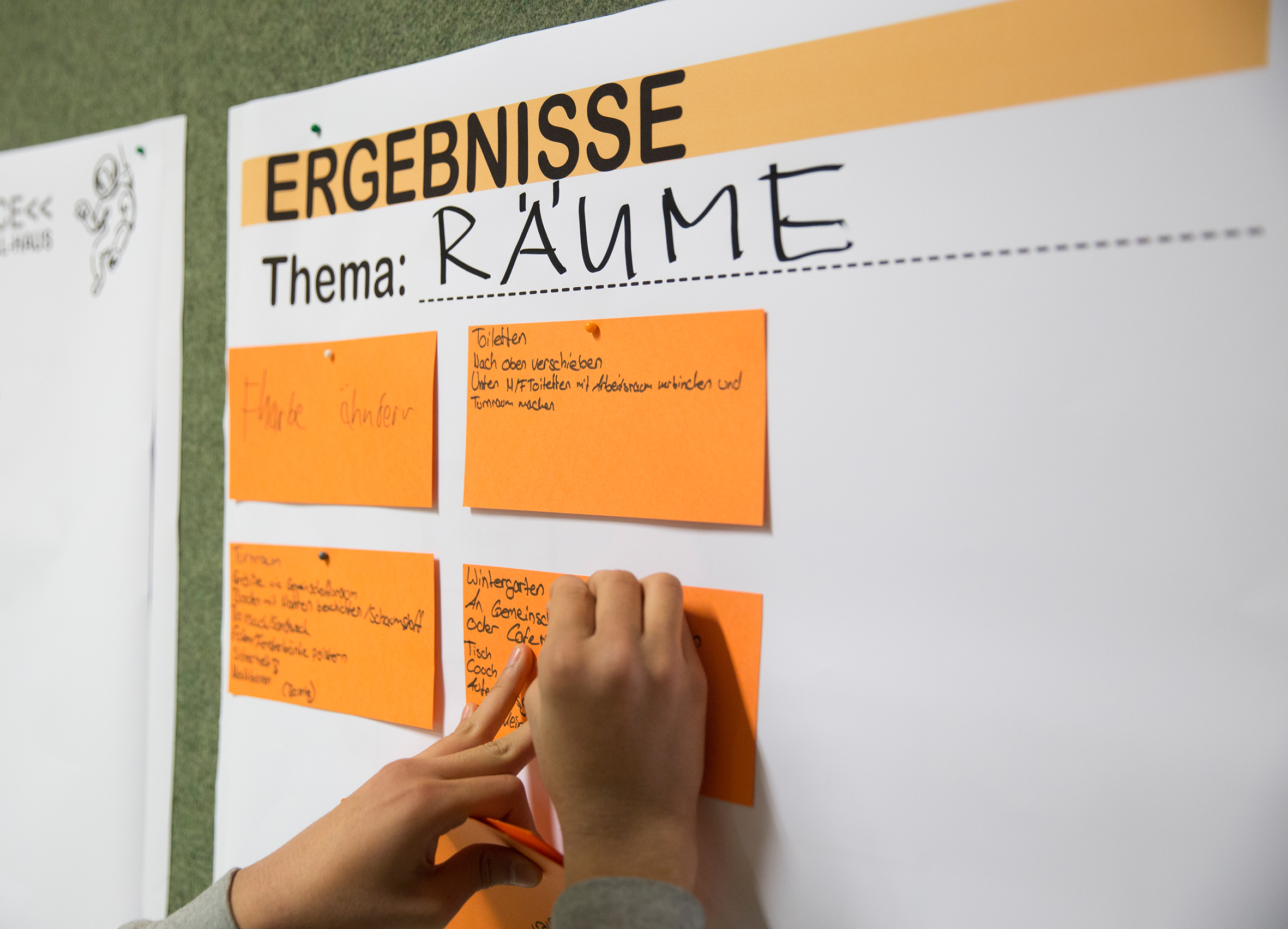 Neben gestalterischen Maßnahmen zielten die Anregungen der Kinder besonders auf neue Spiel- und Beschäftigungsmöglichkeiten sowie auf die Herstellung von Aufenthaltsqualität im und rund um das Haus ab. Vorschläge waren zum Beispiel ein Toberaum, der mit Kissen und Matratzen ausgestattet sein soll, sowie ein Sing- und Tanzraum. „Wichtig war den Kindern, dass es neben einem ,Mädchenraum‘ zukünftig auch einen ,Jungsraum‘ gibt. Aber auch Ansätze wie eine Rampe für Rollstühle und Kinderwägen wurden nicht vernachlässigt“, sagt Annette Spielmeyer, Mitarbeiterin des Bauamts der Stadt Kassel. Die älteren wünschten sich eine größere Küche für das gemeinsame Kochen. An den Gemeinschaftsraum könnte man einen Wintergarten oder ein Café anschließen, so eine weitere Idee zur Förderung der Gemeinschaft. Annette Spielmeyer: „Ich bin begeistert von den Anregungen, die uns mitgegeben wurden. Wir werden viele Sachen berücksichtigen und mit in die Machbarkeitsstudie aufnehmen.“